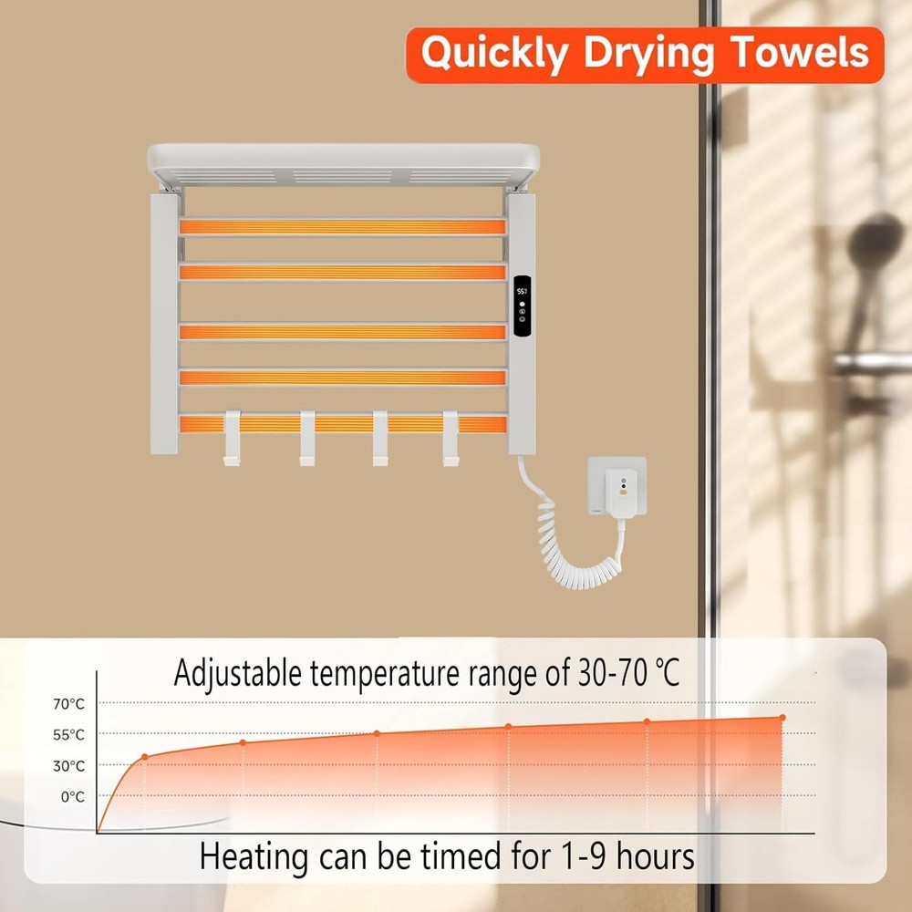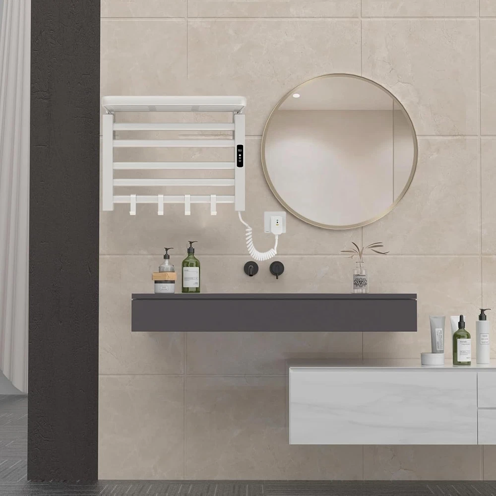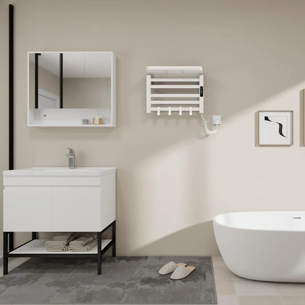 This heated towel rack is a game-changer for my bathroom! The sleek white design looks modern, and it warms up quickly, keeping towels cozy and dry. The IPX5 waterproof rating gives me peace of mind, and the sturdy aluminum build feels high-quality. Installation was straightforward, and the thermostat keeps the temperature just right without wasting energy. Highly recommend for a spa-like upgrade!