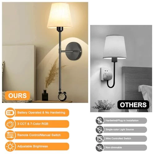 【Battery Operated Wall Sconces】 Wall sconces set of two battery operated comes with two 300 lumen, 6000 mAh E26 rechargeable bulbs. Wall sconce bulb Use Android USB charging cable to charge(Including charging cable), 6000mAh battery for lighting time reaches 25-70 hours (No wiring install) 【RGB Wall Scones】Our Battery powered wall scones let you customize your lighting like a painter with their palette. Each wall sconce offers 7 RGB colors and dynamic modes, as well as 3 color temperatures to choose from,you can choose your favorite colors for different occasions and moods. Rechargeable, includes USB charging cable (Type-C) 【Wireless Remote Control and Battery Run】Battery-operated Wall sconce remote control dimmable brightness (10%-100) and color temperature (2700K-6500K) 【Easy to Install】Wireless Wall Sconce, Indoor battery operated wall lights require no wiring and electrician, includes all mounting hardware for quick and easy installation of battery wall sconce, Battery wall light fixture with bulb and remote control included. These sconces are invaluable for power outages 【Wide Applications】Modern style and simple design of the battery operated wall light fixtures create a comfortable and warm atmosphere, these wireless wall lights perfect for bedroom reading lights and seamlessly fit into your living room, office, vanity, or even dark areas like hallways, closets, and corridors