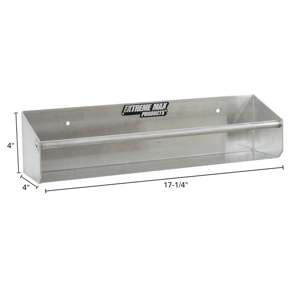 About this item Keeps your garage or enclosed trailer organized by providing a handy storage shelf and hanger Sidewalls and hanging rail hold items in place, even during travel Shelf is perfectly sized for storing aerosol cans, quart-sized liquid jugs, and more Use the hanger bar for keeping tie down straps neat, or hanging other items, such as clothing Heavy-duty aluminum construction with a clean, attractive finish
