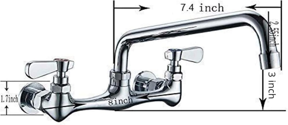 Commercial Kitchen Faucet Wall Mount with 8 Inch Swivel Spout 8" Center Sink 2-Handle Faucet Mixer Tap Polish Chrome,4353 【Kitchen Faucet】Commercial Sink Faucets Workable for Backsplash or Wall Mount,it can be installed into the wall water supply or backflash installation to the stainless steel sink, all installation kits are included in the package. 【Easy Control】 The faucet features a dual temperature lever handles and a double O-ring 7 inch swing spout which rotates 360 degree. The dual handles can direct hot or cold water to anywhere you desire. 【Great Design】Professional designers and unique design quality kitchen faucet will be a highlight of your kitchen. 【High Quality】Heavy duty brass construction with superior rust-resistant polished chrome finished; increasing the service life one times. 【Installation】8-inch Adjustable Center: suit any size of your commercial sink.