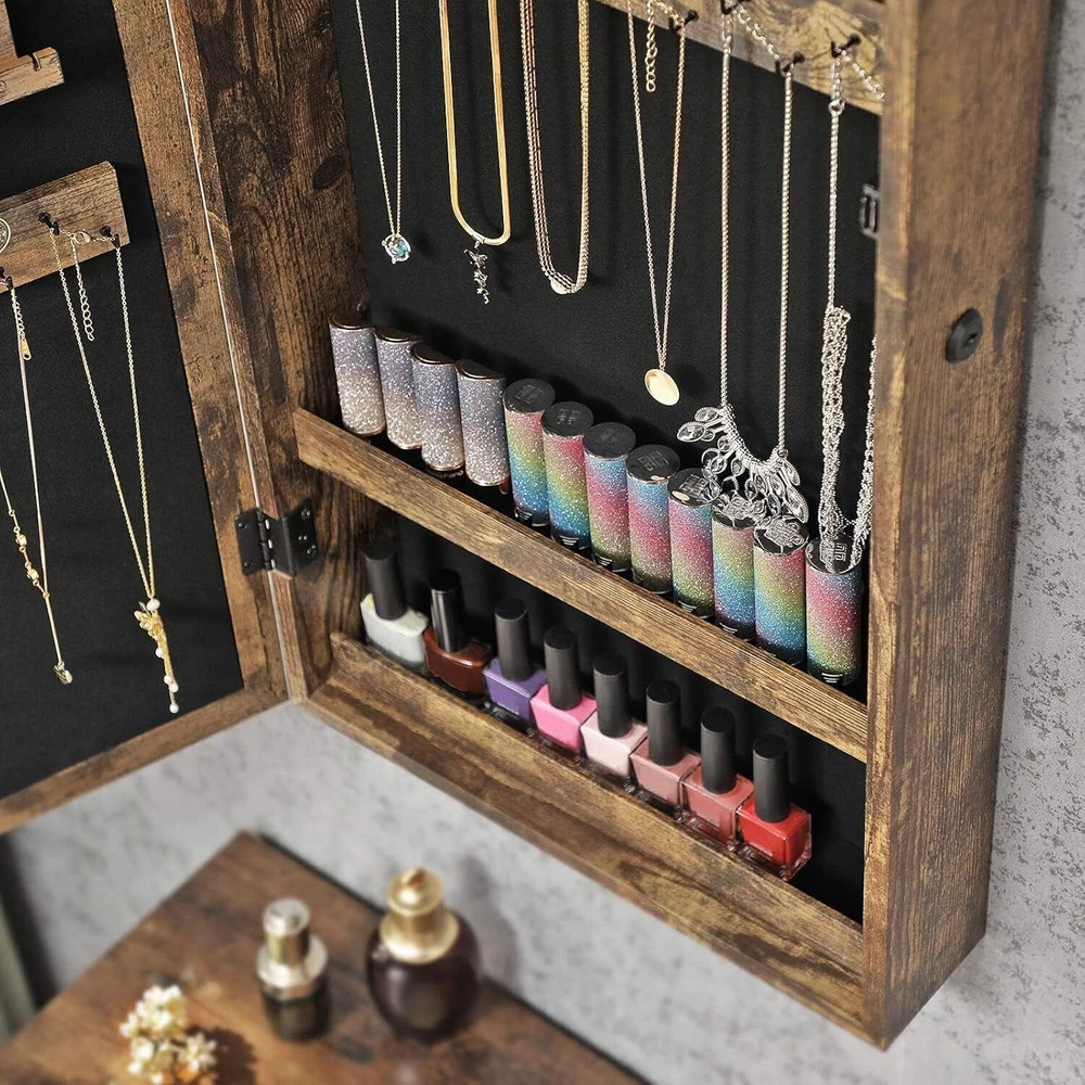 Product Description Earring Storage Keep your earrings and studs in pairs and in order for you to fetch them easily. Sturdy and Durable This jewelry cabinet crafted with MDF will serve your beauty routine for years. Lockable The lockable cabinet with two keys allows you to store your accessories safely. Installation Holes They help you easily hang the jewelry cabinet with mirror on the wall. A Must-Have for Your Beauty Routine: Before work or a fun night out, isn't it great to have a place where you can get ready? Stylish and practical, this SONGMICS jewelry armoire is perfect for you! Small Jewelry Cabinet for Flexibility: With the size of 3.9''D x 14.6''W x 26.4''H, the small jewelry cabinet takes up a little space. It can be mounted anywhere in your home, hallway, bathroom, and bedroom, etc. Organize Your Jewelry in One Place: Open the mirrored door to reveal a spacious area for your gems and jewels. Clear partition enables you to see your frequently used items at a glance, making daily dressing up a quick process. Specifications: Color: White Material: MDF (Medium Density Fiberboard), Glass Mirror, Velvet Lining Product Size: 3.9''D x 14.6''W x 26.4''H (10 x 37 x 67 cm) Product Weight: 11.5 lb (5.2 kg)