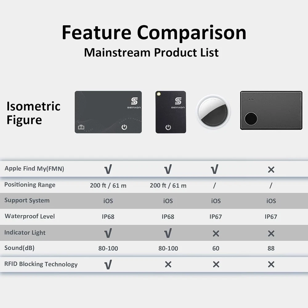 RFID BLOCKING CARD Our item finder Card are capable of more than just location tracking! It is also equipped with RFID functionality.Protects credit cards & other Smart Cards. The card is lined with an electromagnetically opaque shield to block signals from high-tech pickpockets & unauthorized electronic scanning devices. FAR AWAY LOCATION Access to Apple Ecosystem and locate the tracker through Find My network. Once the SEINXON card has been added to the Find My App, it can upload its final location to Find My network from any nearby Apple device.Then you can check its exact location on your cell phone. SEEKING NEARBY Bluetooth 5.0 ensures that the card has plenty of connectivity range with your phone, and the Find My APP allows you to directly manipulate the card to play sounds and flash indicators. The card produces a beeping sound of 80-100dB, enough for you to easily spot it indoors or outdoors! REJECTION OF DISPOSABLE This item finder can be charged using the included charging clip. It can last up to six months on a full charge. No need to replace the entire card or buy a new one, charge as you go!Reduce waste pollution and support ecological conservation. WATERPROOF & DURABLE Our bluetooth tracker is not made with a waterproof coating, nor is it a combination assembly plastic. We use the compression molding process, which makes the product combine as a whole to achieve the highest IP68 waterproof and dustproof in its class; this process makes the product rugged and durable, together with the rechargeable continuation of the battery life, it can be used for a long time.