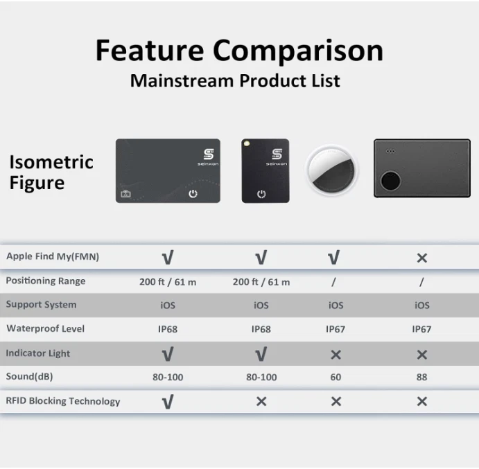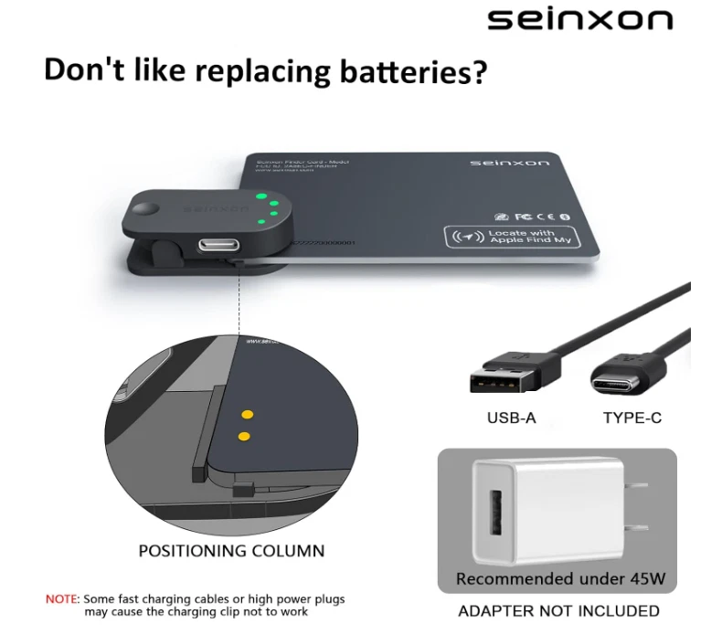 Rechargeable Wallet Tracker RFID Blocking Card IP68 Item Finder Works with Apple Find My APP & Network with Recharge Clip (iOS Only) About this item RFID BLOCKING CARD Our item finder Card are capable of more than just location tracking! It is also equipped with RFID functionality.Protects credit cards & other Smart Cards. The card is lined with an electromagnetically opaque shield to block signals from high-tech pickpockets & unauthorized electronic scanning devices. FAR AWAY LOCATION Access to Apple Ecosystem and locate the tracker through Find My network. Once the SEINXON card has been added to the Find My App, it can upload its final location to Find My network from any nearby Apple device.Then you can check its exact location on your cell phone. SEEKING NEARBY Bluetooth 5.0 ensures that the card has plenty of connectivity range with your phone, and the Find My APP allows you to directly manipulate the card to play sounds and flash indicators. The card produces a beeping sound of 80-100dB, enough for you to easily spot it indoors or outdoors! REJECTION OF DISPOSABLE This item finder can be charged using the included charging clip. It can last up to six months on a full charge. No need to replace the entire card or buy a new one, charge as you go!Reduce waste pollution and support ecological conservation. WATERPROOF & DURABLE Our bluetooth tracker is not made with a waterproof coating, nor is it a combination assembly plastic. We use the compression molding process, which makes the product combine as a whole to achieve the highest IP68 waterproof and dustproof in its class; this process makes the product rugged and durable, together with the rechargeable continuation of the battery life, it can be used for a long time. Product information Product Dimensions 3.37 x 2.13 x 0.07 inches Item Weight 2.36 ounces Connectivity technologies Bluetooth Other display features Wireless Color grey Manufacturer SEINXON . We offer FREE shipping on all orders! . We ship within Five business days of payment, usually sooner. . We use a selection of shipping services such as UPS, FedEx, USPS etc. . We only ship to the lower 48 states, no APO/FPO addresses or PO Boxes allowed. . Local pickups and combined shipping options are not provided at this time. . Your satisfaction is a wonderful reward for our efforts. Please assist us by leaving a positive review if you feel pleased with our service. . In the event that you encounter any difficulties related to your order, please do not hesitate to reach out to us directly through the Messaging system on the Ebay platform. Kindly consider opening a COMPLAINT or a RETURN REQUEST as a last resort, only after all other possible measures have been attempted and we have been unable to provide you with assistance. . We will get in touch with you within 24 hours and make every effort to ensure your satisfaction. . Please rest assured of our service quality.