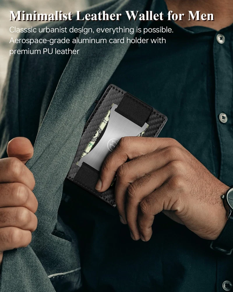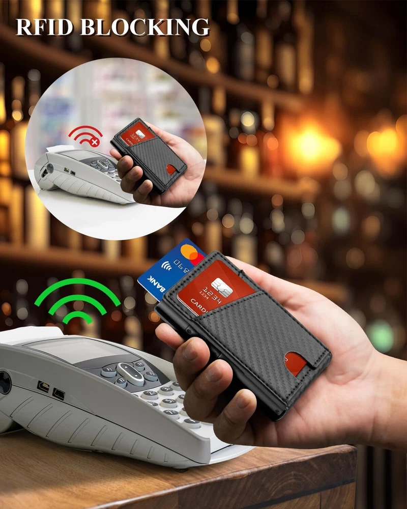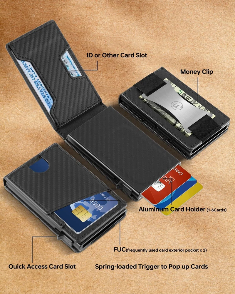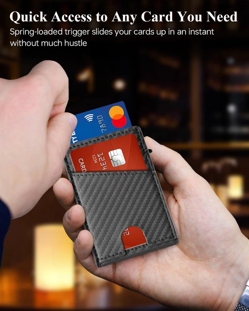 Slim Wallet for Men - Leather Minimalist Credit Card Holder, ID Window, Smart Wallet with RFID Blocking, Front Pocket, Cash Slot, Money Clip 【Slim and Practical】 The slim wallet is carefully designed to fit easily into your front pocket or other pocket. Our wallet features an ID card holder slot that allows you to conveniently swipe cards without removing them. It's perfect for holding ID cards, work cards, access cards, and more. 【RFID Blocking Wallet】 The RFID blocking wallet is equipped with advanced RFID chip technology to prevent our credit cards, debit cards and driver's licenses from being attacked by unidentified scanning devices, ensuring the safety of our personal information and property, to protect your private property at most. 【Large Capacity for 10-12 Cards】 The pop up wallet for men holds up to 10-12 cards and 10 bills in total. The pop-up aluminum card holder stores 6 cards, the additional 4 card slots can store 4 frequently used cards, and the ID window is perfect for driver's licenses. The money clip on the inside of the card holder allows you to securely hold folded bills. 【Elegantly Gift-Boxed】 Comes in classy gift box packaging. It is the best choice for popular slim wallets for women and men, Perfect gift for your father, husband, son or for yourself at Christmas, Birthday, Wedding Anniversary, Father's Day. 【Quality Service】Trust in the quality of our slim wallet and enjoy exceptional service. We are committed to providing complete customer satisfaction with our prompt and efficient support. If for any reason you're unsatisfied, please don't hesitate to contact us. We will respond within 24 hours and make sure to make things right for you