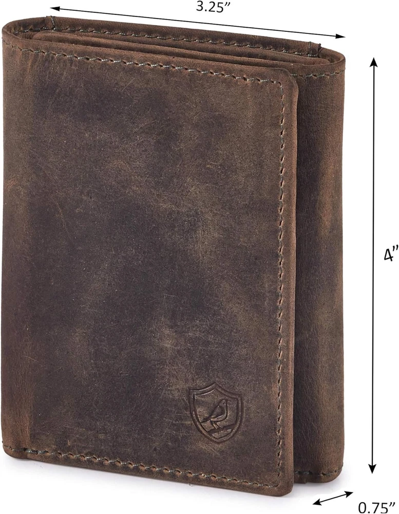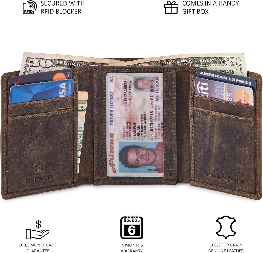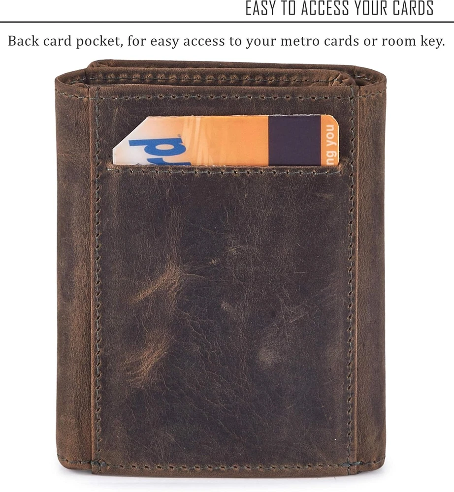 Wallet for Men Trifold Real Leather RFID Blocking Credit Card Case MOSS GREEN Product Details Package Dimensions : 5 x 4 x 0.7 inches; 6.35 ounces Department : mens This wallet is made from top grain genuine leather and its beauty enhances with use, which is a typical characteristic of genuine leather. This product comes in a variety of colors and finishes, and you can choose the ones which suits you the best. The hand touch of this wallet is smooth and natural, which is why you will always love holding it in your hands for that premium touch.