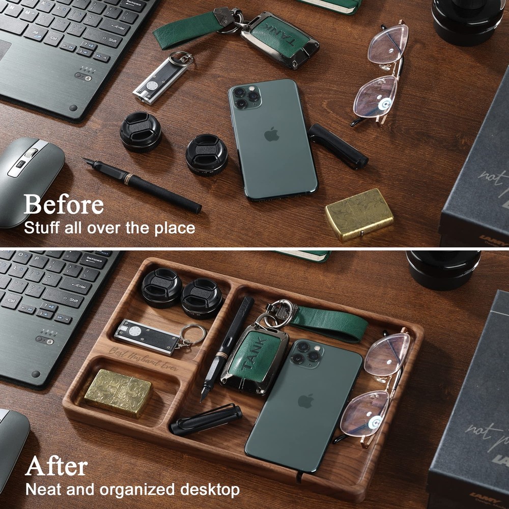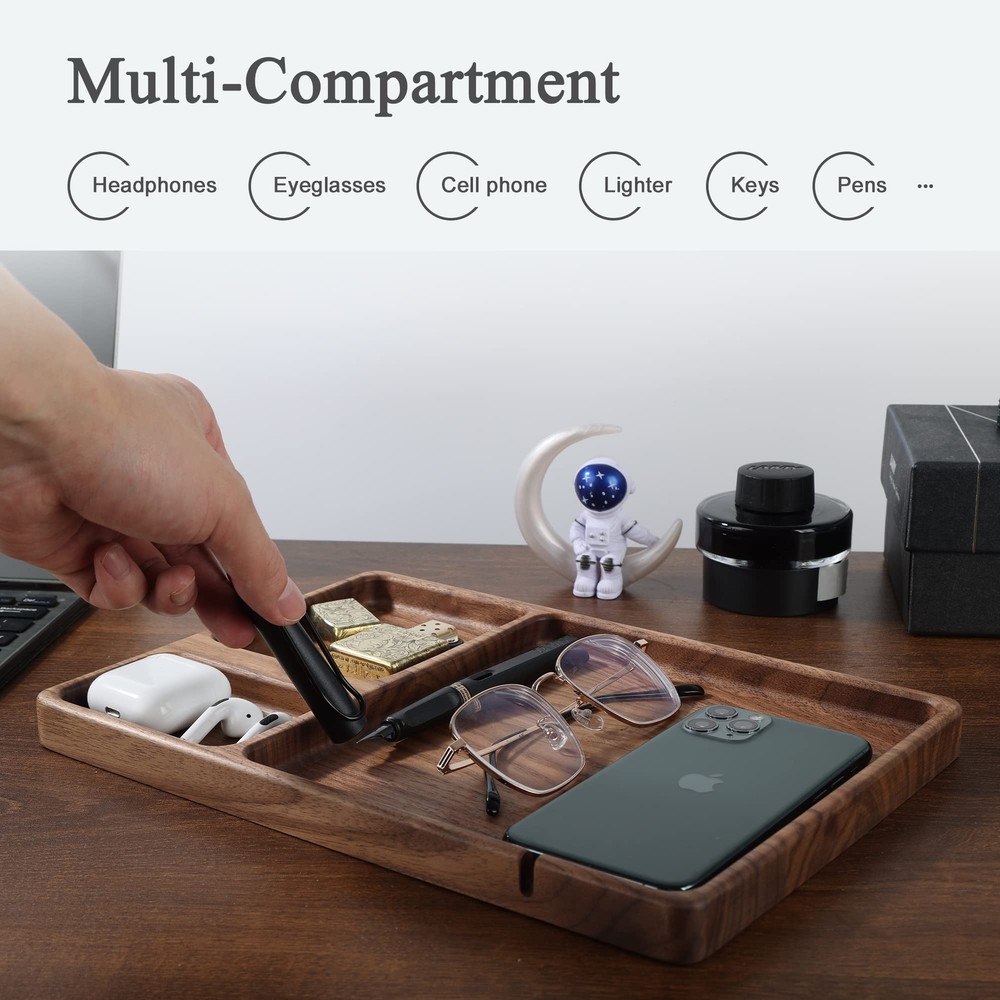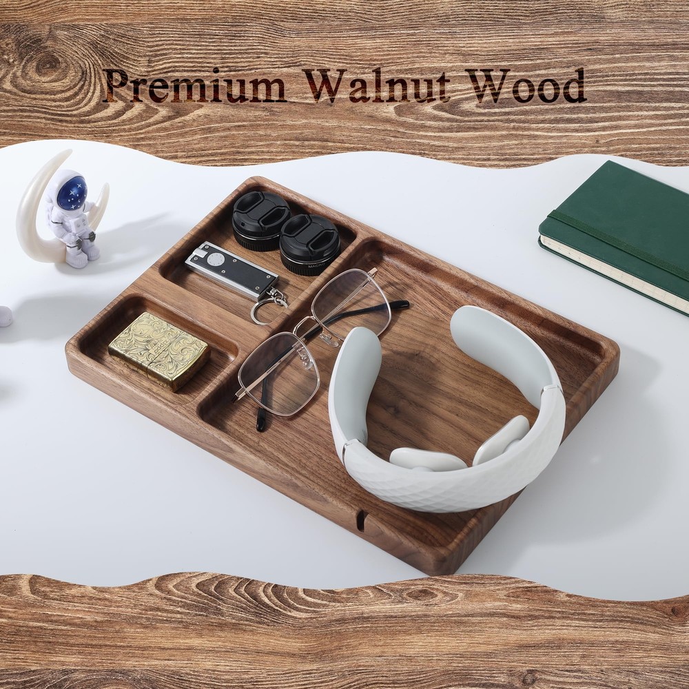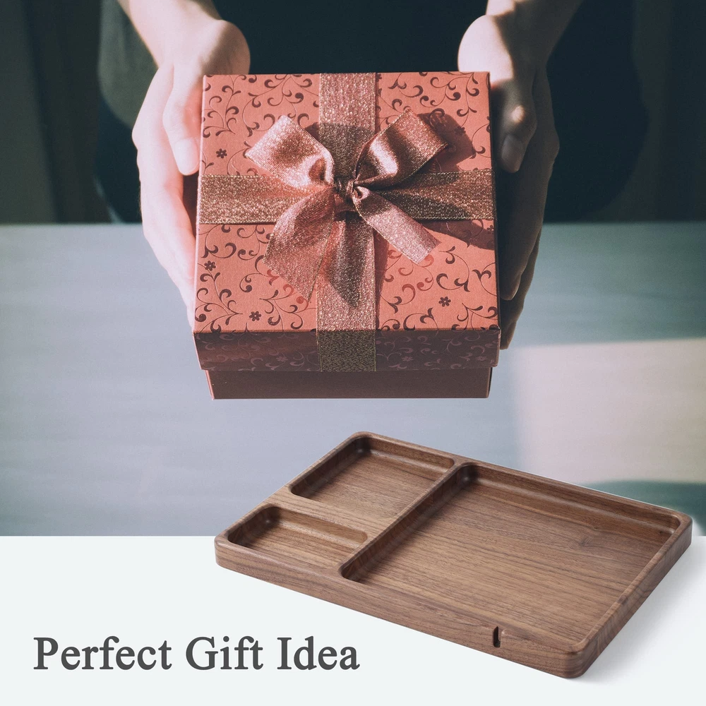 Versatile Organization: Valet tray is the perfect choice for bedside table or entryway console table. It can hold items such as phones, keys, glasses, wallet, and more. Keep your life organized and make your daily routines more convenient and orderly Richly Textured Walnut Wood: Crafted from elegant walnut wood, The delicate texture brings a natural beauty and unique texture to the accessories organizer tray. this walnut edc tray adds a touch of elegant to any space Charging Slot: The slot can secure the charging cable, allowing you to easily find and quickly connect it when you need to charge your device. Enjoy the convenience of a neat and organized desk Smooth Lines: We have meticulously polished the edges of the tray to showcase smooth, rounded lines. This design not only enhances its visual appeal but also adds to the comfort of use Perfect Gift Idea: Edc tray is a unique and thoughtful gift, perfect for presenting to your loved ones on various special occasions, Whether it's Mother's Day, Father's Day, Valentine's Day, or Christmas