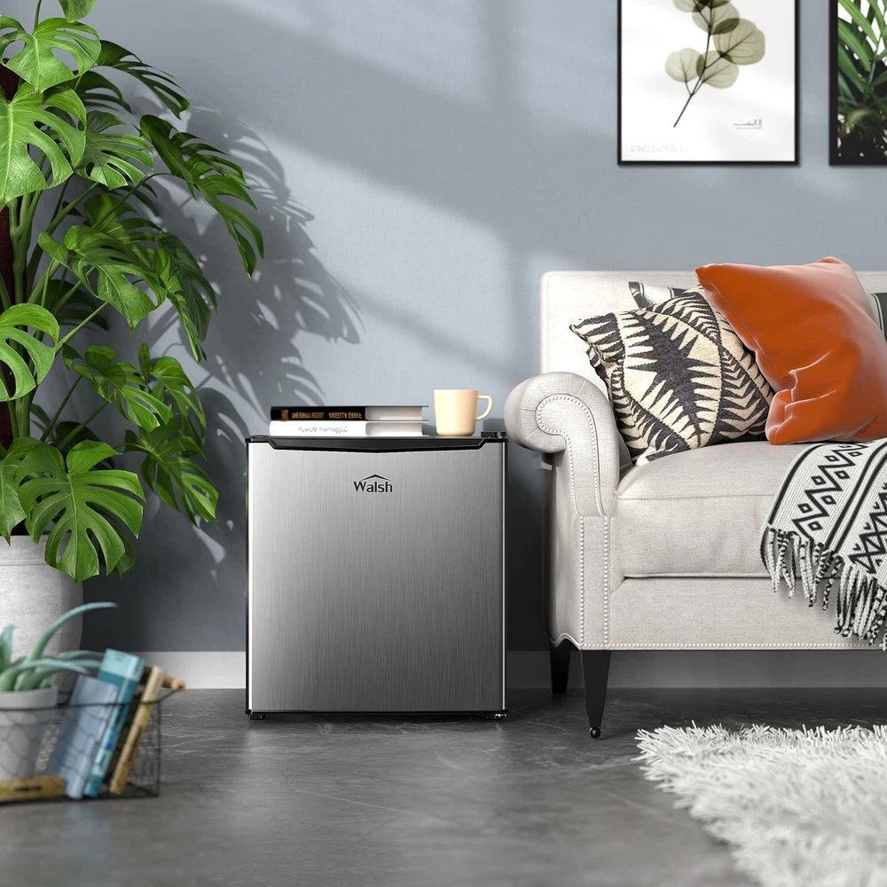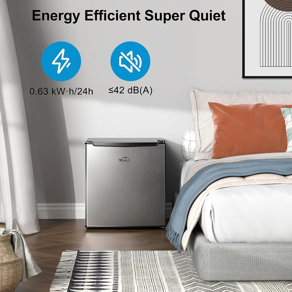 Walsh Compact Refrigerator, Single Door Mini Fridge, Energy Efficient, Adjustable Mechanical Thermostat with Chiller, Reversible Doors and Leveling Front Legs, 1.7 Cu Ft., Stainless Steel Compact & stylish This space saving refrigerator (17.48’’ * 19.09’’ * 19.49’’ (W * D *H)) stores food, soda, beer, and other beverages with minimal energy and without taking up too much space. The sleek, modern design refrigerator is perfect for college dorm rooms, offices, garages, home bars.Cooling method:Compressor.Amperage : 0.8 amps Adjustable mechanical thermostat control Walsh refrigerator can be controlled manually with the control dial from cool to cold to coldest, you can turn the knob to set the temperature you want. And the temperature range for refrigerator compartment is 32℉ to 47℉, chiller compartment is 27℉ to 37℉. Reversible doors & leveling front legs Reversible door that can open from left or right, reversible door that can be suitable for different kitchen layout. Leveling legs can adjust feet and keep level placement in anywhere. Energy-saving Compact refrigerator uses R600a high-efficiency and low-energy consumption compressor, it can cool food quickly with lower energy. Product Features Stainless Steel Adjustable Mechanical Thermostat Control 2 Liter Bottle Door Storage Half-Width Chiller Compartment Coated Wire Slide-Out Shelf Reversible Doors 2 Leveling Front Legs Specifications Color: Stainless Steel Capacity: 1.7 Cu.Ft. Voltage: 120Volts/ 60Hz Fresh food Capacity: 1.45 Cu. Ft. Chiller Capacity: 0.18 Cu. Ft. Shipping We offer FREE shipping on all orders! We use a selection of shipping services such as UPS, FedEx, USPS etc. We only ship to the lower 48 states, no APO/FPO addresses or PO Boxes allowed. Local pickups and combined shipping options are not provided at this time. Return You can return a product for up to 30 days from the date you purchased it. Any product you return must be in the same condition you received it and in the original packaging. Please keep the receipt. Payment We accept payment by any of the following methods: PayPal Please pay as soon as possible after winning an auction, as that will allow us to post your item to you sooner! Feedback Customer satisfaction is very important to us. If you have any problem with your order, please contact us and we will do our best to make you satisfied. Contact Us If you have any queries, please contact us via ebay. We usually respond within 24 hours on weekdays. Please visit our eBay store to check out other items for sale! Thank you for shopping at our store.