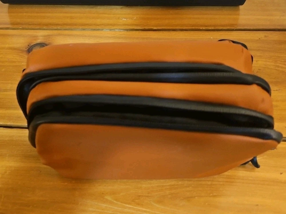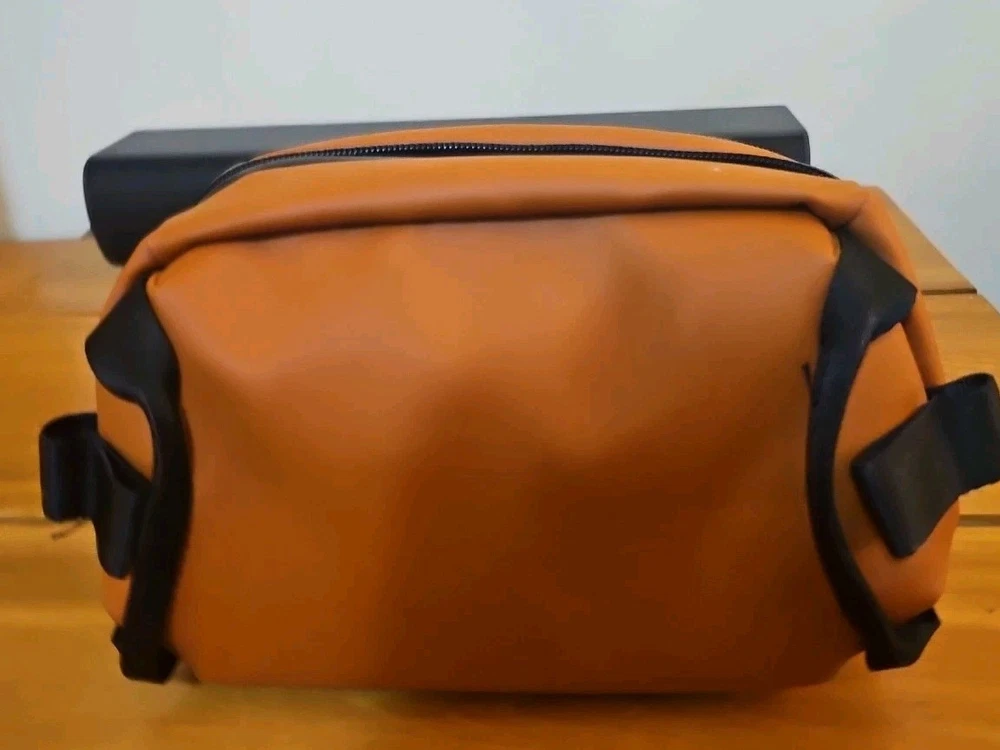 This is a Wandrd Tech Bag in a large size and vibrant orange color. It is a soft case made of leather with features like a belt loop, adjustable straps, washable material, and water resistance. The bag has multiple accessory compartments and is suitable for various types of cameras and camera accessories. It is designed for universal compatibility and is ideal for photographers on the go.