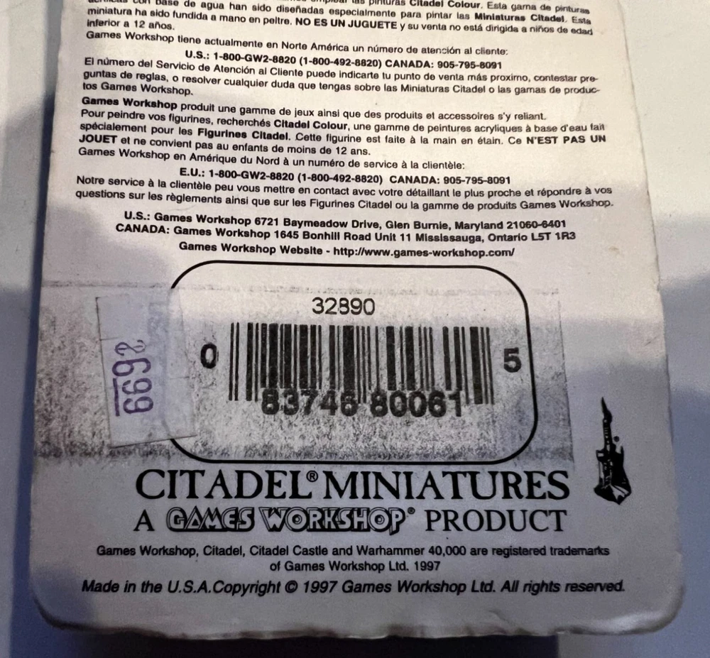 Enhance your Warhammer 40000 miniatures with these vibrant Chaos Space Marine decals. Designed for the Alpha Legion, they add character and detail to your collection. • Alpha Legion themed decals • Vibrant green and yellow designs • Official Games Workshop product • Part number: 136230 • Made in USA, ©1997 Pack is sealed, intact. Outer package is worn with frayed edges and heavy creasing. Free shipping. Professional packaging always, since 2003.