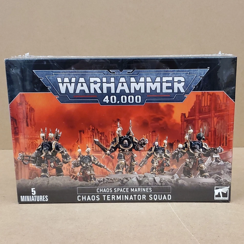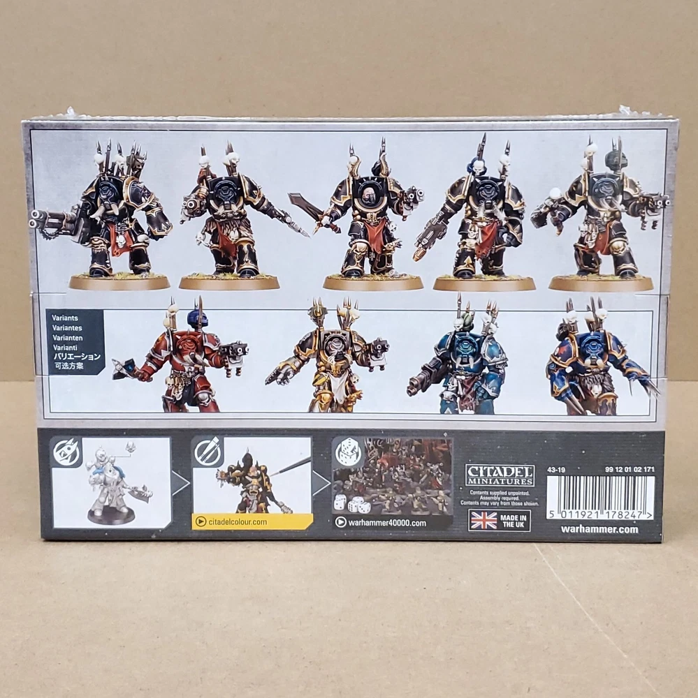 This multipart plastic kit builds a squad of five Chaos Terminators. Each of these hulking warriors is armed with a combi-bolter - two of which can be upgraded to combi-flamers, two into combi-meltas, and one into a combi-plasma gun - and a melee weapon for wading into close combat. The kit includes three power fists, one armour-splitting chainfist, and a variety of accursed weapons in the form of axes, blades, and a maul, as well as two lightning claws that can be worn separately or as a pair. It also offers a pair of heavy weapons to choose from - a heavy flamer, or a long-ranged reaper autocannon. In addition to its huge armoury, this massively customisable kit offers plenty of interchangeable and cosmetic options - including 10 different heads as well as separate trophy racks and shoulder pads. This kit comprises 82 plastic components and comes with 5x Citadel 40mm Round Bases, as well as 1x Chaos Space Marines Transfer Sheet featuring 364 Chaos symbols and Legion markings. These miniatures are supplied unpainted and require assembly - we recommend using Citadel Plastic Glue and Citadel Colour paints.