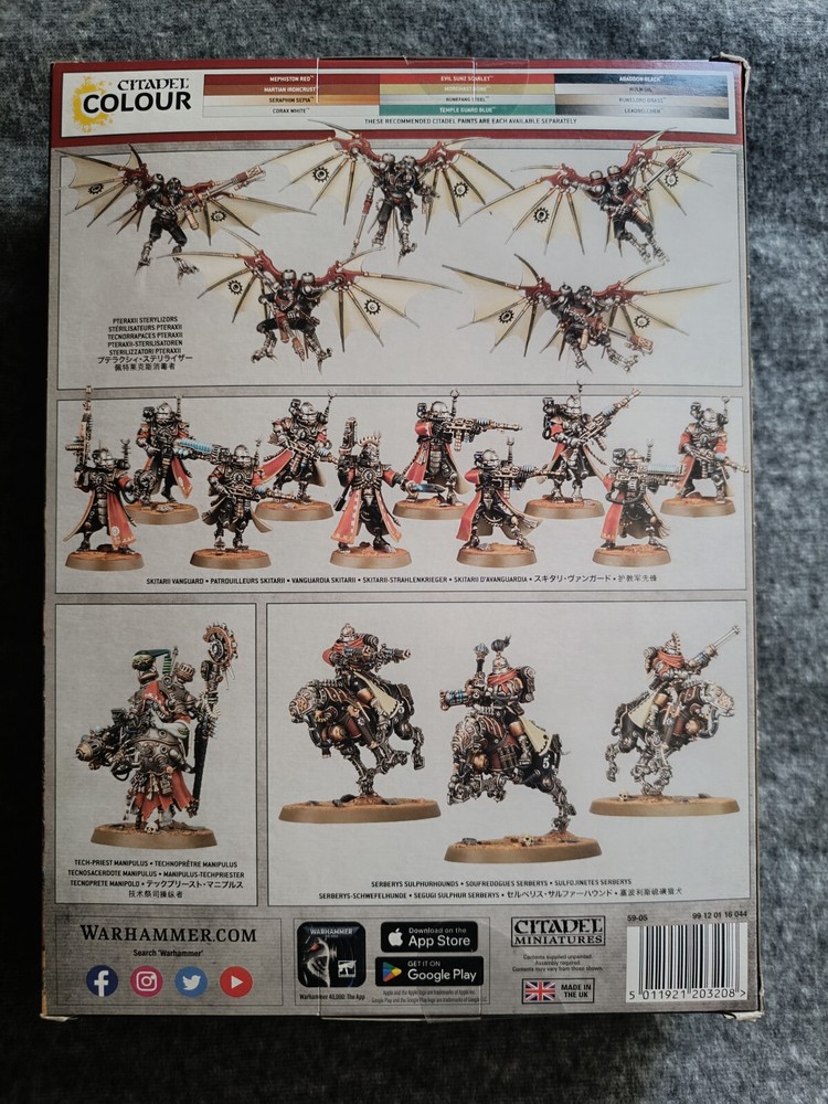 L'Adeptus Mechanicus se rend au combat en fusionnant la chair et la machine: leurs dirigeants Technoprêtres et leurs adeptes cyborgs fanatiques chantent les louanges binhaires du Dieu Machine de leur voix modifiée. Les soldats du Corps de Purge Deltic-9 sont équipés pour éliminer la présence ennemie qui souille les lieux d'importance stratégique ou à explorer. Ils utilisent pour cela leur vitesse cybernétique et des armes terrifiantes. La cavalerie et les Pteraxii ailés déchaînent des torrents de flammes purificatrices avant que les Skitarii radioactifs ne ferment la marche pour porter le coup fatal. Combattez au nom de l'Omnimessie avec la Patrouille: Adeptus Mechanicus! Cette boîte contient toutes les unités dont vous avez besoin pour entamer une armée ou agrandir une collection existante tout en faisant des économies par rapport à un achat des kits au détail. Ces figurines fournissent un noyau rapide et équilibré pour toute armée de l'Adeptus Mechanicus, et peuvent également être utilisées comme force complète pour les parties de Warhammer 40,000 au format Patrouille. Les règles de ce mode de jeu sont disponibles en téléchargement gratuit sur le site de Warhammer Community. Ce set contient les figurines en plastique suivantes: - 1x Technoprêtre Manipulus - 3x Soufredogues Serberys (pouvant autrement être assemblés comme 3x Hussards Serberys) - 5x Stérilisateurs Pteraxii (pouvant autrement être assemblés comme 5x Vautours Pteraxii) - 10x Patrouilleurs Skitarii (pouvant autrement être assemblés comme 10x Rangers Skitarii) Toutes les figurines sont fournies avec leurs socles appropriés. Ces figurines sont fournies non peintes et nécessitent assemblage – nous recommandons d'employer la Colle Plastique Citadel et la peinture Citadel.
