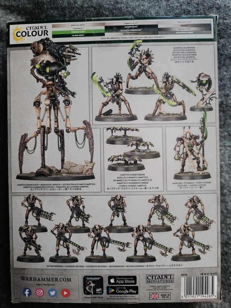 Les Nécrons s'éveillent partout dans la galaxie. Ces légions d'androïdes surgissent de cryptes de stase après des millions d'années de sommeil immortel. La Garde d'Amonhotekh arpente les mondes qui appartenaient jadis à son maître, le Tétrarque Amonhotekh, pour y éliminer les parasites de chair et les civilsations inférieures qui infestent désormais ses territoires antiques. Il ne reculera devant rien pour éradiquer cette vermine et en appelera à de puissantes constructions Canopteks, à des phalanges de guerriers sans âme et même au Culte Destroyer dément pour éliminer tous les intrus. Reconquérez la galaxie avec la Patrouille: Nécrons! Cette boîte contient toutes les unités dont vous avez besoin pour entamer une armée ou agrandir une collection existante, et elle vous permettra de faire des économies par rapport à un achat des kits au détail. Ces figurines vous fournissent un noyau équilibré pour toute armée de Nécrons, et elles peuvent également être utilisées comme force complète pour les parties de Warhammer 40,000 au format Patrouille. Les règles de ce mode de jeu sont disponibles en téléchargement gratuit sur le site de Warhammer Community. Ce set contient les figurines plastique suivantes: - 1x Tétrarque, armé d'une arbalète à tachyons - 1x Maraudeur Canoptek - 3x Destroyers Skorpekh, accompagnés de 1x Plasmacyte - 10x Guerriers Nécrons - 3x Nuées de Scarabées Canopteks Toutes les figurines sont fournies avec leurs socles appropriés. Ces figurines sont fournies non peintes et nécessitent assemblage