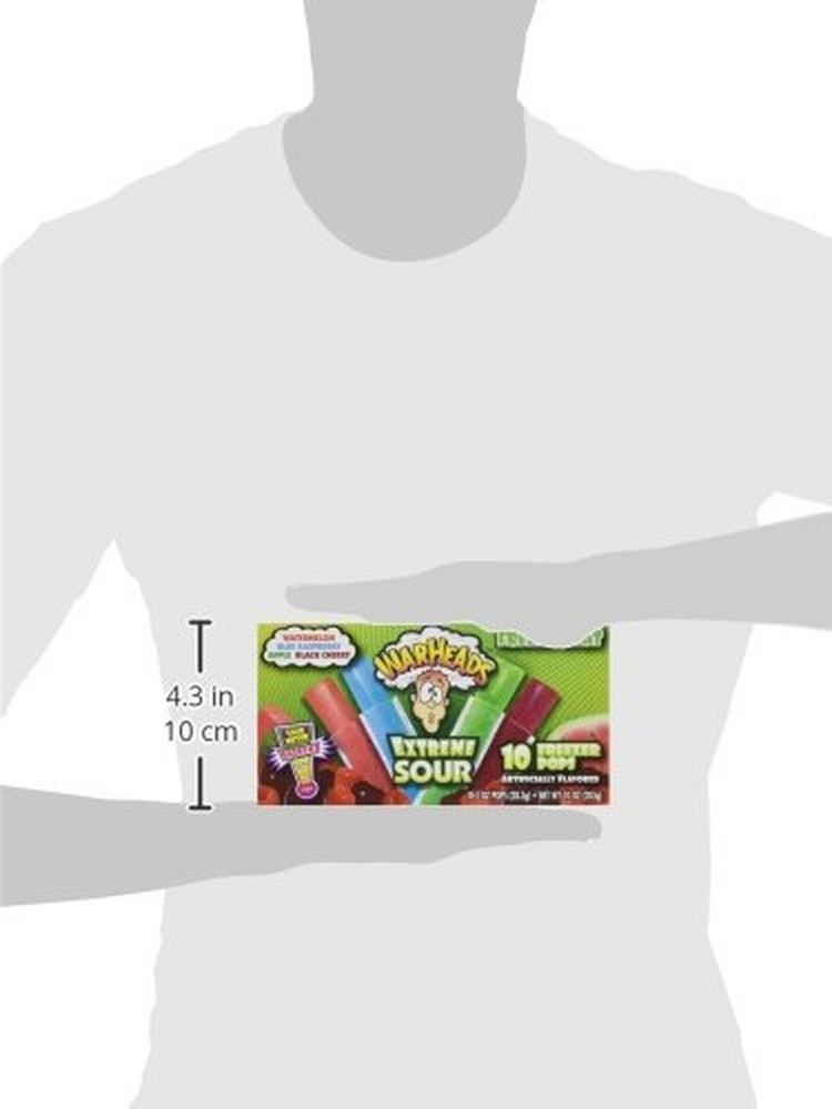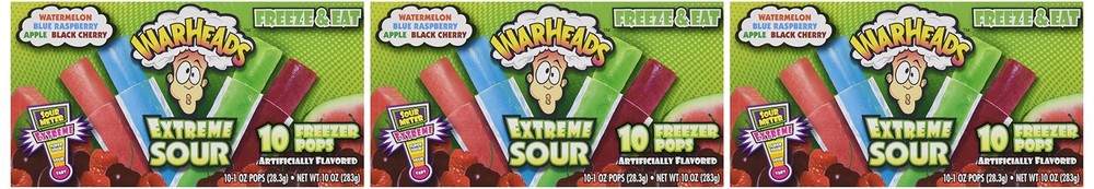 Warheads Extreme Sour 10 Freezer Pops (Pack of 3) Product Details Brand: Warheads Flavor: Apple,Raspberry,Watermelon,Cherry Item Form: Stick Unit Count: 30 Ounce Number of Items: 3 Is Discontinued By Manufacturer : No Package Dimensions : 8.11 x 4.41 x 4.25 inches; 1 ounces Units : 30 Ounce Best Sellers Rank: #86,261 in Grocery & Gourmet Food (See Top 100 in Grocery & Gourmet Food) #110 in Popsicles & Juice Bars #110 in Popsicles & Juice Bars Customer Reviews: 4.3 4.3 out of 5 stars 123 ratings
