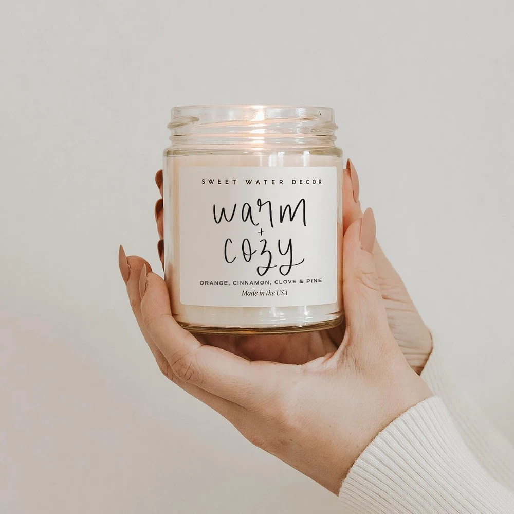 EXPERIENCE LUXURY & WARMTH - Immerse your space in the delightful blend of Orange, Cinnamon, and Pine notes with our Sweet Water Decor Warm and Cozy Candle. Elevate your senses with a burn time of over 40 hours, creating an inviting atmosphere in your home. HAND-POURED SOY CANDLES - Our signature Christmas candles are crafted with care, each cinnamon-scented candle is a testament to quality and sustainability. Enjoy a sensory journey with exclusive fragrances that set us apart. CANDLE CARE & LONGEVITY - Follow our expert cinnamon candle care tips for a perfect burn every time. Trim the wick to 1/4" before lighting, ensuring a clean, soot-free experience. Prevent wax tunneling by allowing the wax pool to reach the jar's edge. With a 9oz clear jar and a gold lid, our candles burn for over 40 hours, providing enduring warmth. SEASONAL VERSATILITY - Perfect for the holiday season and beyond, our Warm and Cozy Winter Candle adds a touch of sophistication to any occasion. From festive gatherings to tranquil moments, experience the magic of our signature warm and cozy orange-scented candle, a harmonious blend of pine, cinnamon, cypress, and fir. STYLISH - Our Sweet Water Decor Candles are not only functional, but stylish! They can blend in with any home decor style from rustic, to modern to farmhouse. They are the perfect home accessory that fits into any Christmas and holiday decor style. Product Description We are your one-stop destination for an extensive selection of encouraging and memorable products. From cozy candles that create the perfect ambiance to stylish mugs that make your morning coffee extra special and even reed diffusers that bring tranquility to your space—our range of high-quality products has something for every moment in your life. Soy Candles for Home Our candles are crafted with premium ingredients and fragrances, ensuring you peace of mind while enhancing the ambiance of your space. Perfect for any setting, you can display them in your kitchen, bathroom, on your dresser, or in your office for enduring, delightful scents. The video showcases the product in use. The video guides you through product setup. The video compares multiple products. The video shows the product being unpacked. Safe & Sustainable Our clean-burning US-grown soy based wax blend is free from gluten, lead, toxins & phthalates. Made in the USA Our handmade candles (over 2 million sold) are blended & poured by our team in Pittsburgh, PA. Crafted with Care From unique premium fragrance oils to giftable vessel options, no detail goes overlooked. Perfect Gift From quote candles to motivational mugs, pens, journals, & more, our products make the perfect gift. Light To Your Life & Home Each product is designed to bring motivation and light into your life and home. 1 Safe & Sustainable 2 Made in the USA 3 Crafted with Care 4 Perfect Gift 5 Light To Your Life & Home 9oz Glass Jar Compare Our Candles 9oz Jar Size in Ounces 11oz Made in the USA Glass Jar Material Frosted Glass 2.75 x 3.5" Size Dimensions 3 x 3.5" 40+ Hours Burn Time 50+ Hours Lid Clear or Amber Available Styles White or Amber 9oz Jar Size in Ounces 12oz Made in the USA Glass Jar Material Ribbed Glass 2.75 x 3.5" Size Dimensions 3.5 x 3.5" 40+ Hours Burn Time 60+ Hours Lid Clear or Amber Available Styles Clear 9oz Jar Size in Ounces 9oz Made in the USA Glass Jar Material Glass 2.75 x 3.5" Size Dimensions 2.75 x 3.5" 40+ Hours Burn Time 40+ Hours Lid Clear or Amber Available Styles 25+ Quotes/Sayings 9oz Jar Size in Ounces 12oz Made in the USA Glass Jar Material Stoneware 2.75 x 3.5" Size Dimensions 3.5 x 4" 40+ Hours Burn Time 60+ Hours Lid Clear or Amber Available Styles Black or Cream 11oz White Jar 12oz Ribbed Jar 9oz Quote Jar 12oz Black Stoneware The Perfect Match to Our Candles Trays Styling trays complete the look when pairing our candles, care kits, matches, and more. Matches With a variety of styles, we have a perfect match to pair with our candles. Candle Care Kits Proper candle care is essential to the longevity of every candle. Elevating life's moments with thoughtful gifts and neutral home decor We strive to be your ultimate destination for exquisite gifts and versatile home decor that enhance life's special moments. At Sweet Water Decor, we embrace the art of beautifully crafted items, ensuring every occasion becomes unforgettable. Whether you're in search of the perfect gift or simply looking to elevate your living space, we have something special for you. Our Story: Sweet Water Decor was born from a passion for design and a mission to spread joy through meticulously crafted pieces. Our journey started with a dream to inspire and uplift, and that vision remains at the heart of our brand. The Sweet Water Decor Experience: Explore our products and you'll uncover a curated selection of gifts and home decor that resonate with the essence of life's various occasions. Whether it's a birthday, anniversary, graduation, or a heartfelt gesture to express love and appreciation, our items are designed to capture the sentiment perfectly. Transform your spaces - bedroom, living room, bathroom, kitchen, and more - with our perfectly curated items that mix and match to complement each other for all decor styling preferences. Gifts for anyone (even yourself.): Discover our thoughtful gifts tailored for any occasion, each crafted to blend style, utility, and sophistication seamlessly. Our collection speaks to the unique personalities of the remarkable individuals in your life. Need a gift for your mom, dad, brother, sister, friend, coworker, or special occasion? We've got you covered. Quality and Craftsmanship: At Sweet Water Decor, we take immense pride in our unwavering commitment to quality and craftsmanship. Every item is painstakingly handcrafted with meticulous attention to detail, ensuring that your gift is not only beautiful but also built to withstand the test of time. Our Promise: When you choose Sweet Water Decor, you're not just acquir