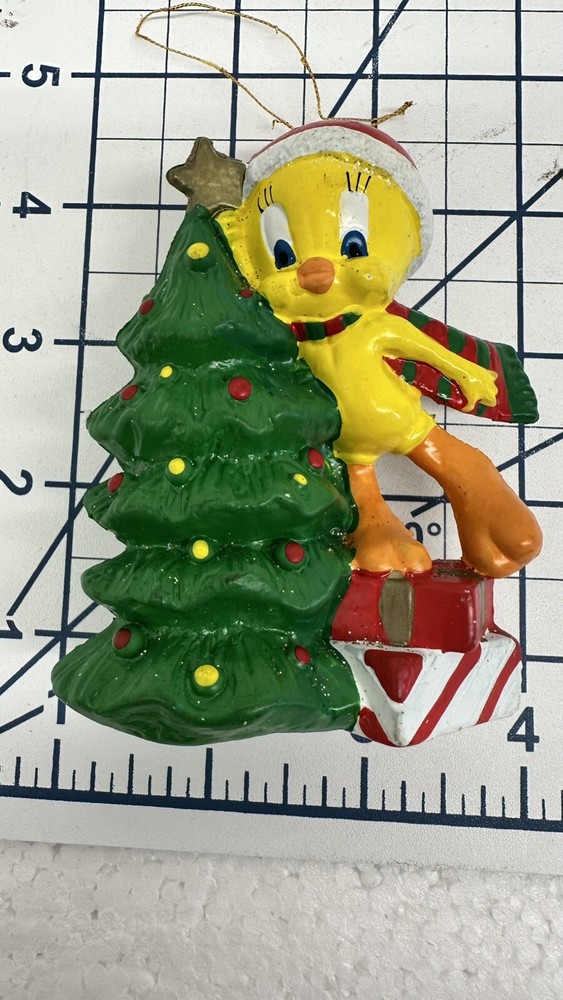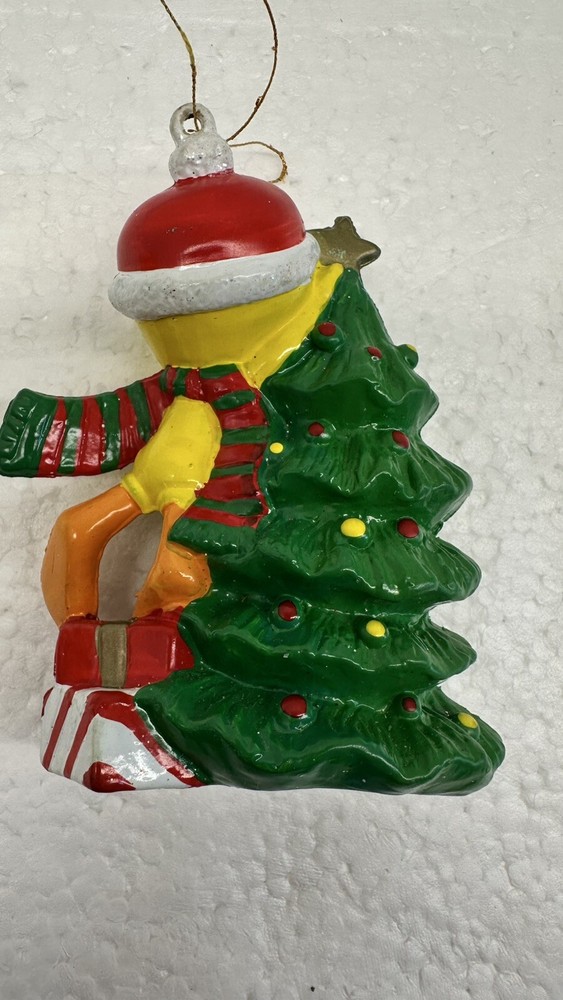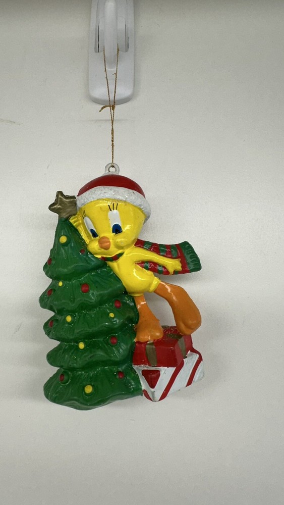 Celebrate the holidays with this vintage 2000 Christmas ornament featuring the beloved Looney Tunes character, Tweety Bird, wearing a festive Santa hat and perched on a tree. The multicolored ornament is perfect for any Looney Tunes fan and adds a touch of holiday cheer to your decor. Crafted with care and attention to detail, this small ornament is made of high-quality materials and features a hanging feature for easy placement. Whether you're a collector or just looking for a unique holiday decoration, this Looney Tunes ornament is sure to delight. Add it to your collection today!
