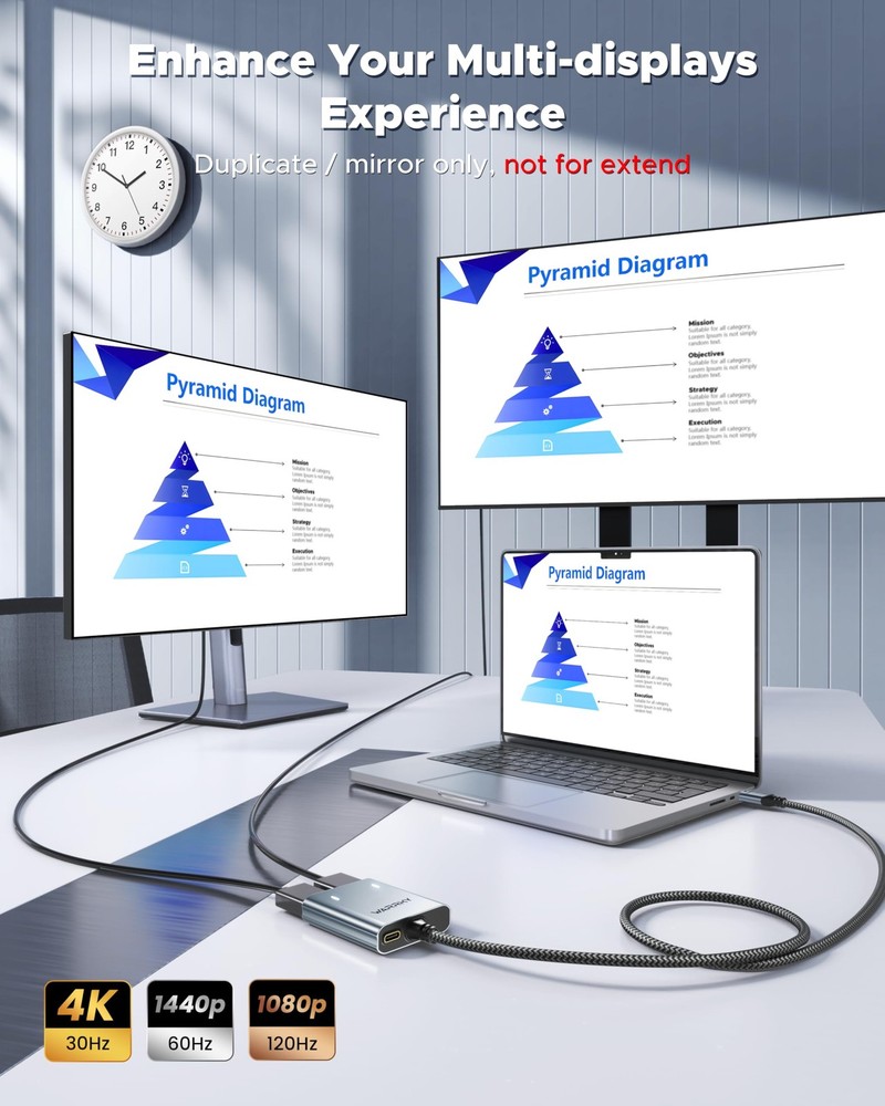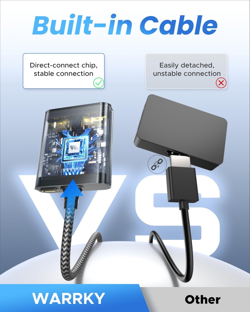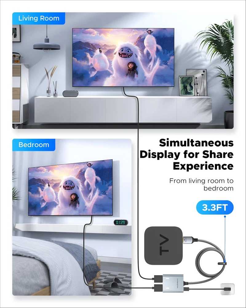 (ONLY MIRROR the same content on 2 displays, NOT EXTEND different content on 2 monitors for computer) Package includes: 1 x 4K HDMI Splitter, 1 x USB-C power cable, and 1 x User Guide. [HDMI Splitter 1 in 2 out] Please be noted that this HDMI Splitter does not support extend mode, only support mirror mode. Duplicate 4K HDMI signals from a single source to two HDMI displays, with synchronized video and audio. Ideal for enjoying TV shows in different rooms using only one TV box or more dual-screen setups! (Mirror/Duplicate mode only.) [USB-C Powered for Stable Performance] This HDMI amplifier splitter supports up to 66ft HDMI cable, significantly outperforming the average standard. The included USB-C power cable can be connected to any USB-A device to provide stable performance for Apple products, PS4, or TV boxes. No need for a separate charger. Compact size: 2.1 x 1.8 x 0.5 inches (L x W x H). Weight: 3.8 oz. NOTE: Please power the HDMI Splitter before connecting other HDMI devices. [Mirror the Same 4K Contents to 2 Screens] This HDMI duplicator support up to UHD 4K@30Hz, QHD 2K@60Hz and FHD 1080P@120Hz. Backward compatible with 480i@60Hz/480p@60Hz/576i@50Hz/576p@50Hz/720p@60Hz/1080i@60Hz/1080p@60Hz. Compliant with HDCP 1.4. Support audio format: DTS-HD/Dobly-true HD/LPCM7.1/DTS/Dobly-AC3/DSD/HD(HBR). ONLY support 4K@60Hz in YCbCr. NOT support CEC, HDR, and VRR. [Full Metal Casing for Durability] Both ends are covered by aluminum alloy case. Hard to break. Gold-plated HDMI male and female connectors maximize conductivity. Nylon braided cable, never rupture. Ergonomic curve design, easier to grip. Comes with a 3.3ft HDMI Cable, which save you an extra one. [What's in the Package?] Inside the package, you'll find a 4K HDMI Splitter, a USB-C power cable, and a user guide. All WARRKY products are backed by online support team. If you have any questions regarding this dual hdmi adapter, please consult for fast and responsible support within 18hrs!