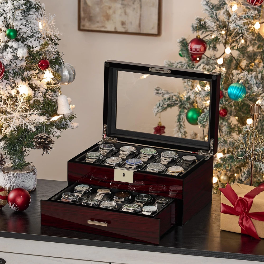 20 SLOT WATCH DISPLAY CASE: Watch box size: 11.9 "L x 8" W x 6 "H (30.2 x 20.3 x 15.3cm), watch pillow size: 2.8" L x 2 "W (7.2 x 5 cm).This men's watch case is made of wood has 20 watch slots on the upper layer, Jewelry compartments on the lower layer, and a large glass lid.It holds your watches collection very well and keeps your jewelry(chunky rings and bracelets and tie pins)organized. WATCH CASE with GLASS LID and LOCK : You can stow away your watches and admire them at the same time through the transparent glass.And it can be placed in a well lit area without hindering the charging of your solar watch.The lockable feature offers peace of mind, ensuring that your watches are safely protected from unauthorized access ATTRACTIVE WATCH BOXES:The watch box's sleek and sophisticated design adds a touch of luxury to your watch collection, The wood grain and piano lacquer craftsmanship and super quality soft PU lining make it look luxurious and charming.The beautiful hardware buckle makes it more exquisite WATCH BOX for MEN:You can also use it as a jewelry box to store your chunky rings, Bracelets, and tie pins. Organize all of your watches/jewelry in one place and protect them against dampness, shaking and friction, or missing. Make it so easy to select the watch/jewelry you will be wearing STYLISH GIFT for MEN: This fancy watch holder is a stylish gift for men.No one can refuse such a beautiful and practical gift.It can be a gift to your husband, father, boyfriend, or friend on New Year, Christmas, birthday, anniversary, wedding, Valentine's Day, Thanksgiving, and so on