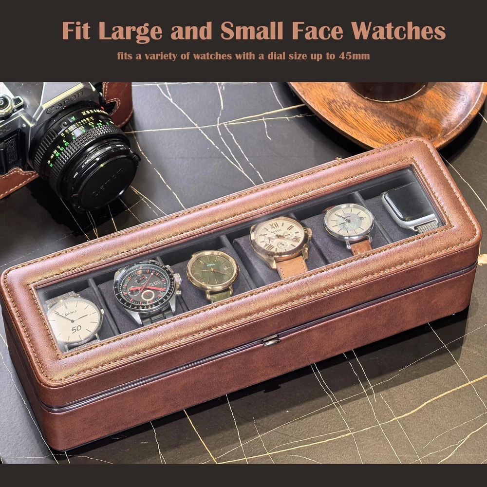 Product Size -Dimension:12"L x 3.85"D x 3.2"H (30.5 x 9.8 x 8.1cm) ; This 6 slots watch box organizer offers enough space for watches with a dial size up to 45 mm, keeping your watches organized and neat Glass Top - There is a glass window at the top for watches that need access to light and it will show the beauty of your precious watches, also you can see at a glance which watch you may decide to wear before having to open it Premium Material -The watch holder is with PU leather exterior and soft lining to protect your watch from scratches, super secure and is great for showing off, it will look great on your dresser Removable Pillow - Comes with 6 pillows that can be removed to make room for other accessories, such as cuff links, rings or other small items Great Present - This watch box organizer looks elegant and expensive, a nice present for people that who has a collection of watches, ideal for Valentine's day, Anniversary day, Birthday, Father's day, Graduation, Christmas Holidays etc.
