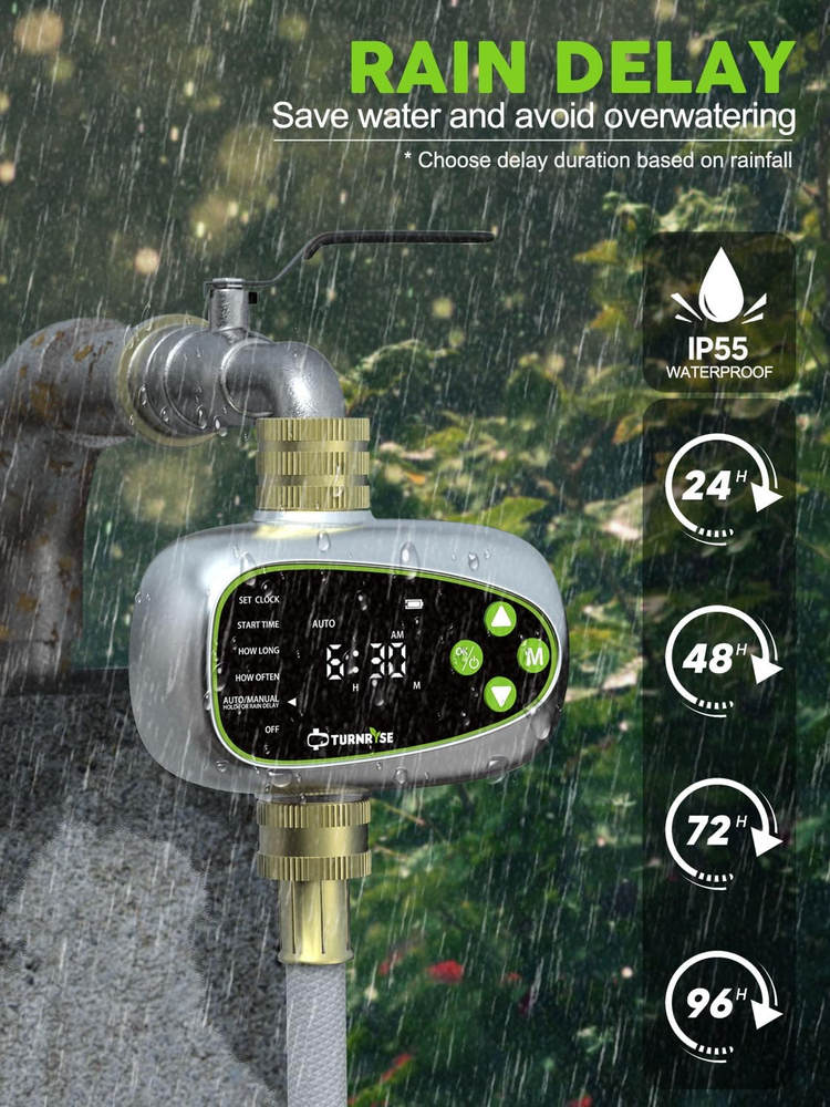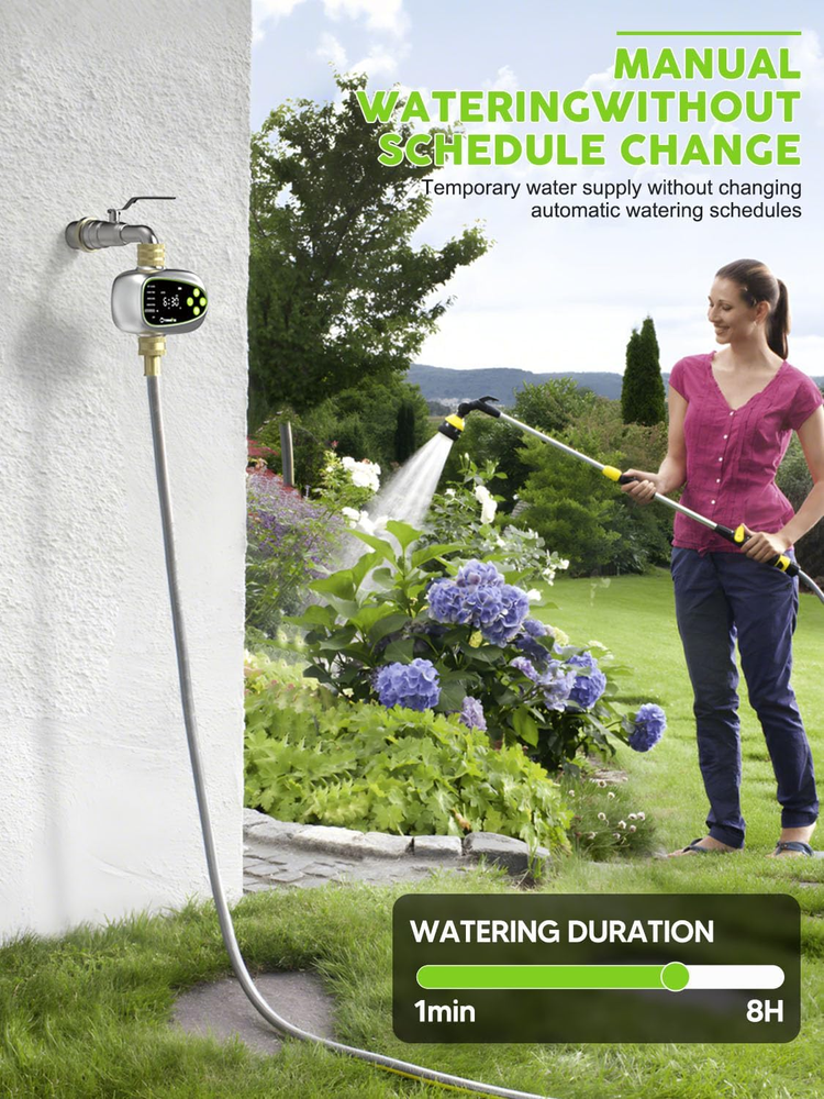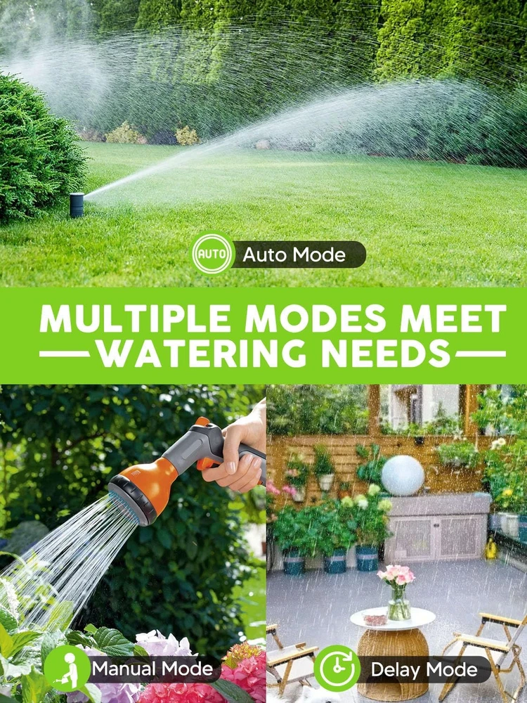 PROGRAMMABLE Water Timer: Easy-to-use digital interface allows you to set custom watering schedules for automatic garden irrigation. SINGLE ZONE CONTROL: Dedicated garden hose timer manages one watering zone with precision timing for optimal garden maintenance. UNIVERSAL COMPATIBILITY: Designed to work with standard outdoor sprinkler controller connections and outdoor faucets for hassle-free installation. WATER MANAGEMENT: Helps prevent overwatering and underwatering by maintaining consistent, scheduled watering cycles. CONVENIENT OPERATION: Battery-powered design enables reliable automation without the need for electrical outlets. Product Description