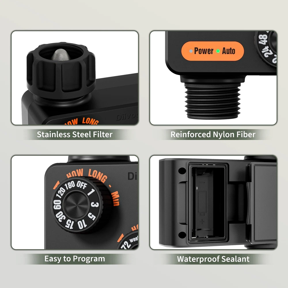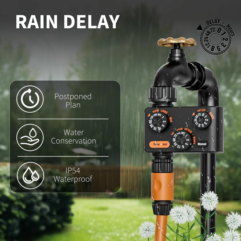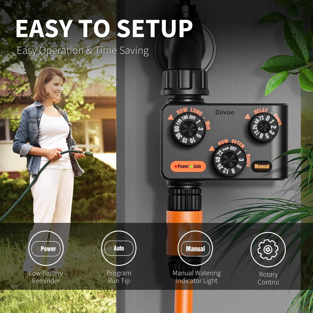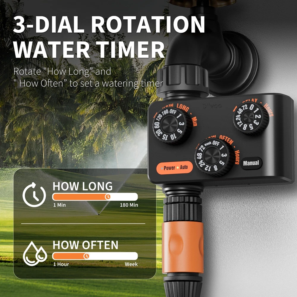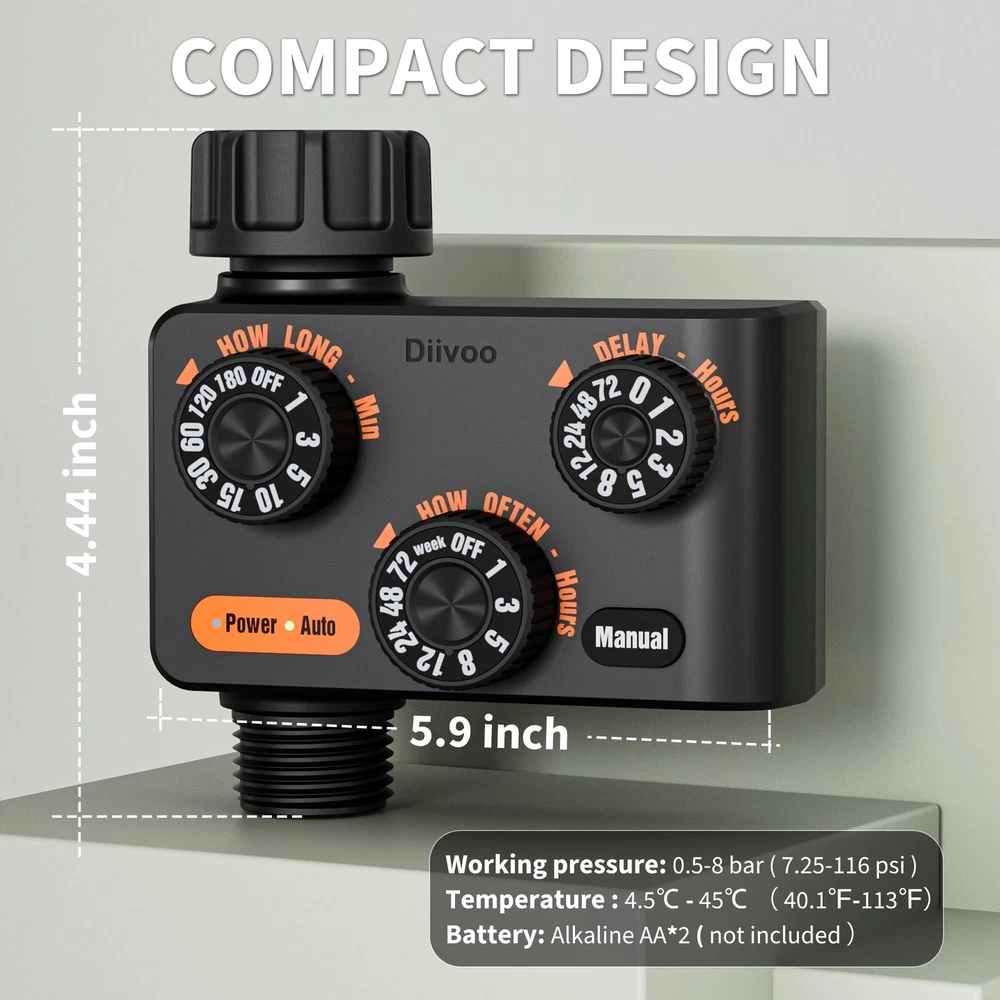 Water Timer for Garden Hose, 3-Dial Rotation Sprinkler Timer for Lawn, 3-dial Water Timer: This Water Hose Timer Outdoor is a user-friendly device that allows for the easy and intuitive setting of the irrigation schedule. With its super-large dials and indicator lights, users can complete the timer set-up within seconds. It does not require any installation tools and is suitable for parents and elders to use Effortless Operation: With only three dials to operate can set an automatic watering timer. Users can rotate the "How often" and "How Long" dials to set the frequency and run time and easily tailor the irrigation frequency and duration to best suit their garden, lawn, flowerbeds, or potted plants. The device offers multiple watering run time choices to satisfy different irrigation system needs Three Watering Modes: Catering to diverse irrigation needs, our water timer includes Automatic Watering, Manual Watering, and Delay Watering. Each mode can be set with a simple dial rotation. Whether you wish to initiate immediate watering or delay irrigation during rainy days, our timer lets you customize your watering schedule as needed Upgraded Leak-Proof Design: The hose tap timer connectors are made of 30% reinforced nylon, which can withstand water pressure with 0.5~8 bar (7.25~116psi). It is fortified with a resilient aluminum alloy filter and thread seal tape. The battery cover features a rubber ring to keep out optimal moisture resistance Wide Range of Applications: Suitable for a wide range of outdoor activities. It’s ideal for outdoor gravity drip irrigation, garden hose watering, managing lawn sprinkler systems, greenhouse mist systems, pool filling, birdbath drippers, pet drinking, and summer water playing Shipping We offer FREE shipping on all orders! We ship within Three business days of payment, usually sooner. We use a selection of shipping services such as UPS, FedEx, USPS etc. We only ship to the lower 48 states, no APO/FPO addresses or PO Boxes allowed. Local pickups and combined shipping options are not provided at this time. Return You can return a product for up to 30 days from the date you purchased it. Any product you return must be in the same condition you received it and in the original packaging. Please keep the receipt. Payment We accept payment by any of the following methods: PayPal Please pay as soon as possible after winning an auction, as that will allow us to post your item to you sooner! Feedback Customer satisfaction is very important to us. If you have any problem with your order, please contact us and we will do our best to make you satisfied. Contact Us If you have any queries, please contact us via ebay. We usually respond within 24 hours on weekdays. Please visit our eBay store to check out other items for sale! Thank you for shopping at our store.