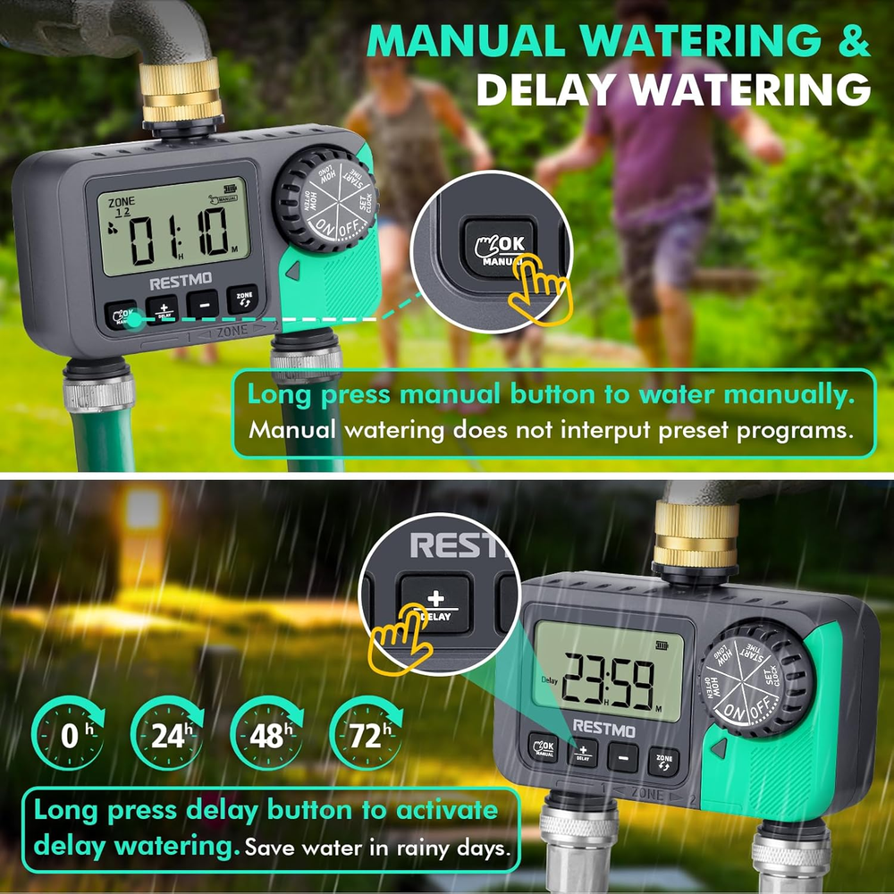 Reliable & Leak-Proof: Pure brass swivel inlet and high working pressure can protect this sprinkler timer from water leakage. The shell is built in with heavy-duty weatherproof construction, UV-resistant material, ideal for outdoor garden watering use and can withstand wind and rain. 2 Independent Zones: This sprinkler timer features with 2 independent outlets, which like separate timers to water two separate areas from one faucet. An ultimate facility to automatically control the watering schedules for your garden, yard and lawn effortlessly. Press zone button to select ZONE 1 or 2, or both. Multi-Functional Sprinkler Timer: It has 3 modes, auto/manual/rain-delay. With auto mode, the watering duration can be from 1min to 239mins and watering frequency can be from 1hr to 12hrs or from 1 day to 7 days. With manual mode, you can water your flowers and plants from 1min to 7hrs 59mins. With rain delay mode, you can choose from 0/24/48/72hrs and meets your flexible watering schedule. Easy To Use: With the large dial and 4 clear buttons, you can easily to read and program. Rotate the dial to set clock, start time, how long and how often. Then your irrigation system will become automatic and operate as per the program. Long press the “OK” and “+” buttons to activate manual mode and rain delay mode. APPLICATION: It is IP54 waterproof and leakproof, which is ideal for outdoor gravity drip irrigation, garden hose watering, lawn sprinkler controller, greenhouse mist system, pool filling, birdbath dripper, rain barrels, pet drinking, etc. Product Description Metal Filter washer With a360-degree rotatable pure brass inlet, this water timer is easy to attach on the faucet. The metal filter washer can effectively prevent dirty. Fits Standard Hose and Faucet Threaded with the 3/4” NH Thread, this sprinkler timer fits all standard outdoor faucets and garden hoses. Easy To Use The easy-to-set oversized dial makes the setup simple and intuitive. The large LCD display is easy to read at a distance. Teflon tape is included. Waterproof Battery Compartment Features with anti-leaking design and the internal rubber ring around the case cover provides IP54 waterproof. Batteries are not included. 1 AUTOMATIC WATERING 2 MANUAL WATERING 3 RAIN DELAY WATERING 4 STOP WATERING SPECIFICATIONS Inlet Thread 3/4” NH. Pure Brass Inlet Outlet Thread 3/4” NH, 2 Outlet Watering Duration 1min to 3hrs 59mins Watering Frequency 1-12hrs or 1-7days Working Pressure 8-120PSI (0.5-8.0 Bar) Maximum Flow Rate 10GPM (35L/Min) Working Temperatue 38 to 120℉ (3 to 50℃) Battery 2 x AAA Alkaline Batteries (not included) Waterproof IP54 Rain Delay Time 12/24/48/72 hours Size 5.7 x 5.4 x 3.3in (14.5 x 13.7 x 8.4cm) Gardening & Lawn Care Add to Cart Add to Cart Customer Reviews 3.5 out of 5 stars 137 4.4 out of 5 stars 312 4.2 out of 5 stars 3,121 3.8 out of 5 stars 239 4.1 out of 5 stars 368 3.9 out of 5 stars 88 3.8 out of 5 stars 74 Price — $34.99 $ 34 . 99 $69.99 $ 69 . 99 — $29.99 $ 29 . 99 — — Model O-HT-3B O-HT-3A O-HT-3D O-HT-2B O-HT-2A O-HTB-1A O-HTB-1AM Additional Features Pure Brass Inlet Pure Brass Inlet Pure Brass Inlet Pure Brass Inlet & Outlet Pure Brass Inlet & Outlet Zero Water Pressure Watering Zero Water Pressure Watering Application Gardening & Lawn Care Gardening & Lawn Care Gardening & Lawn Care Gardening & Lawn Care Gardening & Lawn Care Gardening & Lawn Care Gardening & Lawn Care Independent Programs 1 1 1 3 3 1 1 Independent Zones 2 1 4 2 1 1 1 Color Green/Black Green/Black Green/Black Green/Black Green/Black Green/Black Green/Black 3/4” Garden Hose Thread ✔ ✔ ✔ ✔ ✔ ✔ ✔