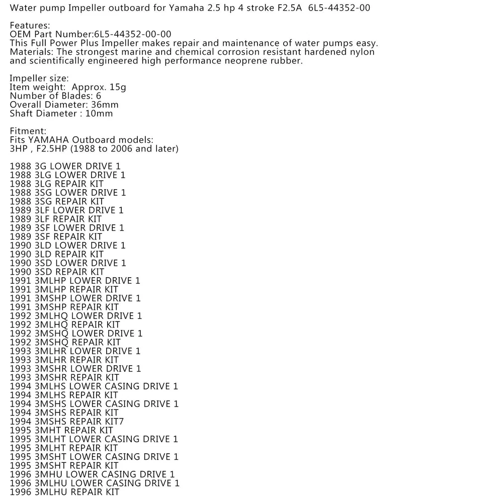 Product Description Water pump Impeller outboard for Yamaha 2.5 hp 4 stroke F2.5A 6L5-44352-00 Water pump Impeller outboard for Yamaha 2.5 hp 4 stroke F2.5A 6L5-44352-00 Features: OEM Part Number:6L5-44352-00-00 This Full Power Plus Impeller makes repair and maintenance of water pumps easy. Materials: The strongest marine and chemical corrosion resistant hardened nylon and scientifically engineered high performance neoprene rubber. Impeller size: Item weight: Approx. 15g Number of Blades: 6 Overall Diameter: 36mm Shaft Diameter : 10mm Fitment: Fits YAMAHA Outboard models: 3HP , F2.5HP (1988 to 2006 and later) 1988 3G LOWER DRIVE 1 1988 3LG LOWER DRIVE 1 1988 3LG REPAIR KIT 1988 3SG LOWER DRIVE 1 1988 3SG REPAIR KIT 1989 3LF LOWER DRIVE 1 1989 3LF REPAIR KIT 1989 3SF LOWER DRIVE 1 1989 3SF REPAIR KIT 1990 3LD LOWER DRIVE 1 1990 3LD REPAIR KIT 1990 3SD LOWER DRIVE 1 1990 3SD REPAIR KIT 1991 3MLHP LOWER DRIVE 1 1991 3MLHP REPAIR KIT 1991 3MSHP LOWER DRIVE 1 1991 3MSHP REPAIR KIT 1992 3MLHQ LOWER DRIVE 1 1992 3MLHQ REPAIR KIT 1992 3MSHQ LOWER DRIVE 1 1992 3MSHQ REPAIR KIT 1993 3MLHR LOWER DRIVE 1 1993 3MLHR REPAIR KIT 1993 3MSHR LOWER DRIVE 1 1993 3MSHR REPAIR KIT 1994 3MLHS LOWER CASING DRIVE 1 1994 3MLHS REPAIR KIT 1994 3MSHS LOWER CASING DRIVE 1 1994 3MSHS REPAIR KIT 1994 3MSHS REPAIR KIT7 1995 3MHT REPAIR KIT 1995 3MLHT LOWER CASING DRIVE 1 1995 3MLHT REPAIR KIT 1995 3MSHT LOWER CASING DRIVE 1 1995 3MSHT REPAIR KIT 1996 3MHU LOWER CASING DRIVE 1 1996 3MLHU LOWER CASING DRIVE 1 1996 3MLHU REPAIR KIT 1996 3MSHU LOWER CASING DRIVE 1 1996 3MSHU REPAIR KIT 1997 3MLHV LOWER CASING DRIVE 1 1997 3MLHV REPAIR KIT 1997 3MSHV LOWER CASING DRIVE 1 1997 3MSHV REPAIR KIT 1998 3MLHW LOWER CASING DRIVE 1 1998 3MLHW REPAIR KIT 1998 3MSHW LOWER CASING DRIVE 1 1998 3MSHW REPAIR KIT 1999 3MHX LOWER CASING DRIVE 1 1999 3MHX REPAIR KIT 1 1999 3MLHX LOWER CASING DRIVE 1 1999 3MLHX REPAIR KIT 1 1999 3MSHX LOWER CASING DRIVE 1 1999 3MSHX REPAIR KIT 1 2000 3MLHY LOWER CASING DRIVE 1 2000 3MLHY REPAIR KIT 1 2000 3MSHY LOWER CASING DRIVE 1 2000 3MSHY REPAIR KIT 1 2001 3MHZ REPAIR KIT 2001 3MSHKZ LOWER CASING DRIVE 2001 3MSHKZ REPAIR KIT 2001 3MSHZ LOWER CASING DRIVE 2001 3MSHZ REPAIR KIT 2002 3MSHA LOWER CASING DRIVE 2002 3MSHA REPAIR KIT 2003 F2.5MSHB LOWER CASING DRIVE 1 2003 F2.5MSHB REPAIR KIT 3 2004 F2.5MSHC LOWER CASING DRIVE 1 2004 F2.5MSHC REPAIR KIT 3 2005 F2.5MSHD LOWER CASING DRIVE 1 2005 F2.5MSHD REPAIR KIT 3 2006 and Later F2.5LMHA LOWER CASING DRIVE 1 2006 and Later F2.5LMHA REPAIR KIT 3 2006 and Later F2.5MSH LOWER CASING DRIVE 1 2006 and Later F2.5MSH REPAIR KIT 3 2006 and Later F2.5SMHA LOWER CASING DRIVE 1 2006 and Later F2.5SMHA REPAIR KIT 3 2006 and Later F2.5SMHA_0 LOWER CASING DRIVE 1 2006 and Later F2.5SMHA_0 REPAIR KIT 3 Package included: 1 x Water Pump Impeller About Us Bruce & Shark is a company Focus on Motorcycle parts more than 11 years. The design inspiration comes from the awe of the vast sea and worship of the fighting sharks, therefore Bruce & Shark takes a shark as brand logo. Since its inception, we have always put the "customer first" and "top quality" as our principle. We specialized in selling Motorcycle parts and providing customers with various types of high-quality products. Our brand Bruce & Shark has enjoyed good reputation in America, Europe, Japan, Canada and Africa, covering more than 30 countries. Our vision is to deliver high-quality Motorcycle parts products and sincere services to the world. Our main products are motorcycle mounted, fuel pump, stator, windshield, Seat Cover, motorcycle fairing. Welcome to our shop to choose products that are worth more for your Motorcycle! Please Add me to your list of favorite sellers and visit often. Thank you for your business. Shipping United States Buyers Parcel will send via USPS or UPS or FedEx from our United States Warehouse. Shipping Time Usually parcel will be delivered 2-7 working days include handling time. Sometimes shipping time may has a little delay, such as Bad weather, Holidays. Terms We stand behind everything that we sell and will do everything possible to assure you are satisfied. When you receive your purchase if you are not 100% satisfied, please sent me ebay message and we will do our best to make you happy. If you still want to return your purchase, simply ship the item(s) back to us and we will refund your original purchase price and the original shipping charge. Buyers are responsible for the postal cost of returning the items. We must be notified of the intent to return your item within 30 days of receiving the item. Items returned must be in the same condition that they were received. How to return 1,Please ask us for return address . 2,Shipping back the package . The RMA#(Return Merchant Authorization Number = Your ebay ID) must be clearly written on the return package ,Otherwise the package will be refused. 3,Sent us the return tracking number. 4,All returns will be inspected prior to a credit being issued. Contact Us Send us ebay message in English If you have any questions, our Customer Service staffs welcome you to sent me ebay message. We strive to answer all questions and resolve any problems as quickly as possible. Business Hours: HongKong Time GMT+8:00 Monday-Saturday 9:00-17:00 Copyright © Bruce&Shark All rights reserved