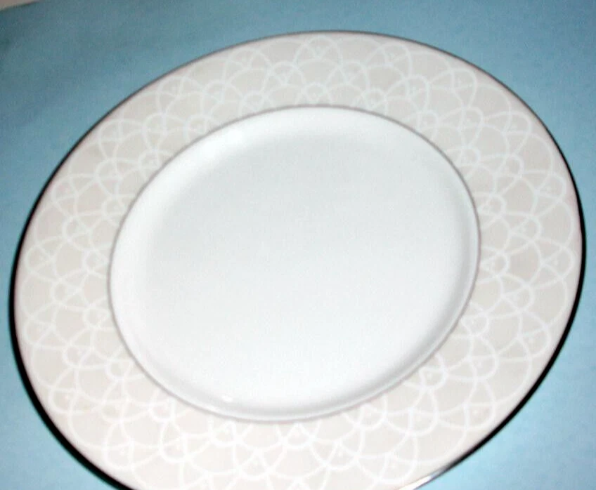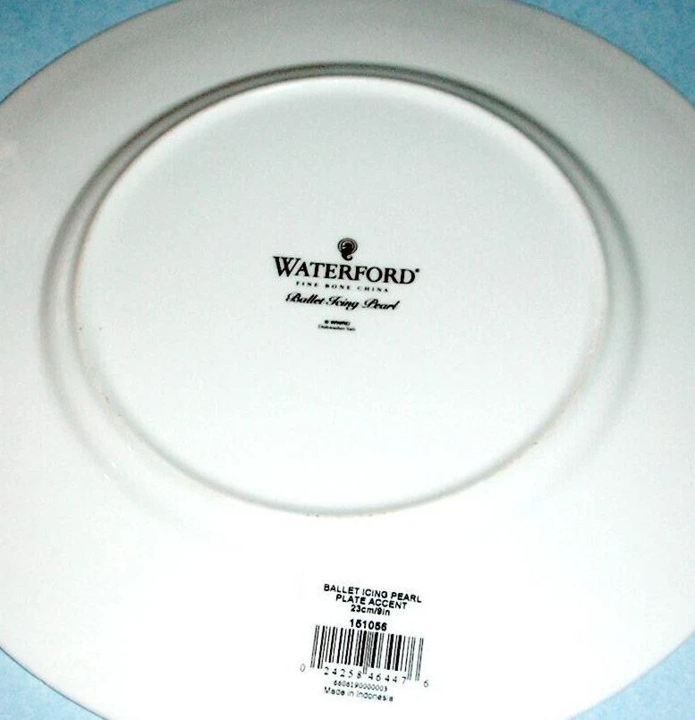 Waterford Bone China Ballet Icing Pearl 9" Accent Plate Beautiful fine bone china accent plate featuring a fanciful white-on-white slightly raised line design accented with bands of polished platinum. • Measures approx. 9" in diameter • This multi-purpose plate can be used to serve your favorite salad, sandwich, dessert and more • Dishwasher safe • Made in Indonesia • Discontinued Unused accent plate with original barcode sticker . It came direct from Waterford with a small chipped edge on its platinum band exposing a bit of white (see pix). Not noticeable from top. ----------- Please closely examine the listing and submit any questions prior to purchase. Pictures may not reflect true colors due to various lighting conditions. Smoke-free, pet-free environment