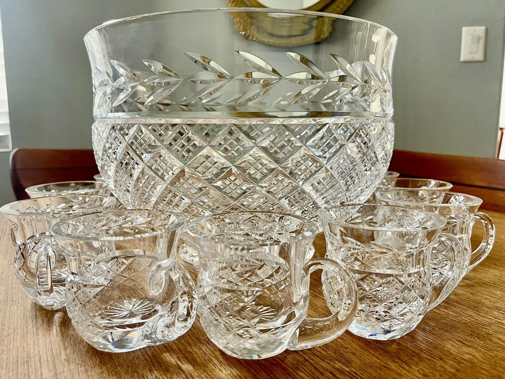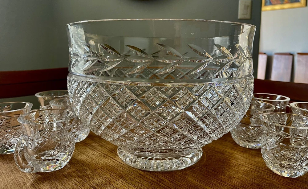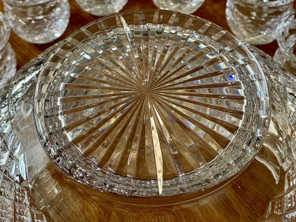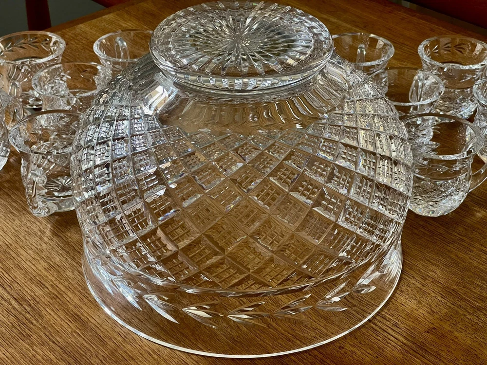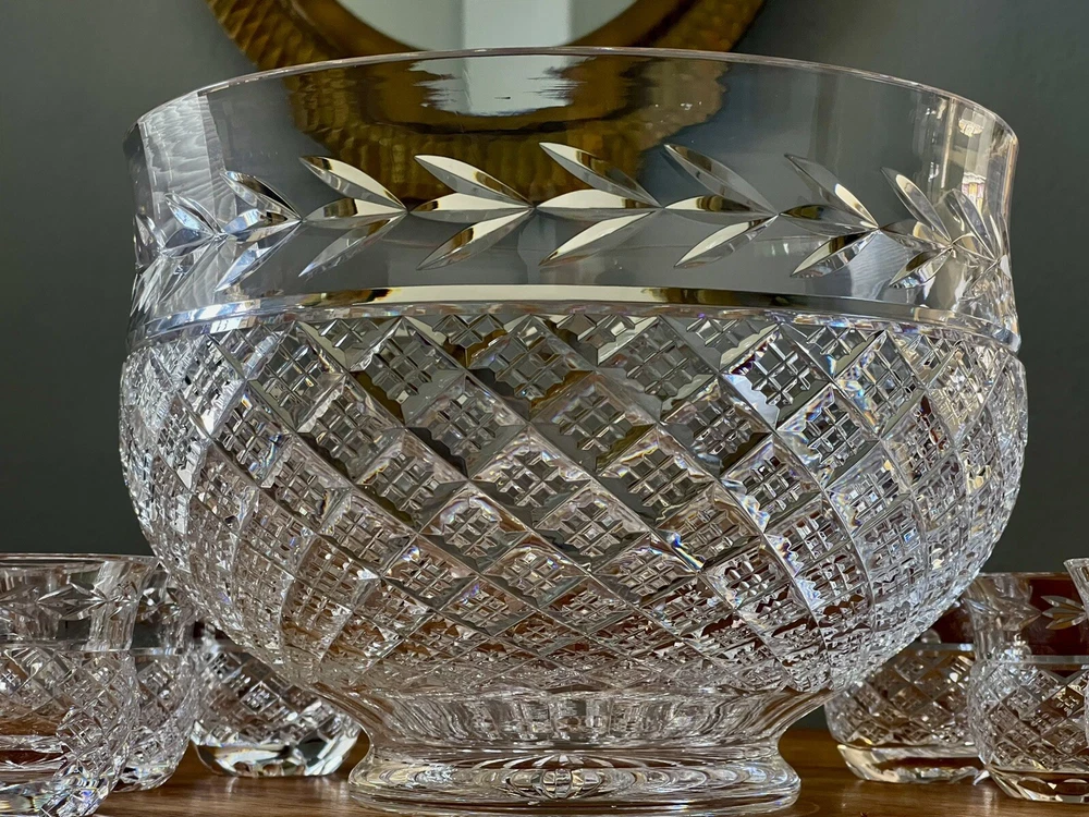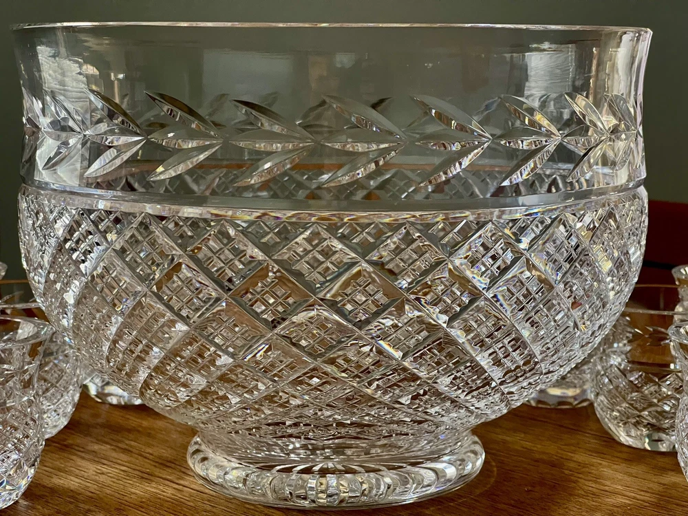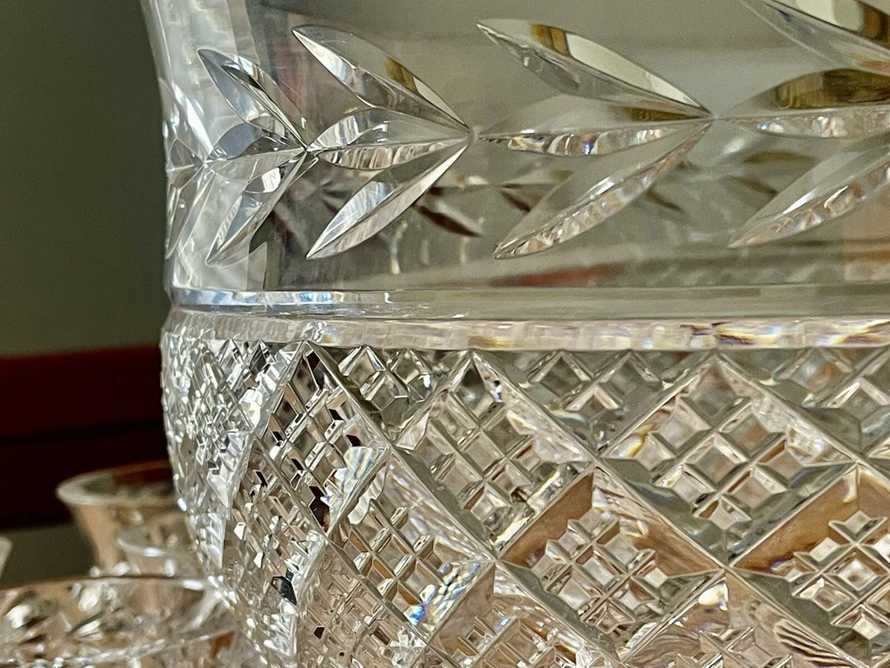 Waterford crystal Glandore punch bowl set is a stunning addition to any glassware collection. The set includes a 12-inch footed punch bowl and 12 cups, all featuring the intricate Glandore pattern. The clear crystal material and round shape make this set a perfect choice for any occasion. The set is an original Waterford product, handmade in Ireland, and features a printed backstamp. The set is perfect for serving punch and other beverages, and is sure to impress your guests. No chips, cracks or repairs