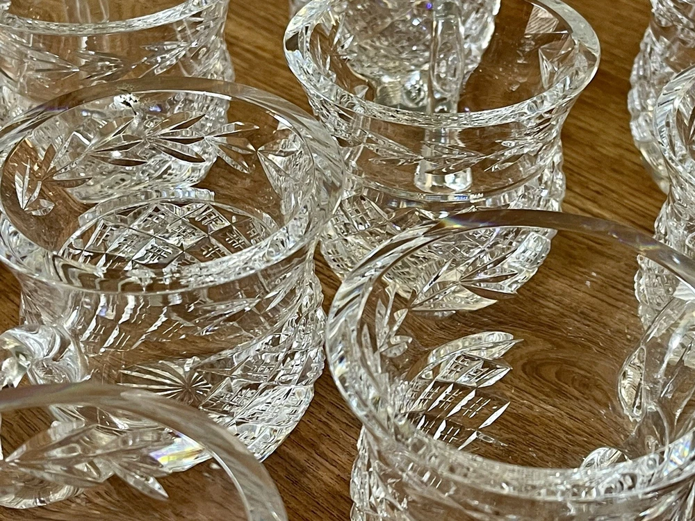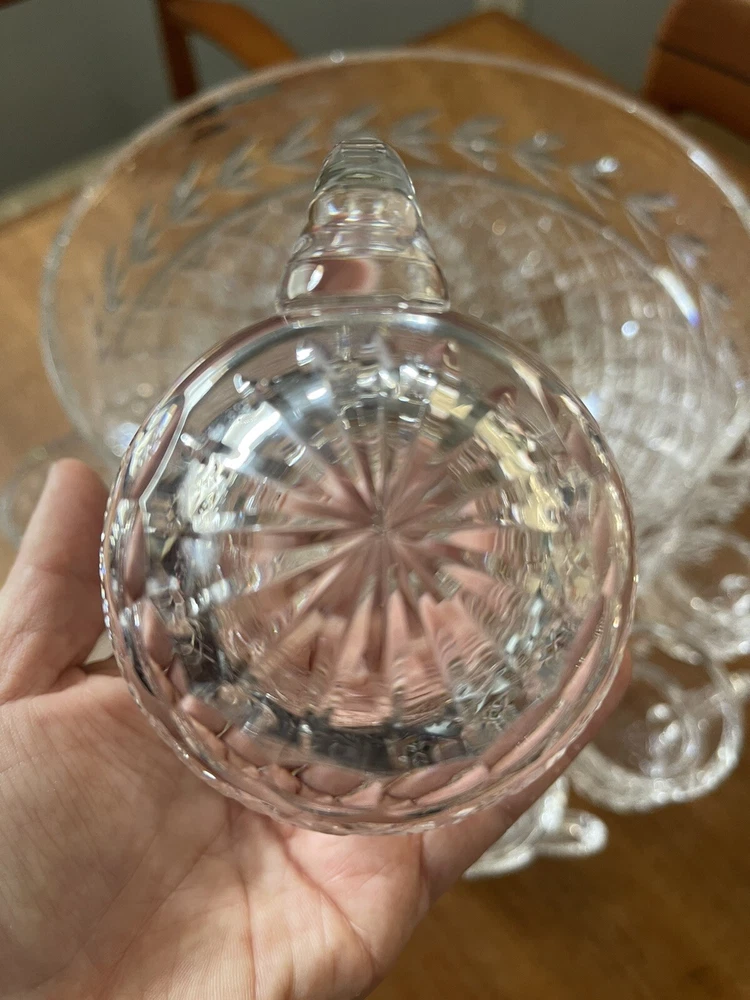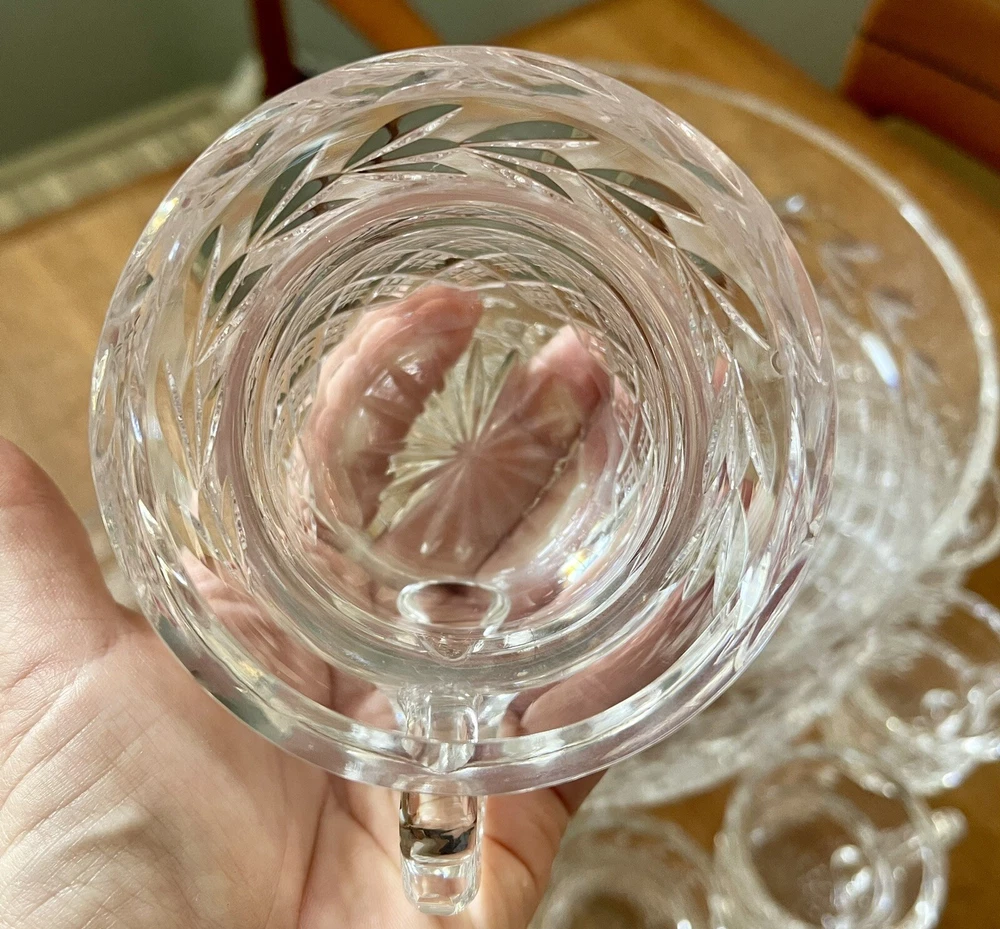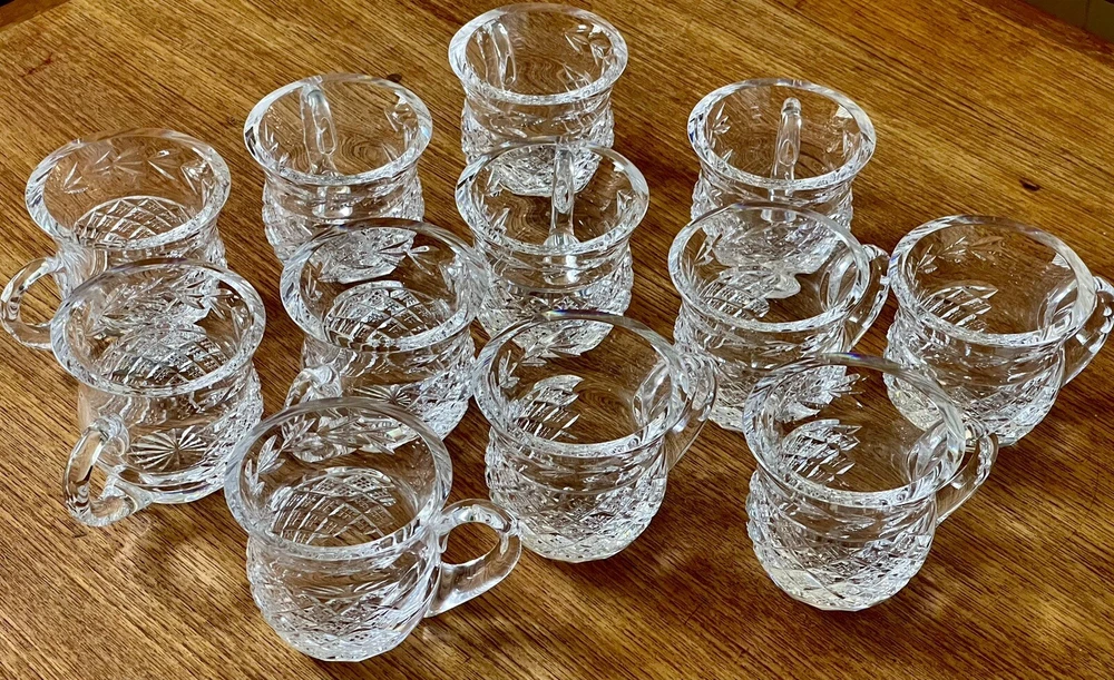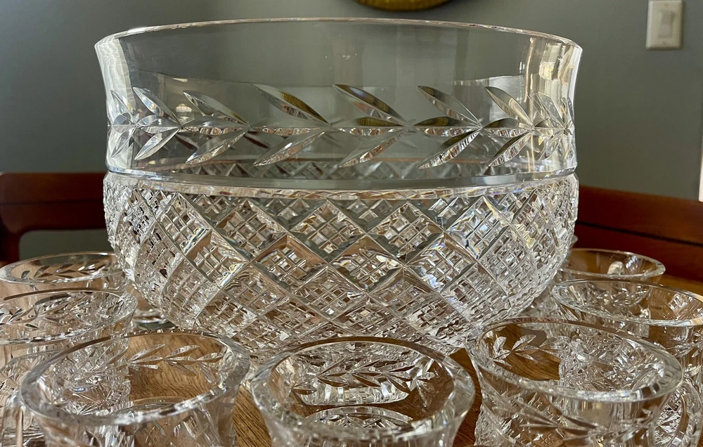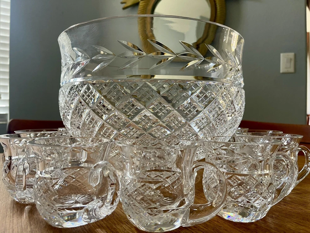 Waterford crystal Glandore punch bowl set is a stunning addition to any glassware collection. The set includes a 12-inch footed punch bowl and 12 cups, all featuring the intricate Glandore pattern. The clear crystal material and round shape make this set a perfect choice for any occasion. The set is an original Waterford product, handmade in Ireland, and features a printed backstamp. The set is perfect for serving punch and other beverages, and is sure to impress your guests. No chips, cracks or repairs