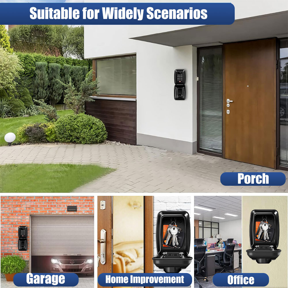 Highlight description: [Weather-Resistant Material] The password key lock box is made of rust-proof aluminum and zinc alloy, ensuring sturdy and durable enough to withstand different forms of tampering such as knocking, sawing and prying. It is waterproof and rust-proof, which can extend outdoor use. The weather-resistant material is effective to withstand weather conditions like sunlight, rain, and snow. [Resettable Code Design] Our wall mounted key lock box is designed with 12-digit combination system to improve security, and you can set a unique password. After each password reset, you must securely photograph or record your code to prevent forgetting it. The waterproof lock box comes with detailed instruction to guide you through every step, so you can reset your access code promptly when needed. [Easy to Install] The package includes all necessary mounting accessories, including 4 screws, 4 nylon expansion bolts, and a double-ended screwdriver for easy installation. Pre-drilled holes make securing keybox an easy task. The user-friendly installation process ensures easy access to your key storage unit after entering the correct code. [Save Time and Effort] This product can greatly reduce time and hassle of finding your keys. Just enter the correct password or password combination to quickly and easily retrieve the required key, saving valuable time and effort. [Wide Application] This key safe can hold at least 5 home or car keys. It provides additional storage capacity for items like access cards, credit cards, and USB flash drives. It is suitable for home, vehicle, rental property or commercial space. It provides temporary access for family, friends, visitors, maintenance staff and tenants, ideal solution for keyless entry. Detailed description: Product Name: Password Key Lock Box P roduct List: Key Box * 1+Screw Pack * 1+Instruction Manual in Seven Languages * 1 Procurement specification: G14 black Suppliers have patents in the United States, European Union, and United Kingdom Product Material: Aluminum Alloy Product Function: Key and Card Storage and Management Product size: 12.1 * 9.5 *. 6.2cm Net weight of product: 590g Product features: 1. Upgrade highlights: Install waterproof cover, waterproof and rust proof, extend service life; 2. Increase capacity, lock without lag, can accommodate multiple keys, bank cards, access cards, etc; 3. High quality alloy material; 4. Mechanical principle, high-density anti misoperation; 5. Suitable for multiple occasions.