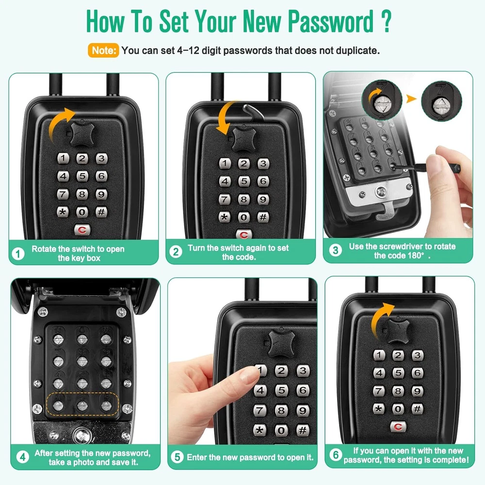 About this item 【HIGH SECURITY】- Key lock box can be set with a code of 1-12 digits at will. Provides more combination possibilities than many general 4-digit passwords on the market, so it’s harder to crack and has higher security. 【STURDY & DURABLE】- The key storage box made of high-strength zinc, aluminum alloy and heavy-duty stainless-steel material, enough to withstand hammered, sawed and pried, has a long service life, keeps your key safer. 【RAINPROOF & DUSTPROOF】- The key hider lock box comes with removable cover shields and a removable hang ring, which can effectively protect from rain, snow and sun. You can securely hang this key lock box on a doorknob, fence and anywhere you want, no need to put the keys under the carpet or flower pot. Key lock box for outside suitable for indoors and outdoors, such as garage doors, wardrobes, offices and schools. 【LARGE CAPACITY】- The security lock box size: 4.76*3.78*2.44 inches, it has ample storage space, a built-in key hook, which can hold multiple keys or other small things like ID cards, access cards, car keys, etc. Perfectly for family members, realtors, current students, office staff, pet sitters. Note: This "C" button means cancel, so you can re-enter the password if you entered it incorrectly. Specification: Material: Aluminum alloy + ABS. Weight: 650g. Color: black. What do you get? 1 x security key box 1 x User manual 1 x Screwdriver 1 x Packing box