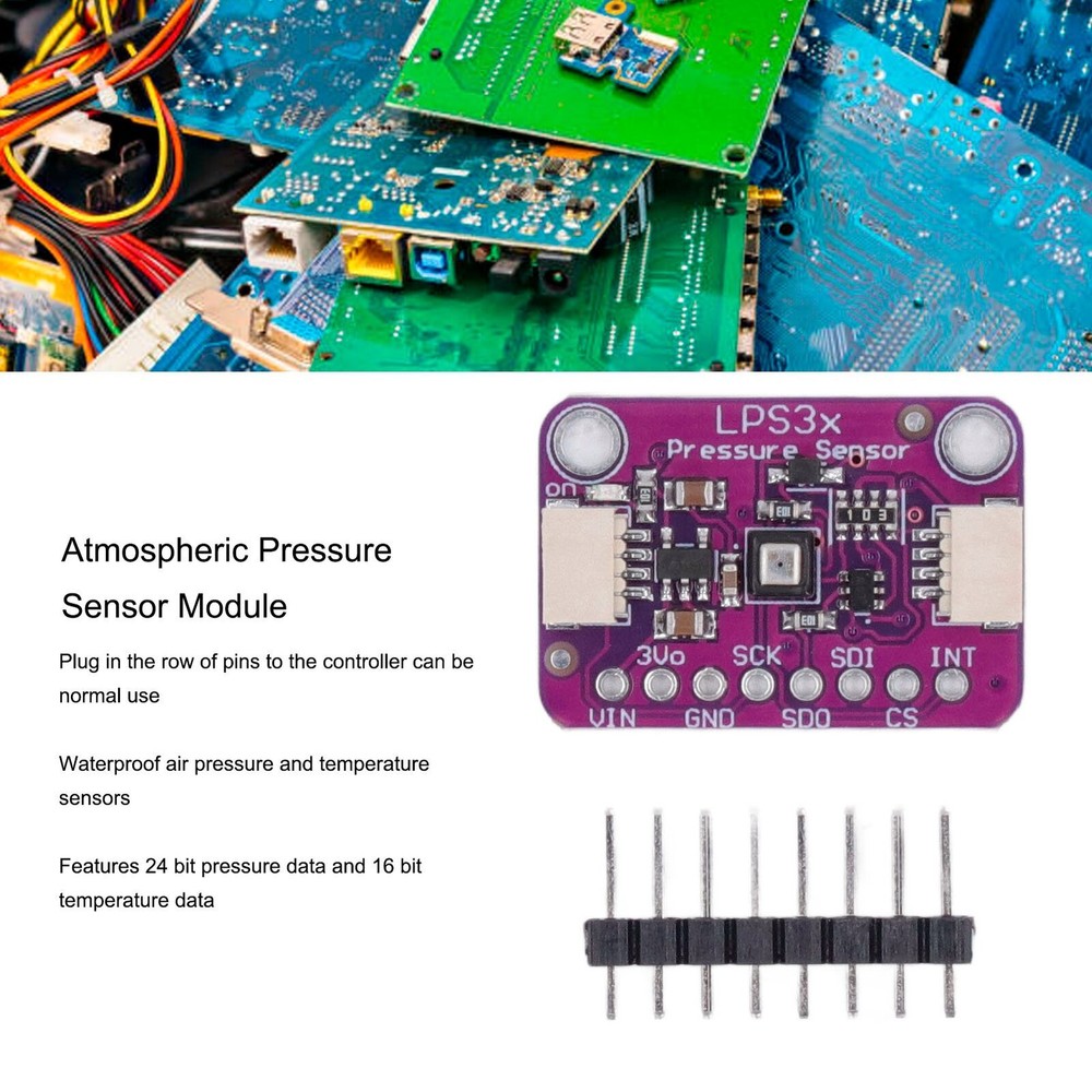 Feature: 1. WATERPROOF: Safe for use in wet environments, the sensing element is firmly encapsulated in a waterproof gel to prevent water from entering the sensor and interfering with readings. 2. MEASURING RANGE: The sensing module has a measurement range of 260 to 1260hPa and can withstand pressures up to 20 times its measurement range. 3. HIGH ACCURACY: The sensing module has 24 bits of pressure data and 16 bits of temperature data and provides pressure readings with an accuracy of ±0.1%. 4. SMALL AND COMPACT: The sensing module is compact, does not take up much space for installation, and supports SPI and I2C communication. 5. EASY TO USE: The sensor module can be plugged into the controller with a row of pins for normal , which is very simple. Specification: Item Type: Atmospheric Pressure Sensor Module Material: PCB Pressure Range: 260 to 1260 hPa Output: 24 bit pressure data output, 16 bit temperature data output Communication: SPI and I2C Board Size: Approx. 18 x 25mm / 0.71 x 0.98in Package List: 1 x Atmospheric Pressure Sensor Module 1 x Pin