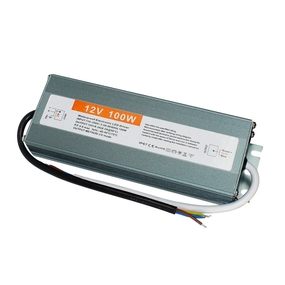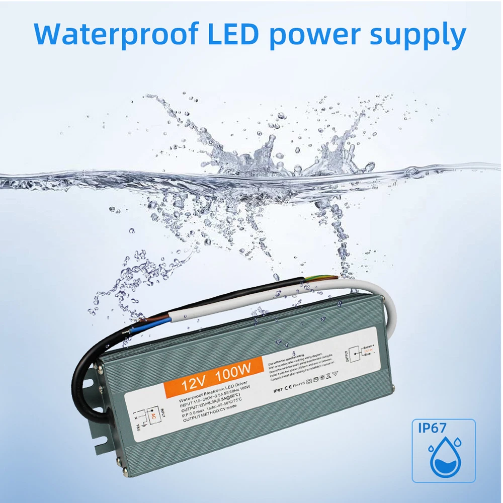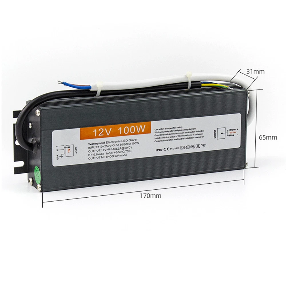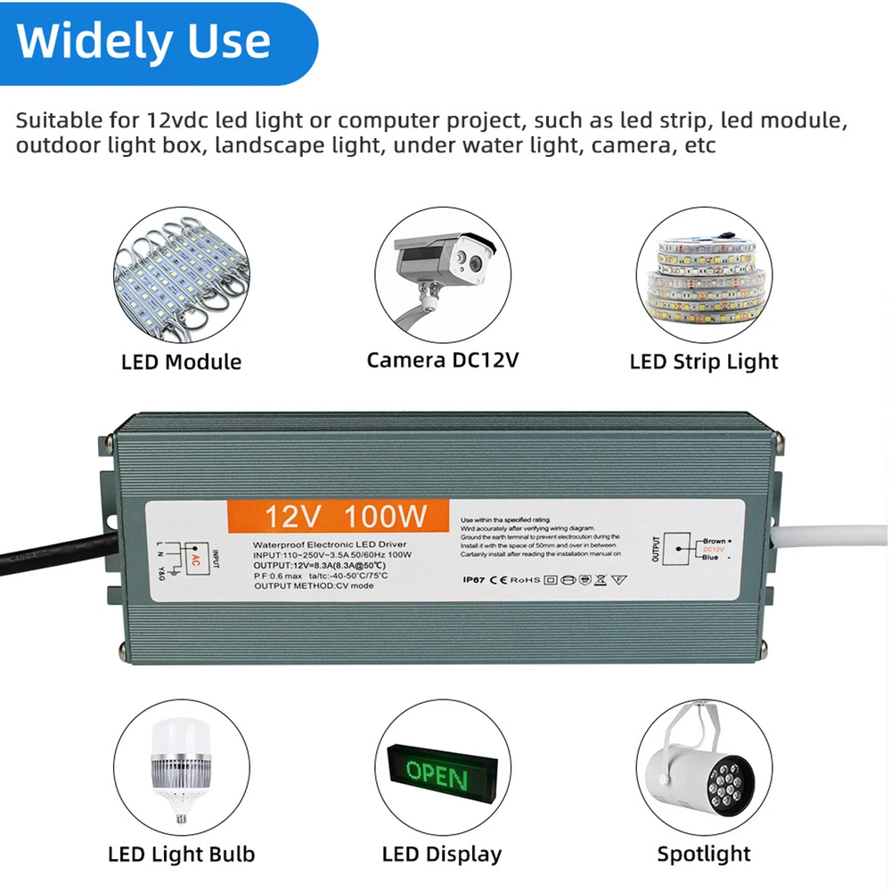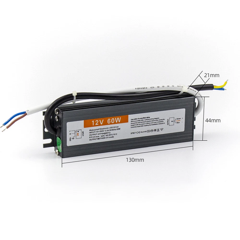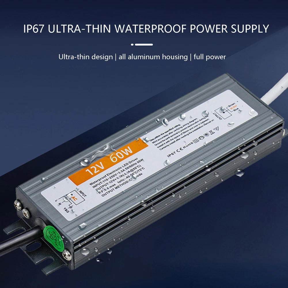 Description: Waterproof led power supply AC 110V~250V TO DC 12V. This waterproof led power supply is widely used for outdoor/indoor led lights, such as led strip lights, led module, led signs, landscape lights, camera computer project, ect. Ultra slim size suitable for narrow space, full filled with silic one glue, no dust go in, waterproof feature protect this low voltage transformer operate stable. Specifications: Input: AC 110-250V 50/60Hz. Output: DC 12V, 5A 60W / 16.7A 200W. Efficiency: 88%. Working Temperature: -40℃ to +50℃. Working Humidity: 20%-90%Rh. Power cord Length: 1.5M / 5FT. Package list: 1 x 12V led power supply.