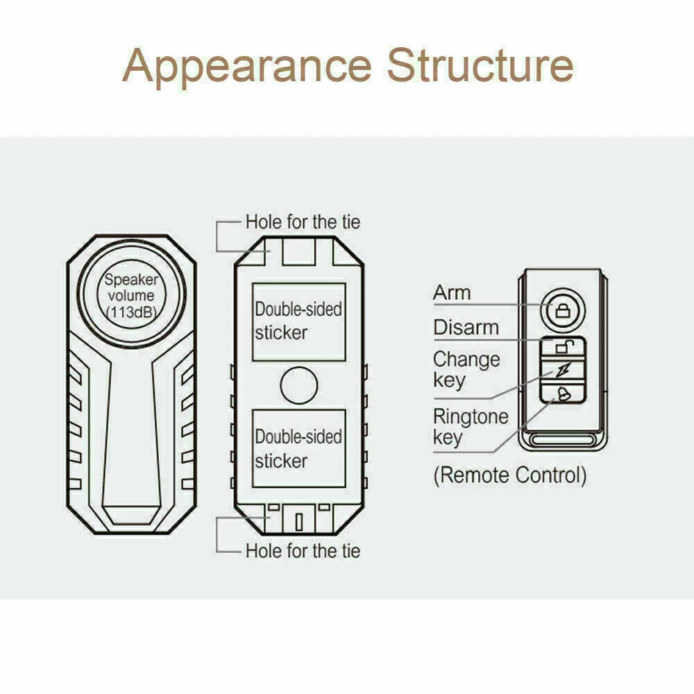 Features : 1)3 Levels Adjustable Volume, from 96dB, 105 dB to 113dB 2)7 Levels Adjustable Sensitivity,from gently touch to push or beat 3)IP55 Waterproof and Durable 4)Search Function,alarm make sounds when you press the ringtone key 5)SOS Function,The alarm will automatically alarm for calling help when your bicycle tilts more than 45 degrees 6)Multi-Purpose Vibration triggered alarm suitable for Bikes, Electric Bike, Motorcycles, Scooter, Car, Trailer, Luggage, Doors and Windows 7)DIY pairing:1 Host Alarm Can Pair with uo to 8 Remote Control Specifications: Condition: 100% Brand New Shell Material: PC Alarm volume: 113dB (Test distance is 30cm) Remote control distance: 30~60m (98~196ft) Working frequency: 433.92MHz Working temperature: -20~60β Humidity: <80% Storage temperature: -30β Wireless Burglar Vibration Waterproof Alarm This is a multi-purpose vibration alarm. The alarm will sound when it is triggered by vibration. When the alarm is in arming mode, the alarm will sound once when it is triggered for the first time; if it is triggered again within 2-12s, the alarm will sound for 30s and then stop, and then re-enter arming mode. The unlock button of the remote control can make the alarm stop. 3 levels of volume and 7 levels of sensitivity can be adjusted. 113dB super loud volume deters theft. Easy to set whether the alarm is triggered by a light touch or a hard shake. IP54 waterproof, no fear of rain or snow. The lightning button on the remote control can be used as a proximity finding bell or warning bell. Ideal for bicycle, scooter, motorcycle anti-theft, simple anti-theft system for home apartment doors and windows, or as protection for luggage, boxes or other personal items. About Pairing Pair the first remote Let the alarm power off for 30s (remove the battery). Long press π button of the remote control to enter the pairing mode, press the π button of the remote control, the pairing is successful. Add another remote Long press π button of the PAIRED remote control to enter the pairing mode, press the π button of the NEW remote control, the pairing is successful. Delete all pairing of the remote Long press π button of the remote control to enter the pairing mode, press the β‘ button of the remote control, the remote won't control. About Setting Long press π (LOCK) button of the remote control to enter the setting mode, Press π (UNLOCK) button to adjust the sensitivity, from the tone "DO" to "SI", 7 levels; where "DO" is the highest sensitivity, "SI" is the lowest sensitivity. Press β‘ button to turn on/off the SOS function. Press π button to adjust the volume, including 3 levels. Parameter Shell Material PC Volume 113dB (Test distance is 30cm) Remote control distance 30~60m (98~196ft) Working frequency 433.92MHz Working temperature -20~60β Storage temperature -30β ~+70β Battery(Alarm) 3x AAA alkaline batteries Battery(Remote) 1x 12V/27A alkaline battery Installation Steps