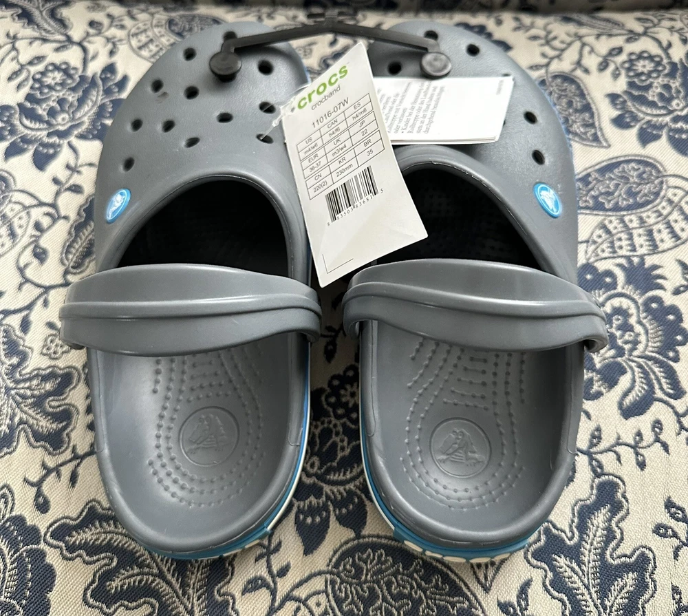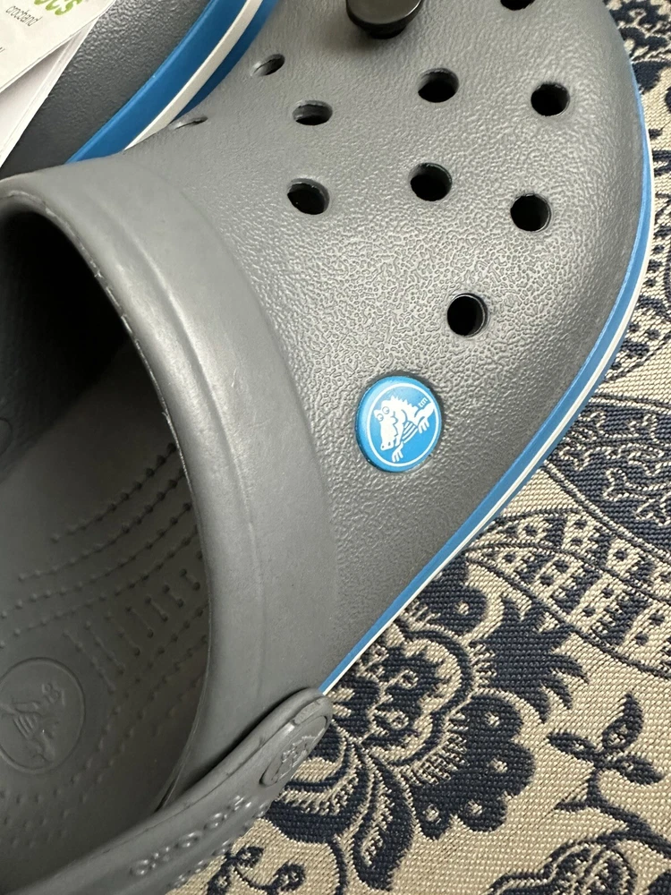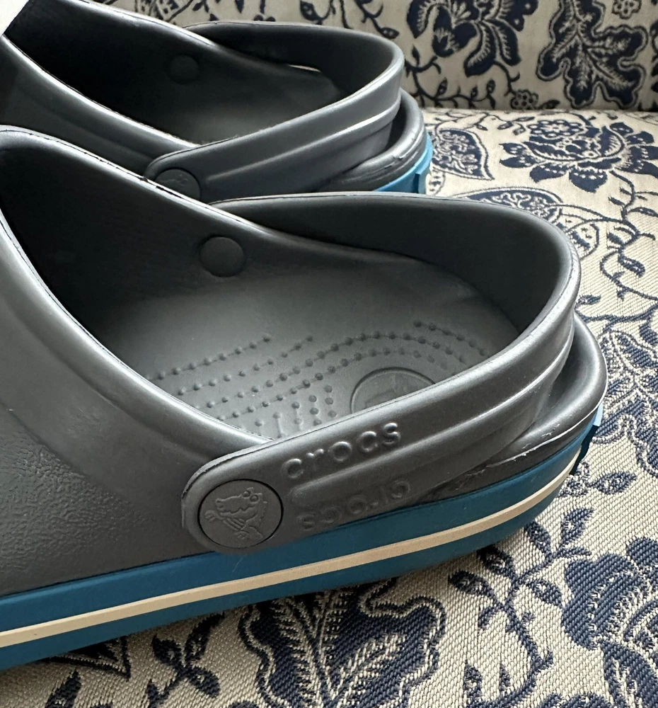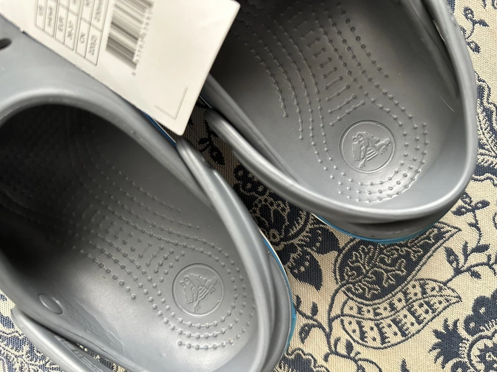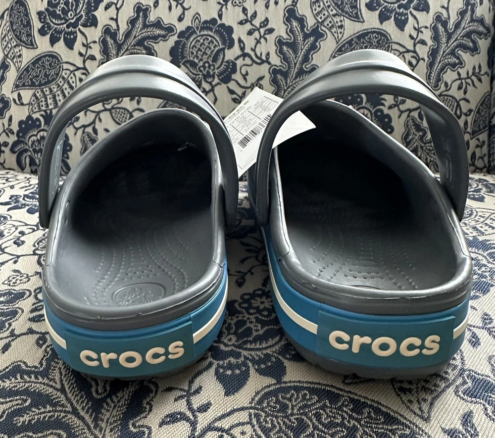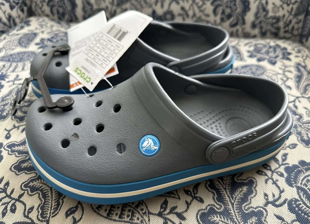 Crocband™ Clog Item # 11016 New with Tags, please see photos because there are some imperfections on the crocs Size: Women’s size 6 or Men’s size 4 | Big Kids Colors: Charcoal Gray & Ocean Blue Sporty. Stylish. Comfortable. The Crocband™ Collection features original Croslite™ foam construction for reliable cushioned comfort, a sporty design that’s easy to step into and out of, and a variety of energy-boosting colors and graphic designs. Show your stripes! Crocband™ Clog Details: Bold midsole stripe for a sporty look Easy to clean and quick to dry Ventilation ports for enhanced breathability Water-friendly and buoyant Fully molded Croslite™ material for lightweight cushioning and comfort Pivoting heel strap for a more secure fit Customizable with Jibbitz™ charms Iconic Crocs Comfort™: Lightweight. Flexible. 360-degree comfort.