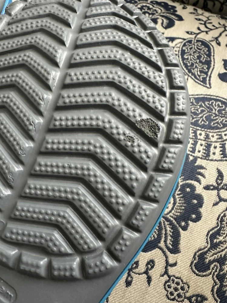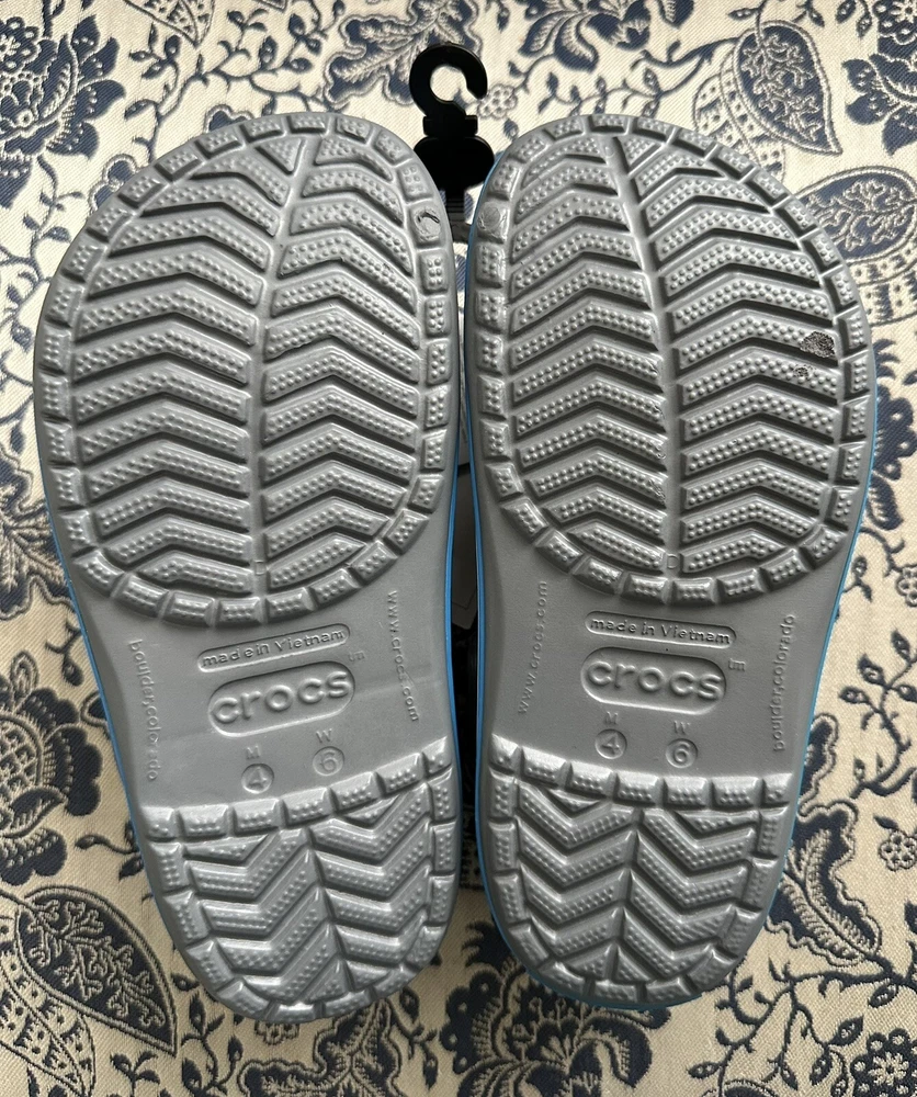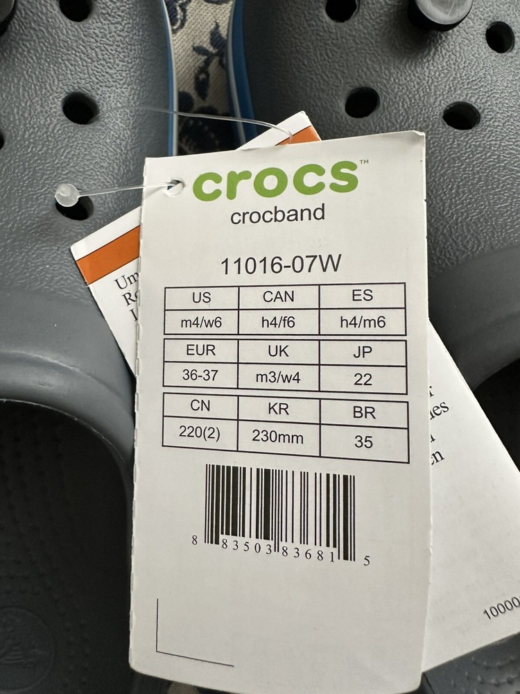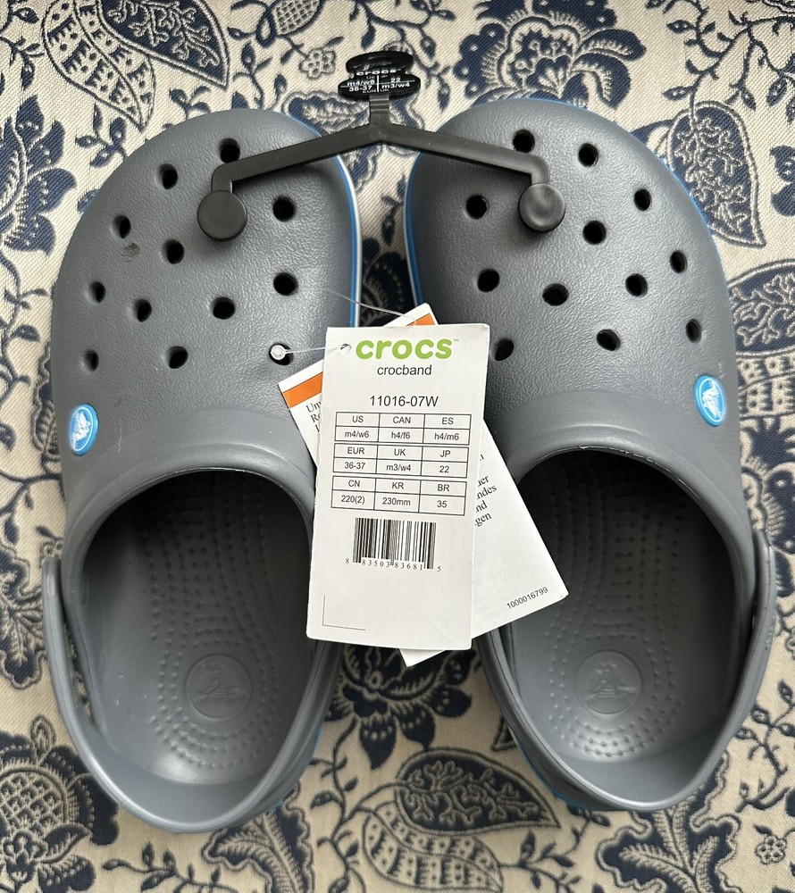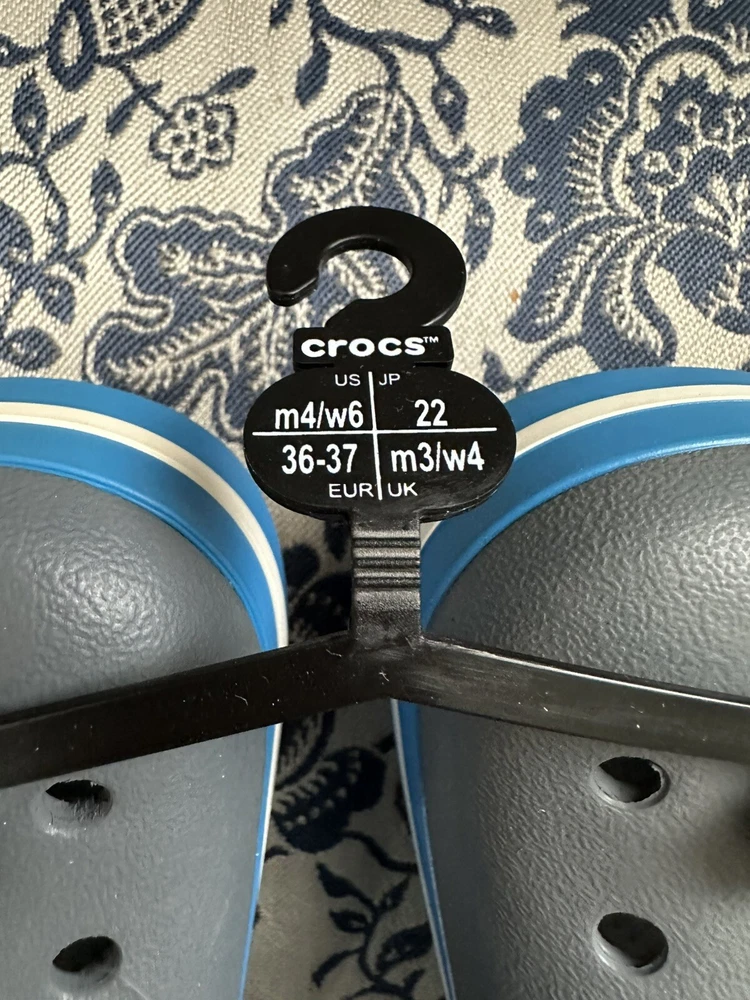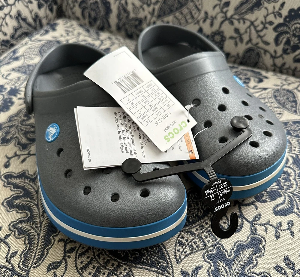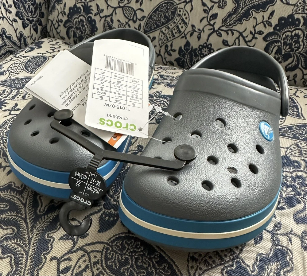 Crocband™ Clog Item # 11016 New with Tags, please see photos because there are some imperfections on the crocs Size: Women’s size 6 or Men’s size 4 | Big Kids Colors: Charcoal Gray & Ocean Blue Sporty. Stylish. Comfortable. The Crocband™ Collection features original Croslite™ foam construction for reliable cushioned comfort, a sporty design that’s easy to step into and out of, and a variety of energy-boosting colors and graphic designs. Show your stripes! Crocband™ Clog Details: Bold midsole stripe for a sporty look Easy to clean and quick to dry Ventilation ports for enhanced breathability Water-friendly and buoyant Fully molded Croslite™ material for lightweight cushioning and comfort Pivoting heel strap for a more secure fit Customizable with Jibbitz™ charms Iconic Crocs Comfort™: Lightweight. Flexible. 360-degree comfort.