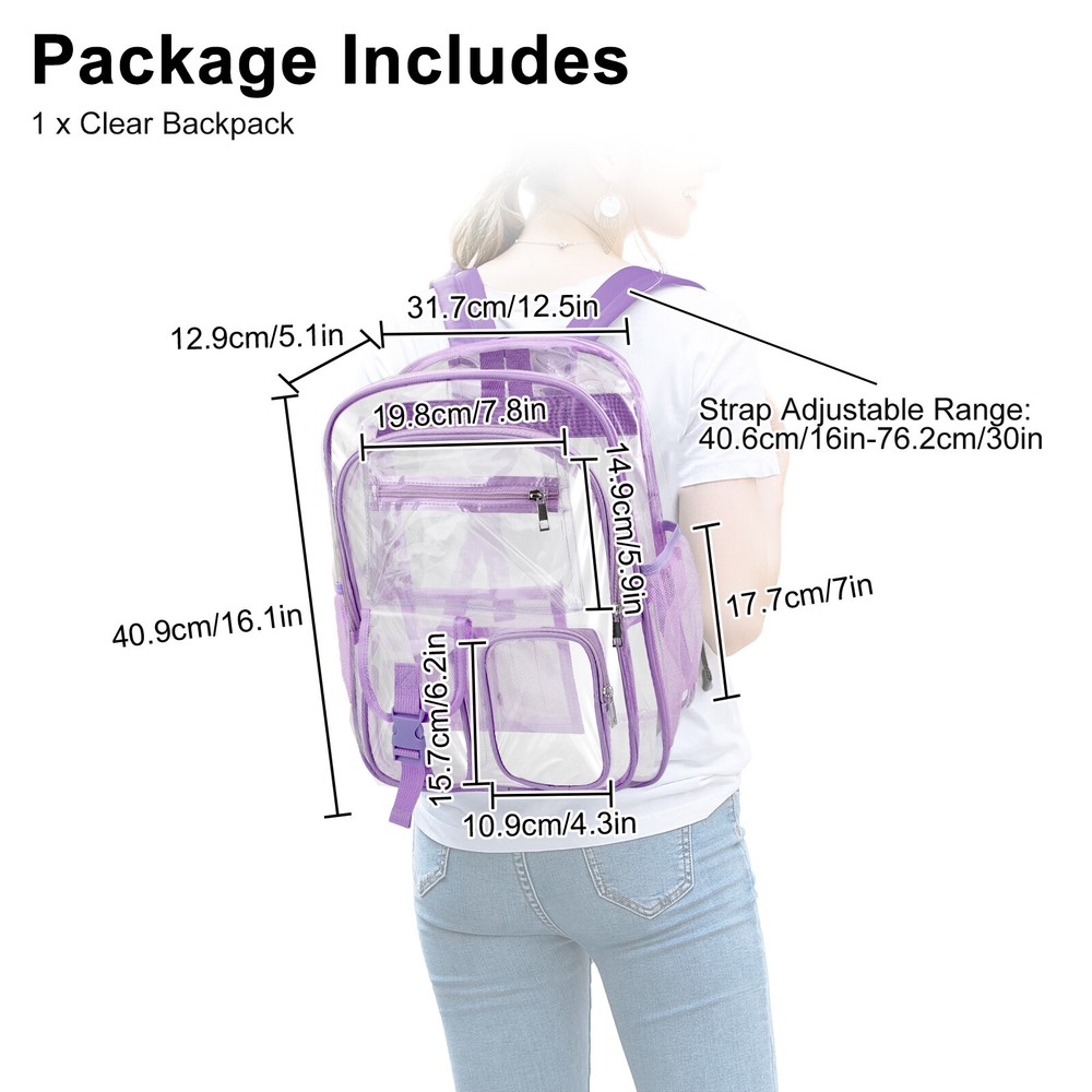 Product Description This waterproof clear backpack is crafted from heavy-duty materials, offering durability and security. Perfect for school, work, or events, it features a see-through design and spacious compartments for men and women. Product Feature π Clear PVC Material: thicker and smell-less, durable and sturdy. π Wide Shoulder Strap: can release the stress from heavy stuff. π Waterproof Fabric: protect inside items dry from rainy and snowy day. π Stadium Approved: suitable for sport event, traveling, concert, college, work. π 1 Large Main Double Zipper Pocket: for binders, laptops, books. π 1 Front Zipper Pocket: for book, phone, extra items. π 2 Small Front Zipper Pockets: for earphone, charger, pen, easy access. π 2 Side Mesh Pouches: for water bottles or folding umbrellas. Product Specification Type Clear Backpack Color Purple Bag Size 16.1 x 12.5 x 5.1" Strap Size can be adjusted from 16" to 30" Material PVC Package Included π1 x Waterproof Clear Backpack Location Descriptions To improve your buying experience and ensure fast delivery, Your order will be shipped from the warehouse located in either new jersey or california that is closest to your address. If you have any questions, Please contact us. Thank you for your support !