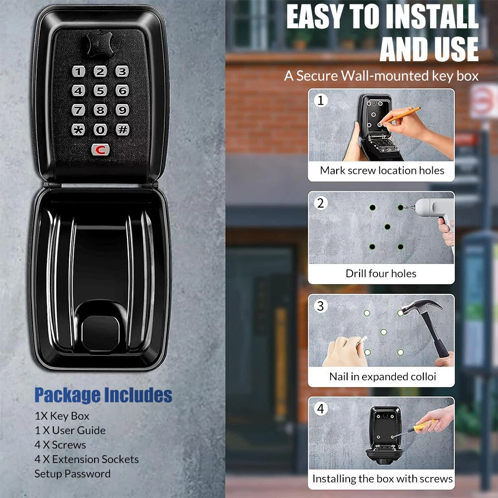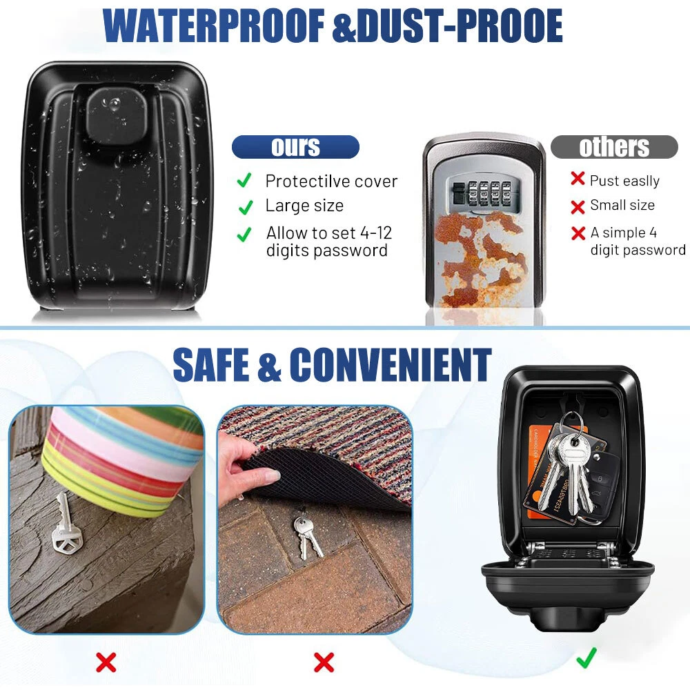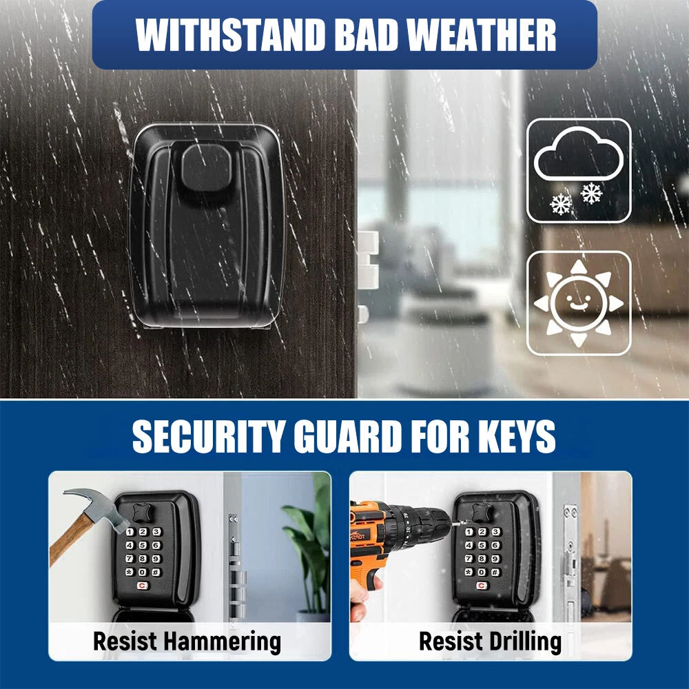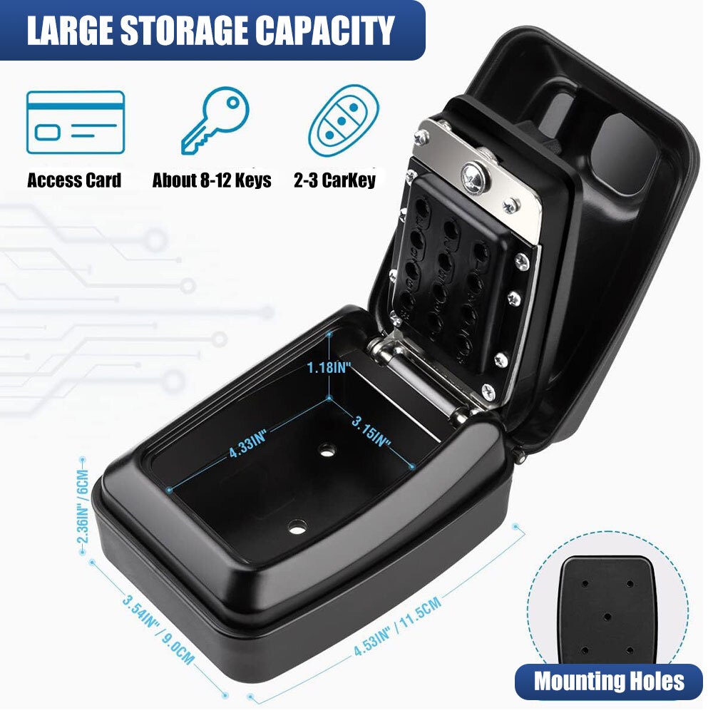 About this item 【Higher Security】 Key security lock box design with 12-digit combination, can provide you thousands of combinations to ensure the highest level of security.Easily reset the combination you want at any time. After setting a new password, it is recommended to take a photo or record it. Once you forget your password, you will no longer be able to use the keybox. 【Sturdy & Durable】The locklox for house keys is made of heavy-duty PVC, aluminum alloy and durable steel locking mechanism, which offers extra resistance for the key box wall mounted to hammering, sawing and prying. 【Waterproof Cover】The spare key hider lock box is equipped with a black cover, which can effectively protect the combination dial from dust, rain, snow, ice and other weather damage, making it last longer. 【Easy to Use】 This large key box is equipped with a detachable hook. You can fix it where you need, such as door handles, iron doors, fences, cars or anywhere. Locking buckles are suitable for most ball -shaped, biscuits and tulip -shaped door handle styles. There is no need to install tools, because you don't need to fix it on the wall, you can remove it at any time, just like an ordinary hanging lock. 【Wide Application】It’s a great value key lockbox with code for indoor and outdoor use, suitable for storage of keys, cards and jewelry, especially fit for fitness enthusiasts, travel enthusiasts, Airbnb and home rental host, care takers, home workers, roommates, ideal to share access to families and roommates. This high security lock box will be a wonderful gift for your family or friends. How to Set Password? Large Capacity Can hold your multiple keys and credit cards, etc., so you no longer worry about key security. Password High Security It offers up to 10,000 combination possibilities. It is more secure than wall-mounted 4-digit key cabinets. Hook Removable Simple operation will be able to remove the hook, convenient and labor-saving. With a Cancel Button C key is the cancellation button, the wrong password entered to backspace operation, convenient and quick.