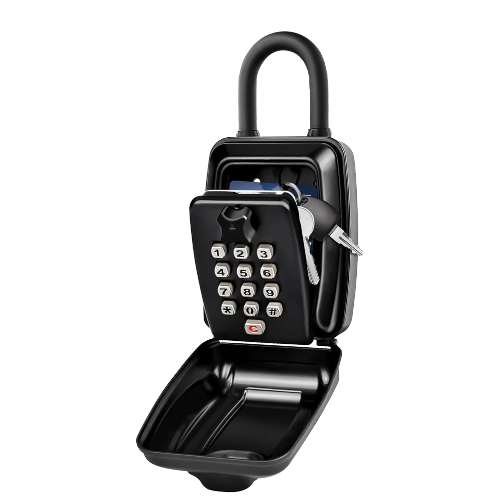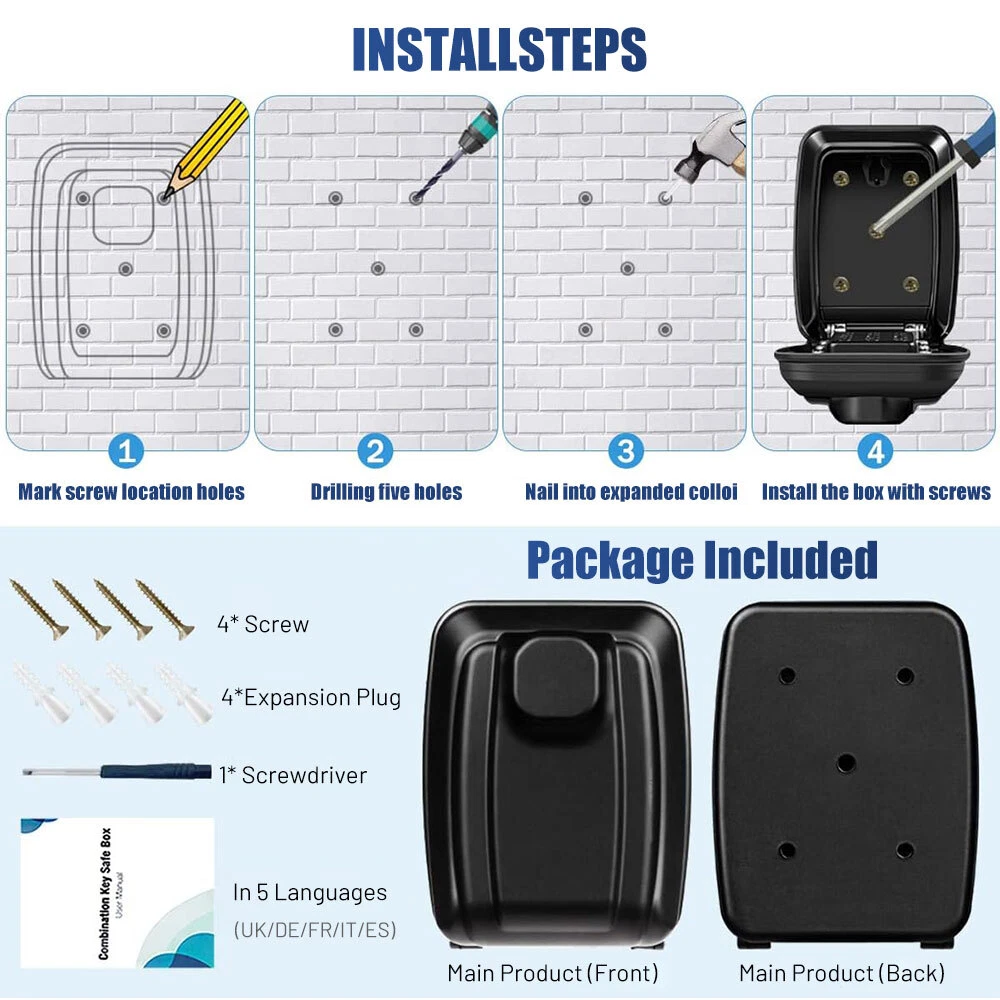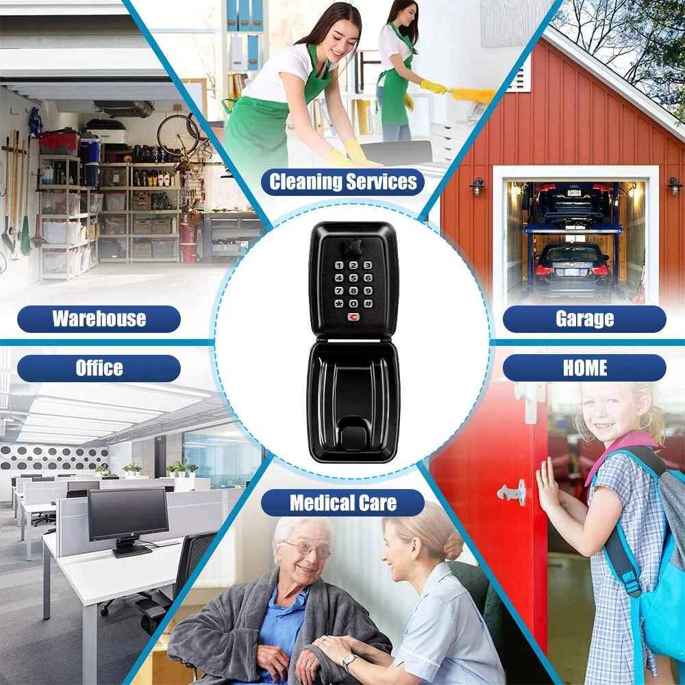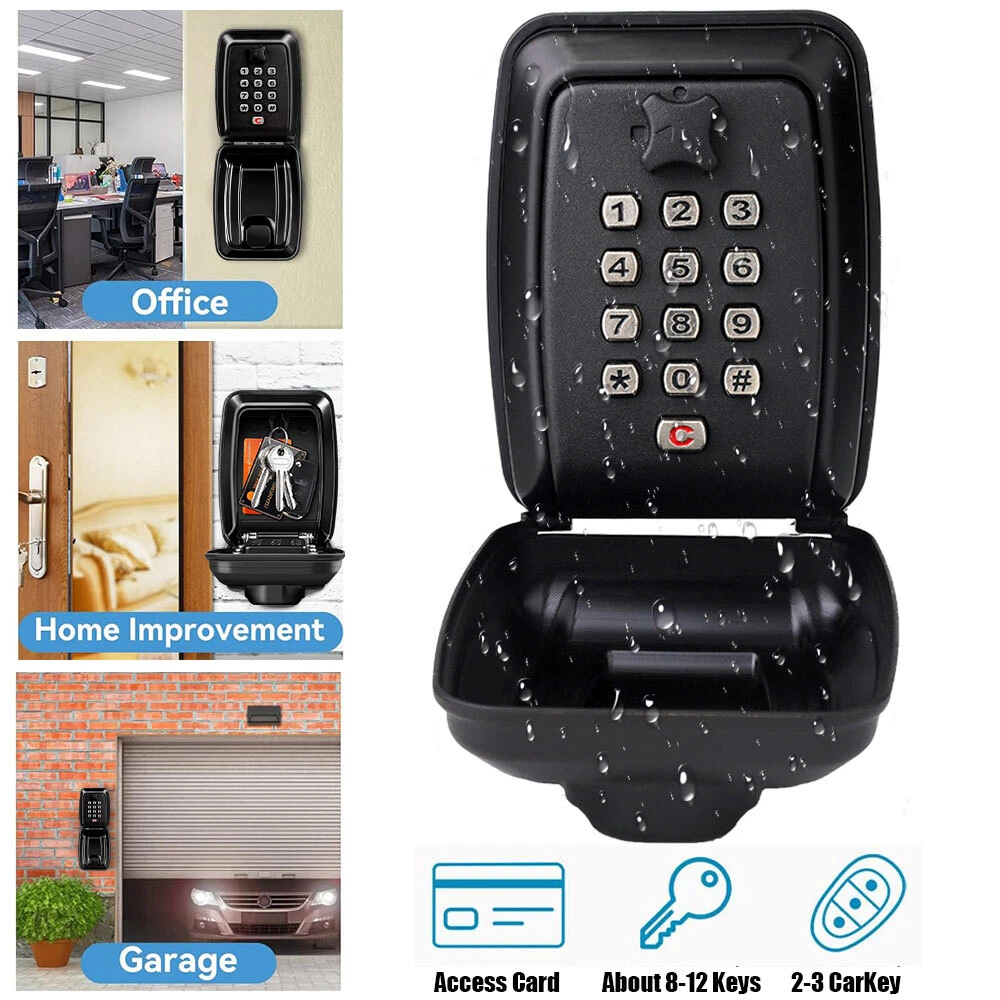 About this item 【Higher Security】 Key security lock box design with 12-digit combination, can provide you thousands of combinations to ensure the highest level of security.Easily reset the combination you want at any time. After setting a new password, it is recommended to take a photo or record it. Once you forget your password, you will no longer be able to use the keybox. 【Sturdy & Durable】The locklox for house keys is made of heavy-duty PVC, aluminum alloy and durable steel locking mechanism, which offers extra resistance for the key box wall mounted to hammering, sawing and prying. 【Waterproof Cover】The spare key hider lock box is equipped with a black cover, which can effectively protect the combination dial from dust, rain, snow, ice and other weather damage, making it last longer. 【Easy to Use】 This large key box is equipped with a detachable hook. You can fix it where you need, such as door handles, iron doors, fences, cars or anywhere. Locking buckles are suitable for most ball -shaped, biscuits and tulip -shaped door handle styles. There is no need to install tools, because you don't need to fix it on the wall, you can remove it at any time, just like an ordinary hanging lock. 【Wide Application】It’s a great value key lockbox with code for indoor and outdoor use, suitable for storage of keys, cards and jewelry, especially fit for fitness enthusiasts, travel enthusiasts, Airbnb and home rental host, care takers, home workers, roommates, ideal to share access to families and roommates. This high security lock box will be a wonderful gift for your family or friends. How to Set Password? Large Capacity Can hold your multiple keys and credit cards, etc., so you no longer worry about key security. Password High Security It offers up to 10,000 combination possibilities. It is more secure than wall-mounted 4-digit key cabinets. Hook Removable Simple operation will be able to remove the hook, convenient and labor-saving. With a Cancel Button C key is the cancellation button, the wrong password entered to backspace operation, convenient and quick.