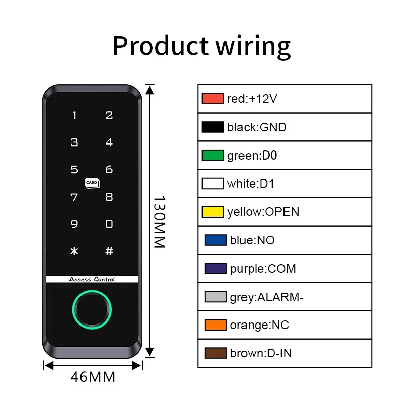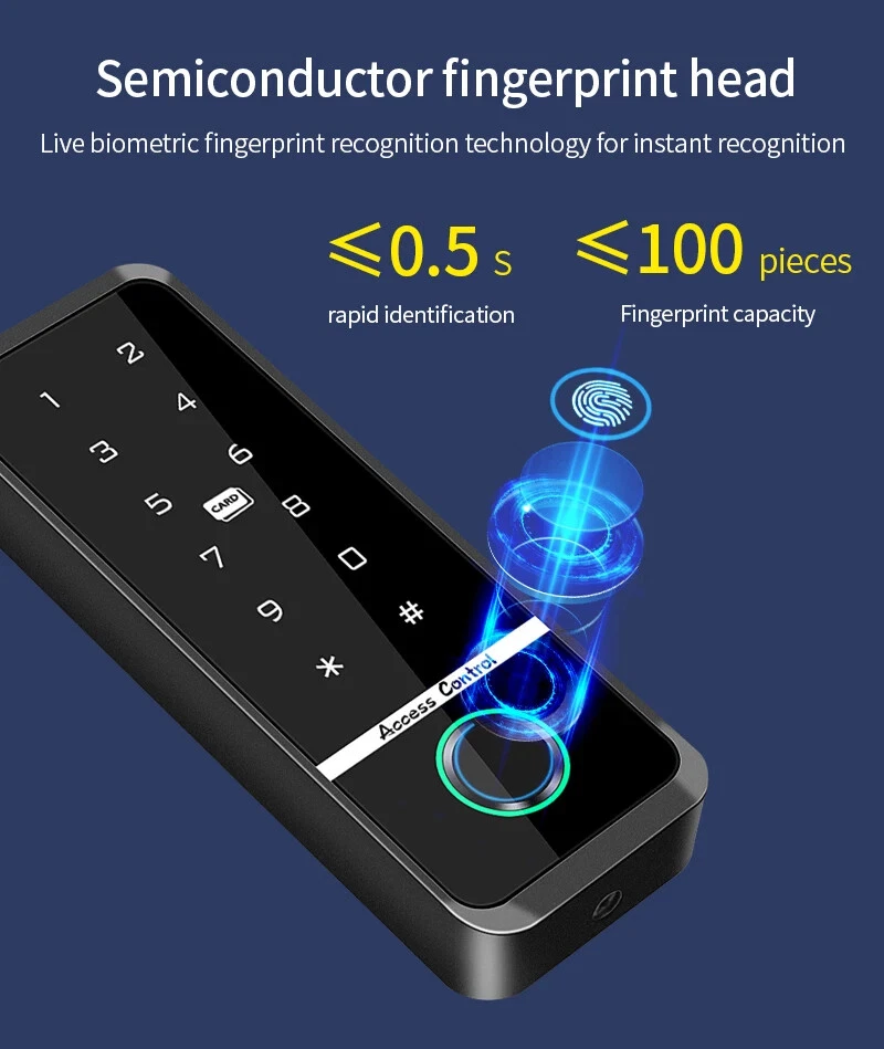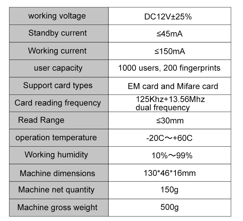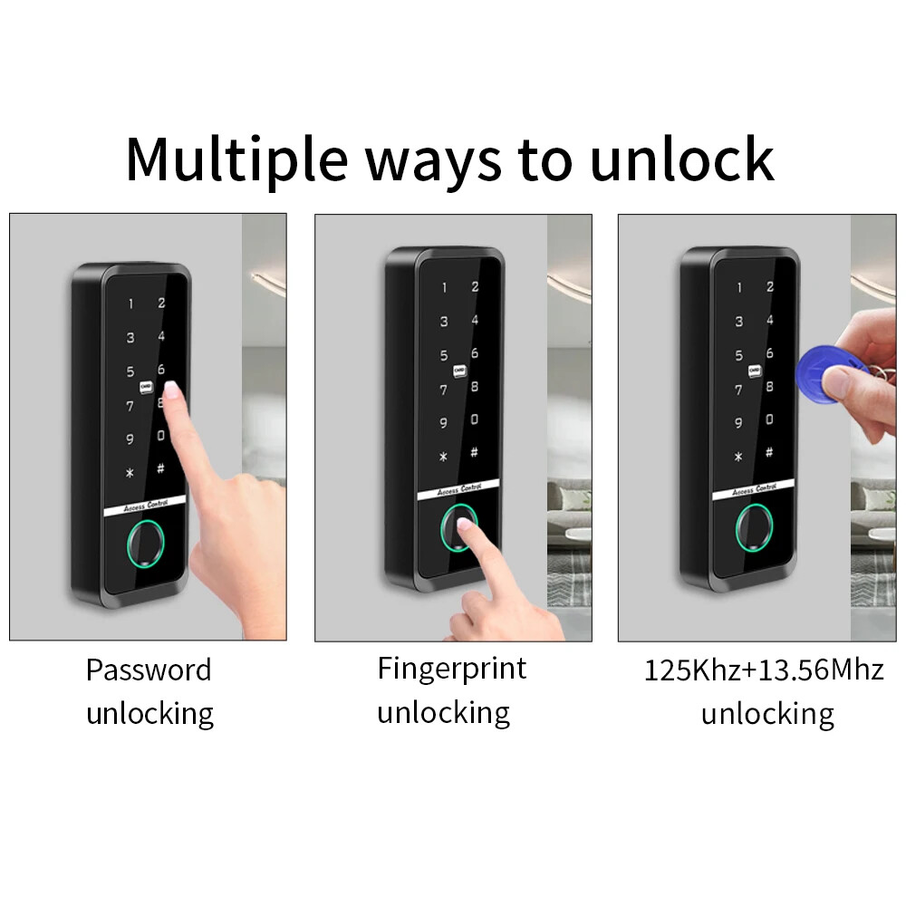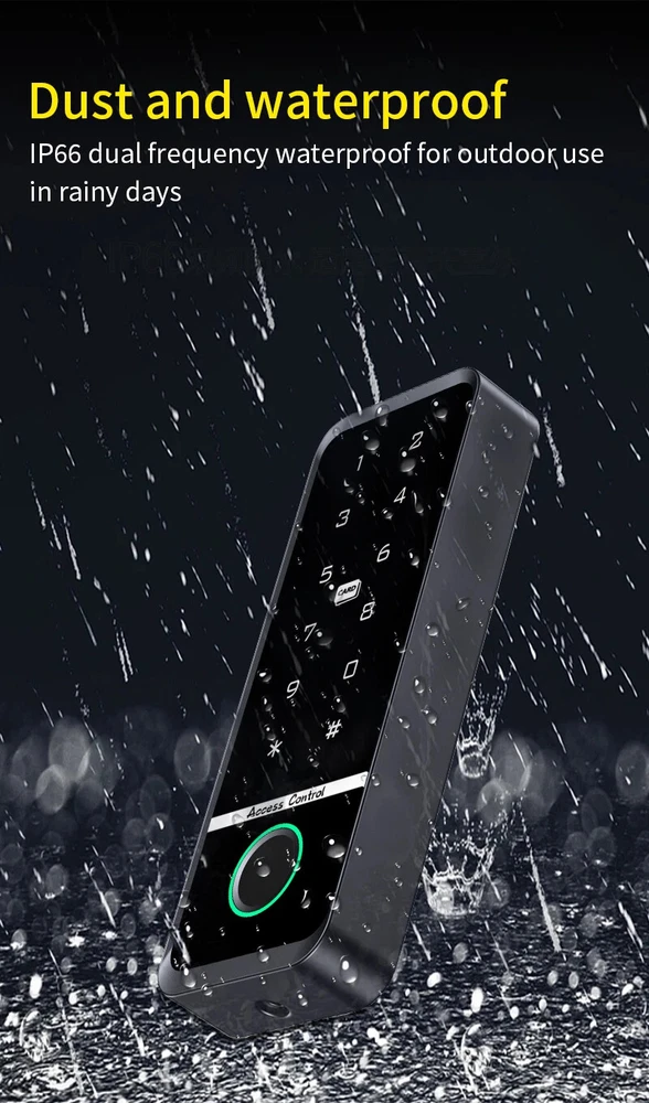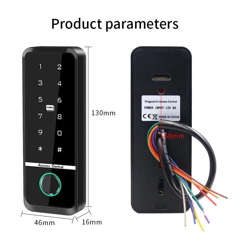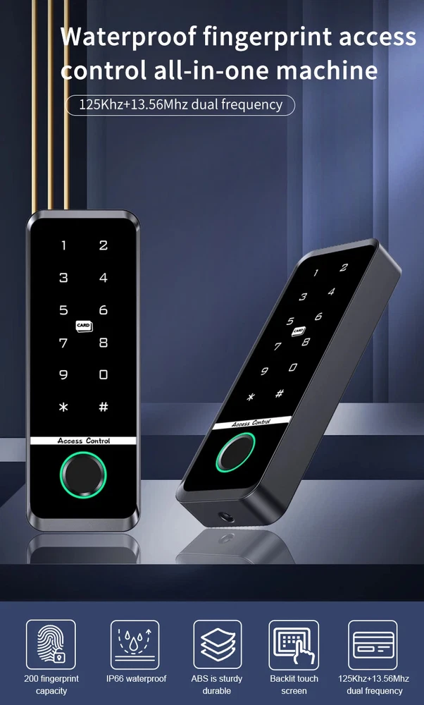 Outdoor Access Control Keypad System Kit Set Waterproof RFID 125KHz or 13.56MHz NFC Work with Electric Magnetic Lock Strike Lock Product Specification: Material: ABS High Quality Material Waterproof: Comforms to IP66 Panel: Touch Screen Panel Card Reading Distance: 0-10CM Identification Method: Fingerprint,Card, Password, Card + Password Combination Backlight: Blue Backlight Doorbell Button(Optional): Support Wired Doorbell Wiegand Signal: WG26/34 Output Can Set Management Card: Yes Working Voltage: DC12V Working Current: ≤ 30MA Door Opening Time: 0-99 Seconds Working Temperature: -20 ° C ~ 70 ° C Working Humidity: 20% ~ 90%