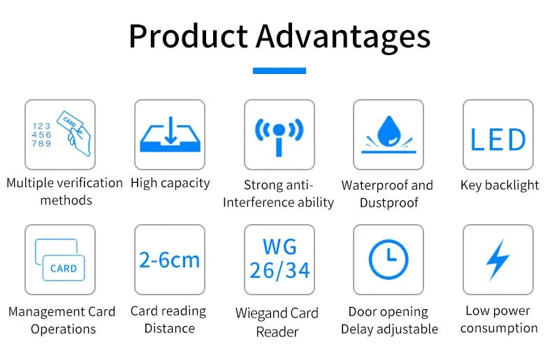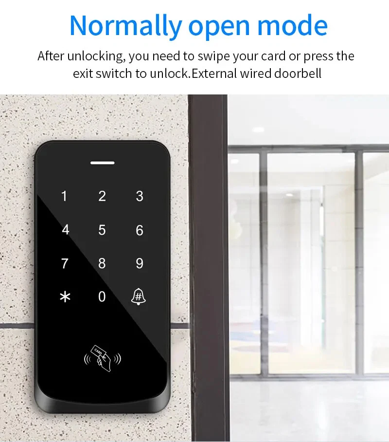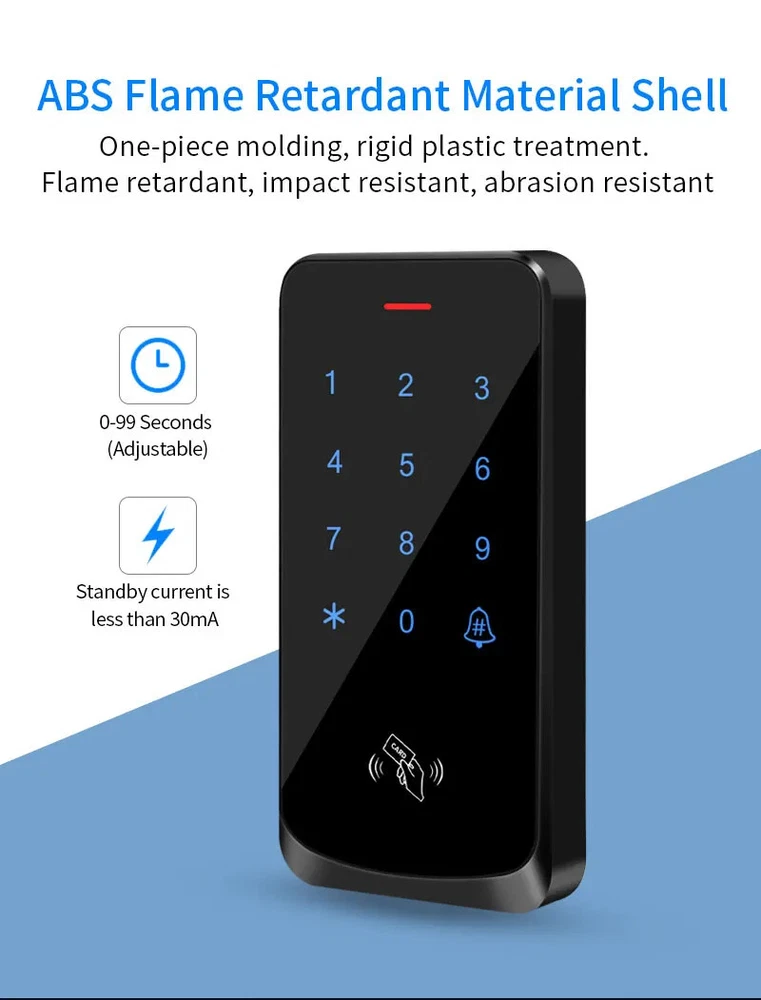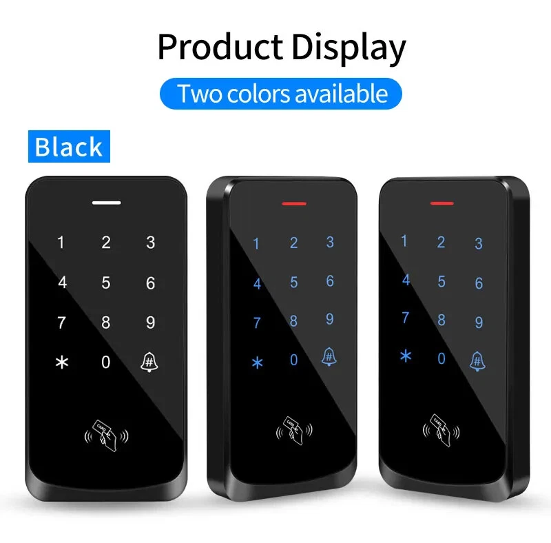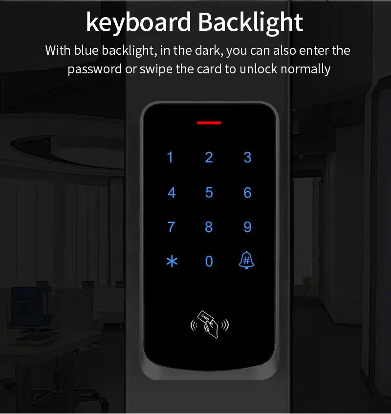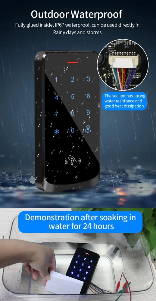 2000Users Access Control System IP67 Waterproof RFID EM Door Lock Opener Keypad Backlight Touch Screen Wiegand 26 34 Card Reader Product Parameter: User capacity: 2000 Users Material: ABS high quality material Panel: touch screen Backlight panel Working frequency: 125KHz Card reading type: support EM ID compatible card Card reading distance: 2-6CM Identification method: card & password & card + password Combined unlocking Backlight: blue backlight Waterproof function: IP67 waterproof Grade, can be installed outdoor Doorbell button: External wired doorbell Connection Wiegand signal: WG26/34 input/output management(Master) card: Support Working voltage: DC 12V Working current: ≤ 30mA Door Delay opening time: 0-99 seconds Working temperature: -40 ° C ~ 60 ° C Working Humidity: 10% ~ 90% Product size: 140*69*17mm ABS fire retardant material shell One-piece molding, hard plastic treatment. Fire retardant, impact resistant and wear resistant