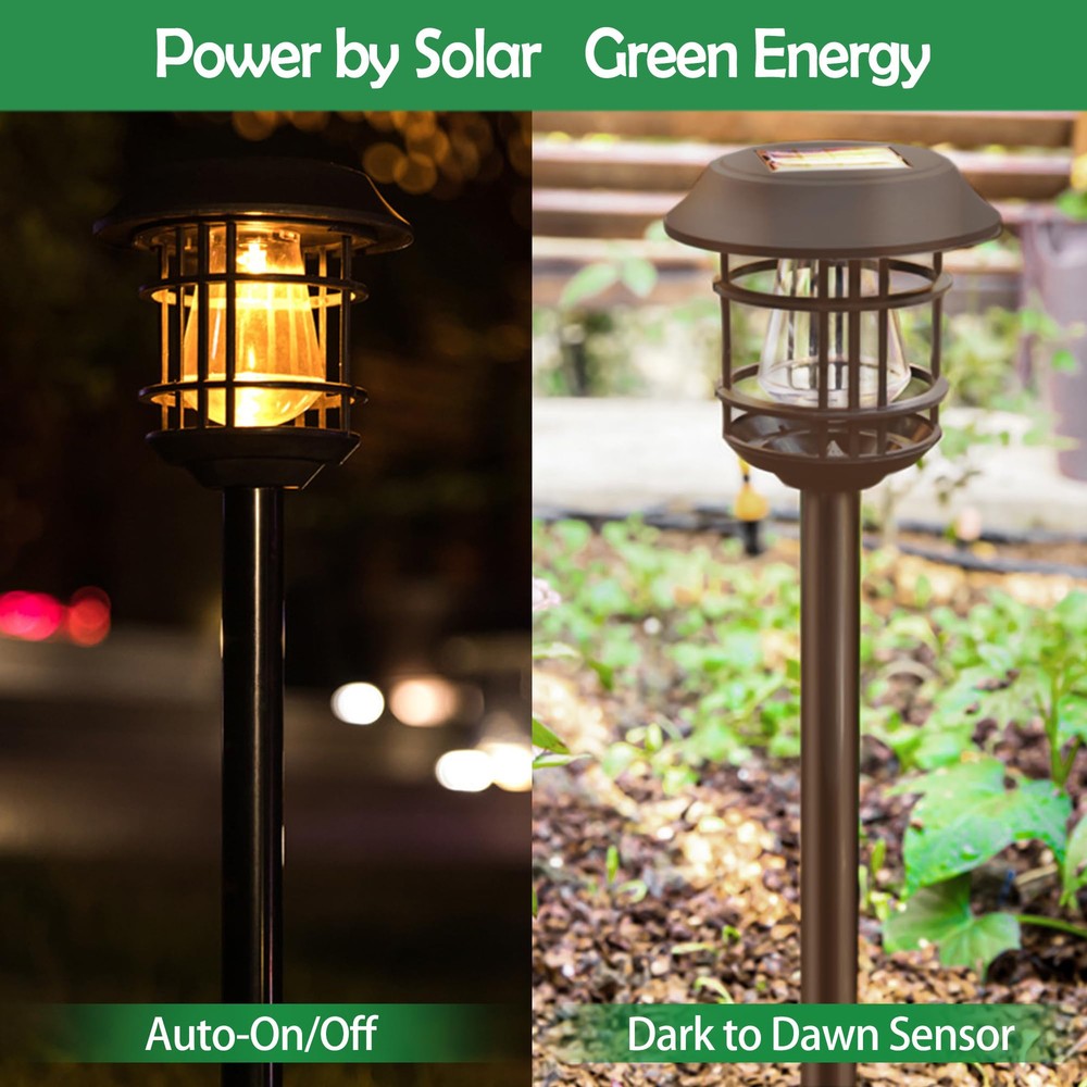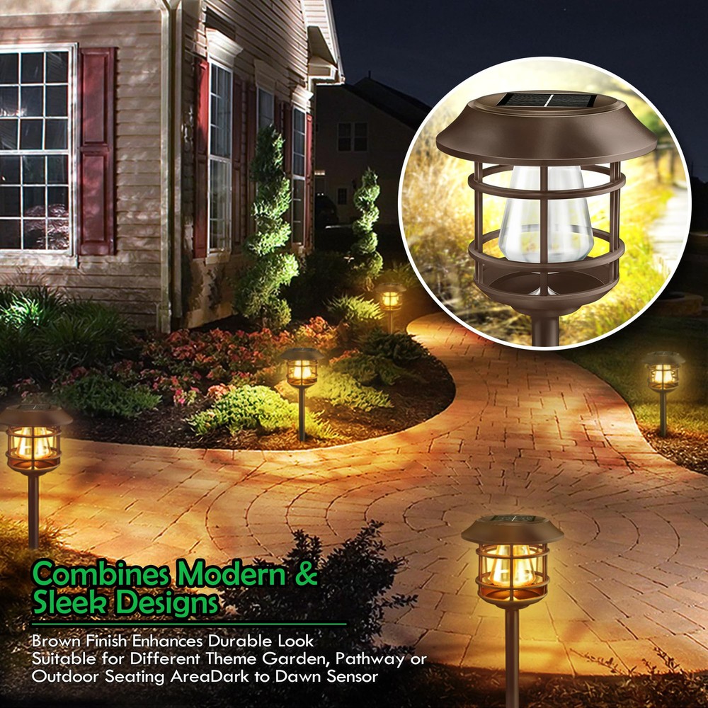 【Special Large LED Bulb Design and Unique Light Pattern】: Featured with a super bright LED and special bulb design, this solar lawn light will cast a stunning light pattern on the ground, 3 times brighter than standard solar garden lights. Illuminate your walkway, frame your garden, perfect for enhancing the ambiance of your front door, deck, lawn, backyard, pathway, driveway, patio, or garden. 【Warm Light, Auto On/Off from Dusk to Dawn】: The automatic solar-powered feature ensures it turns on at night and off at dawn, providing up to 10-12 hours of continuous lighting while saving on your electricity bills. Powered by solar, large batteries, no electricity needed, energy conservation. Green energy and environmental protection. 【1.96 Feet Taller and Larger Lights with Upgraded Solar Panel】: Made of premium material, combines modern and sleek designs, black finish/brown finish enhances durable look. Built to withstand all seasons, this solar pathway light boasts an upgraded solar panel and a 600mAh battery, significantly enhancing its light output. 【Wire-Free, Easy to Install and Use】: Say goodbye to complicated wiring with these solar lights. It can be placed anywhere as long as it receives sunlight. No outlets or tools required. Regardless of the outlet's location or distance, installation and usage are hassle-free. Simply assemble the stakes and insert it into the ground. 【Convenient and Safe】: Waterproof IP64, this outdoor solar pathway light is built to withstand various weather conditions and maintain optimal performance over an extended period. With Overcharge, over-discharge, over current protection, our solar light ensures safety while installing in your garden.