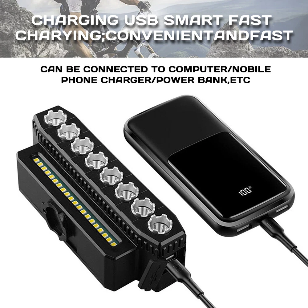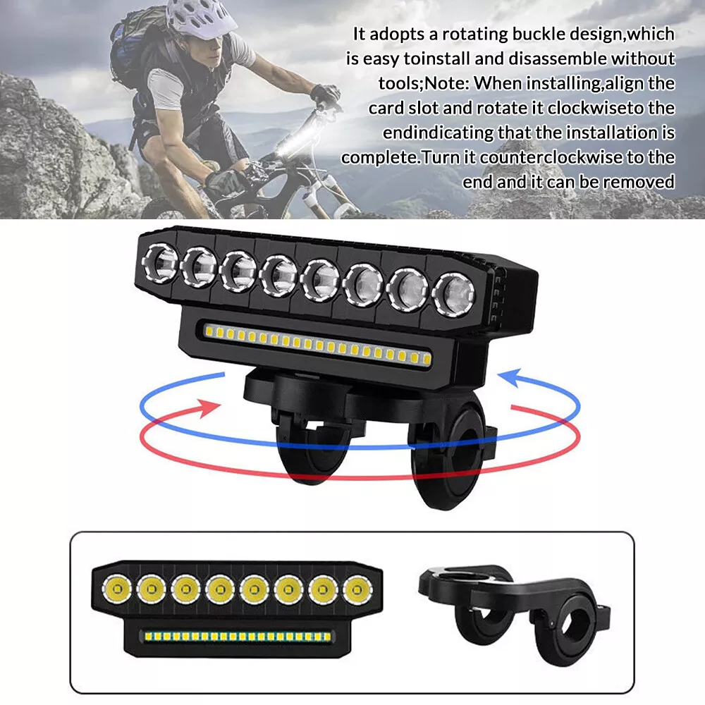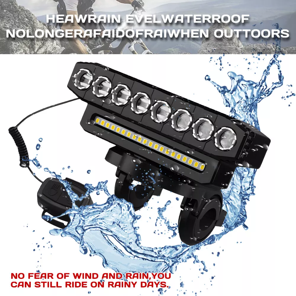 【 Super Bright 】Bike lights is very bright with the maximum output is 9500 lumens, the 8 led and 20 smd lights cover a wide range up to 800m,bike headlight allows you to ride at night to see wider and further areas, also makes your night riding safer. 【 Charging Input and Output 】In addition to the normal usb input rechargeable function,this bike headlight also has a USB output function.Bike light has a power bank function that can charge your phone.This is a very important when you are riding outdoors. 【 Multiple M odes 】6 lighting modes, which can adapt to different scenes. Besides being used as a bicycle light, you can also use it for camping, fishing, night work and activities,bike lights for night riding has a high decibel speaker, and equipped with a wired button switch, making your operation more convenient and safe 【 Waterproof and Durable 】Bike headlight made from high-quality materials, the bike lights are designed to withstand bike、bicycle、 riding、mountain cycling accessories,bike headlight with IP44 waterproof ratings, bicycle lights front and rear can handle rain, snow, and other outdoor elements. Specification: Beads: 8LED+20SMD Material: ABS Modes: 6 modes (8LED+20SMD full bright-8LED strong light-8LED weak light-8LED breathing light-20SMD strong light-8LED+20SMD burst flash) Charging mode: USB charging Battery capacity: 4000 mAh Waterproof: IP44 Speaker: 130db Product size: 138*40*51mm Package Included: 1 x Bicycle light 1 x Horn