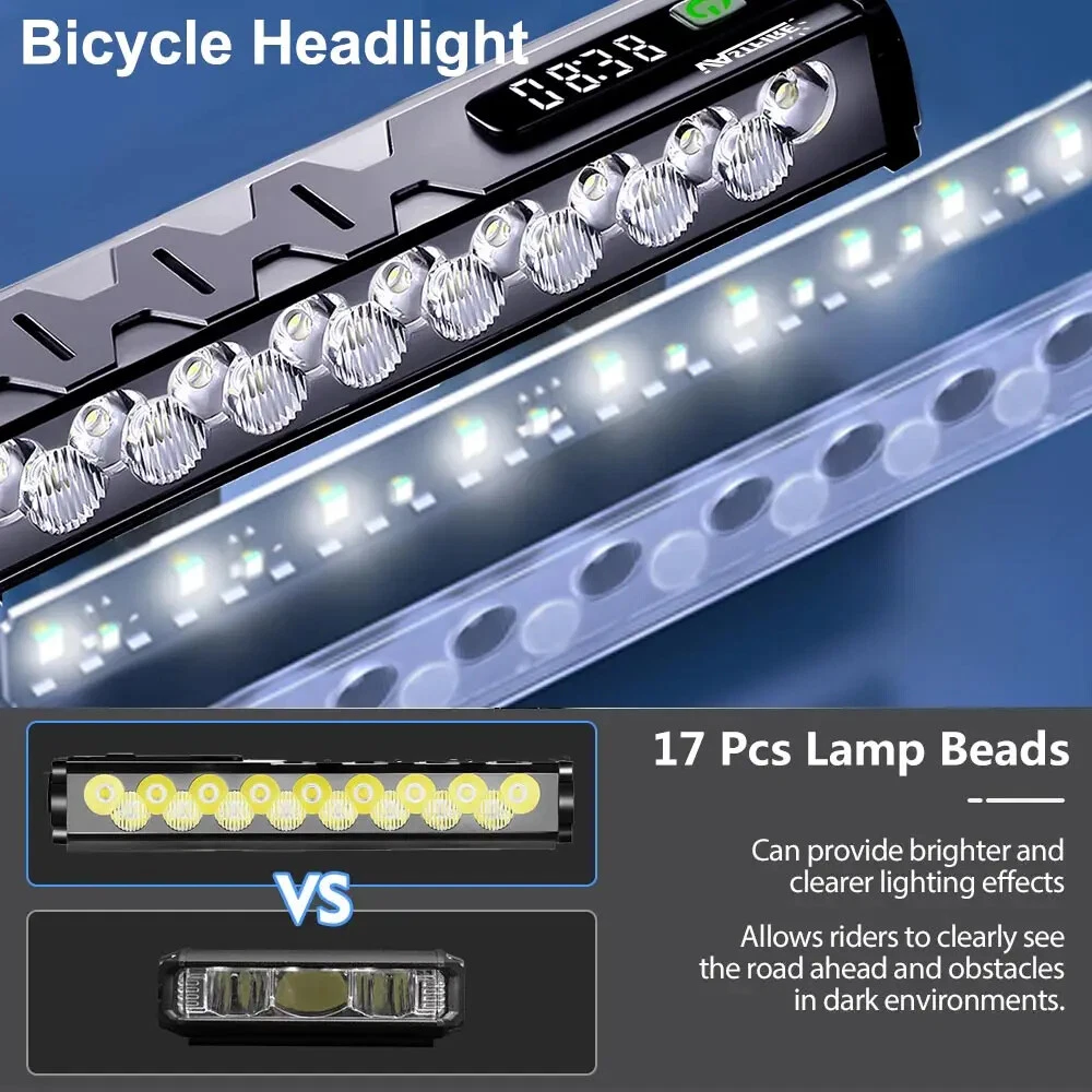 Specification: Material: aluminum + plastic Light color: white Product color: black Light Beads: 17*leds Mode: Flood 8 lights on - Spot 9 lights on - 17 lights on - 17 lights flashing Lumen: 25500LM Charging mode: Type-C charging Battery capacity: 10000 mAh Charging time: 5-7H Use time: 4.5-9H Voltage: 3.7V Waterproof: IP65 Net weight: 330g Size: 17*4.7*3cm Package A: 1*Bicycle headlight 1*Type-C charging cable 1*USB conversion head 1*Bracket