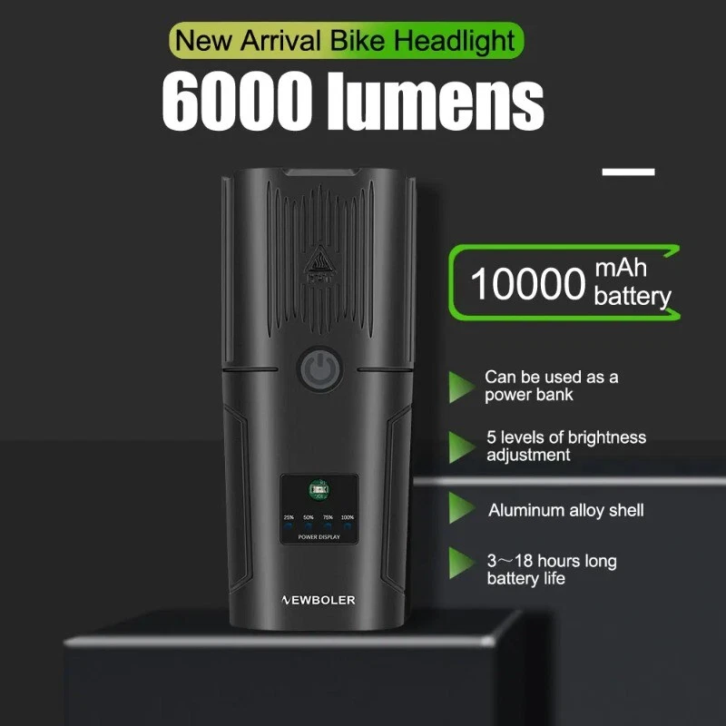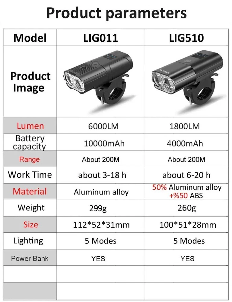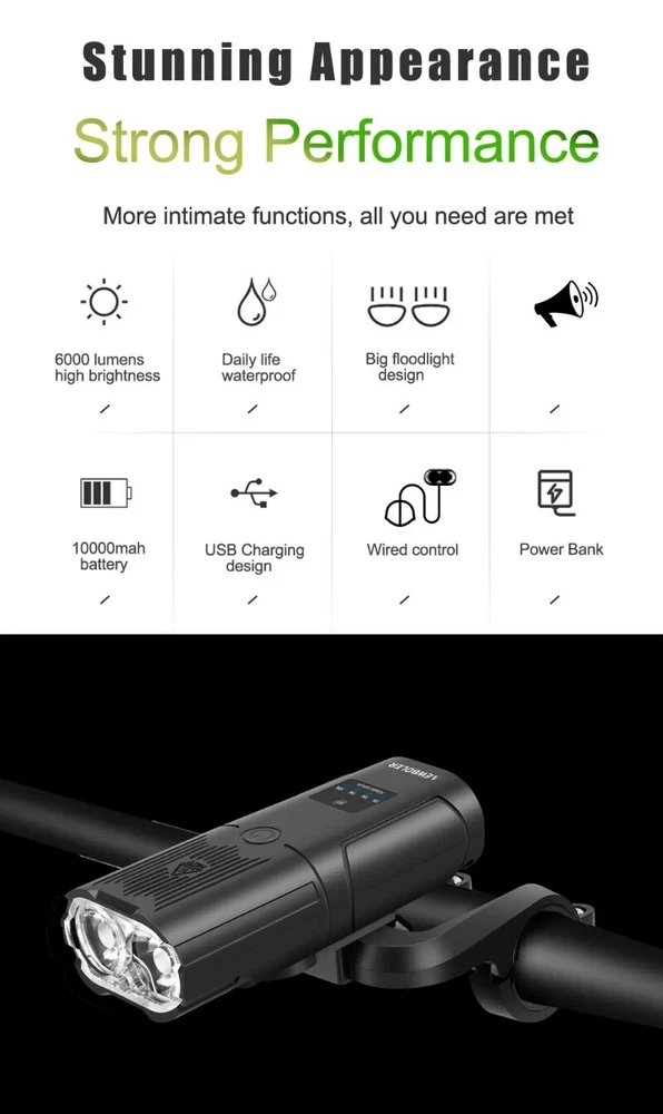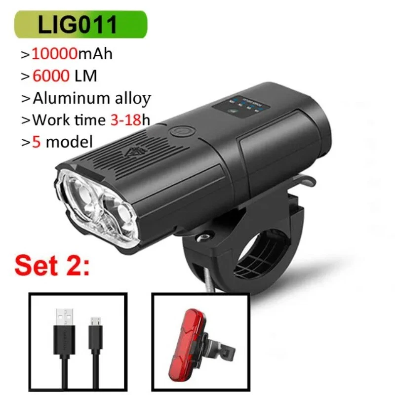 Note: The sales price in Colombia already includes the value-added tax. About Charging: Please use the charging cable included in the package to charge, otherwise it may cause damage to the lights. NOTE: This car light needs to be long pressed for more than 3 seconds to turn on. Clicking on it will not turn on the light Tips: 1. If you do not use it for a long time, please charge it every three months. 2. Do not shine into the eyes. Keep away from flammable and explosive materials. 3. Waterproof grade is IPX6. Do not immerse the bicycle light in water. 4. Place the bicycle lights correctly. Keep out of reach of children to avoid accidents. Product Features: 1. Not only a bicycle light, it's also a flashlight, and Power Bank, 2. Different indicator lights reflect different states 3. Aluminum alloy, good heat dissipation 4. Durable/Anti-Fall, Long Range 5. Built-in battery, USB Charging, Large capacity battery 6. Automatic power off after charging finish 7. High Brightness, Low energy consumption 8. Intelligent brightness adjustment It can be switched to intelligent mode with built-in light sensing chip, which automatically adjusts the brightness according to the intensity of the riding environment light, effectively saving power. Bright environments reduce brightness, while dark environments increase brightness Product Details: Model: LIG011 Material: Aluminum Alloy Mode:5 Modes Super Bright Singel/ Bright Full / Low / Flash/ Smart Waterproof: Daily Waterproof Lumen: About 6000Lumen Range: About 200-300M Battery: About 10000 mAh Charging Time: About 9 hrs Working hours: 3-18 hours Power Bank:Yes