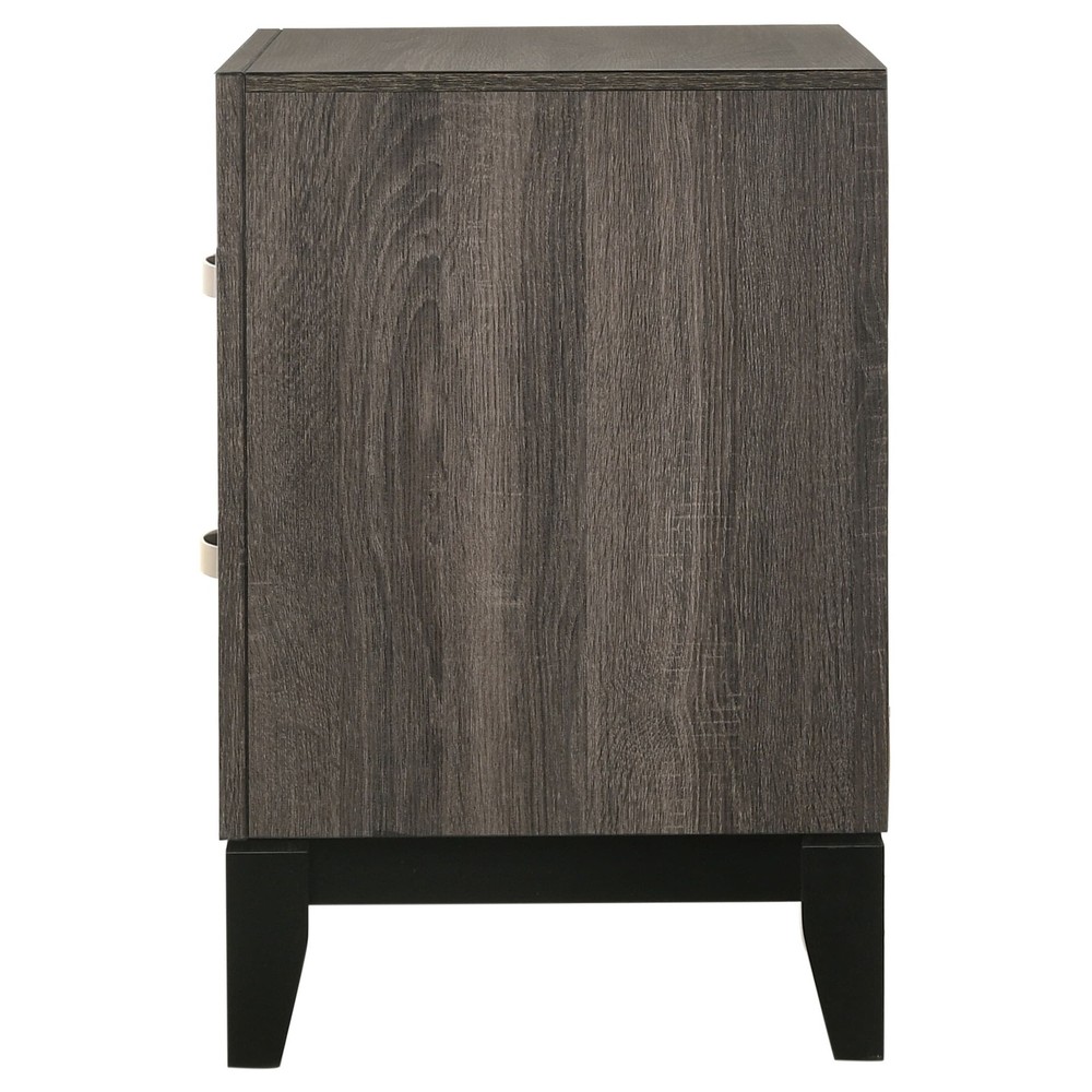 A contemporary take on mid-century modern design, the color blocking from this grey two-drawer nightstand sets it apart from the rest. Constructed of oak, the body showcases a light, exposed wood grain that oozes sophistication. Tapered legs in a black finish offer a modern feel, adding visual intrigue with neutral hues. Bright and metallic, light drawer pulls curve off the flat drawer fronts in a half moon shape. Complete a retro motif, or add fun flair to an up-to-date scheme.Item Contents:Includes: One (1) nightstandItem Bullets:Transitional style bedroom at a great valueNickel finished hardware highlights two-tone grey oak finishBlack grooves create a dimensional lookThree-dimensional engineered foil paper veneer in grey oak and blackEnglish dovetail drawer constructionBlack finish Free Shipping Over $49.99* Details Watson Transitional 2-drawer Nightstand Grey Oak Product Description: A contemporary take on mid-century modern design, the color blocking from this grey two-drawer nightstand sets it apart from the rest. Constructed of oak, the body showcases a light, exposed wood grain that oozes sophistication. Tapered legs in a black finish offer a modern feel, adding visual intrigue with neutral hues. Bright and metallic, light drawer pulls curve off the flat drawer fronts in a half moon shape. Complete a retro motif, or add fun flair to an up-to-date scheme. Item Contents: IncludesOne (1) nightstand Item Bullets: Transitional style bedroom at a great value Nickel finished hardware highlights two-tone grey oak finish Black grooves create a dimensional look Three-dimensional engineered foil paper veneer in grey oak and black English dovetail drawer construction Black finish legs are crafted of solid hardwood Materials: MaterialsAsian Hardwood, MDF, Paper Laminate, Particle Board (Pb) Features: Main FinishGrey Oak Weight Limit Overall300lbs Weight Limit Drawer45lbs Assembly TypePartial Assembly Required Dimensions: Nightstand dimensions23.5 inches wide x 16.25 inches deep x 24.75 inches high Accessories pictured are NOT included.