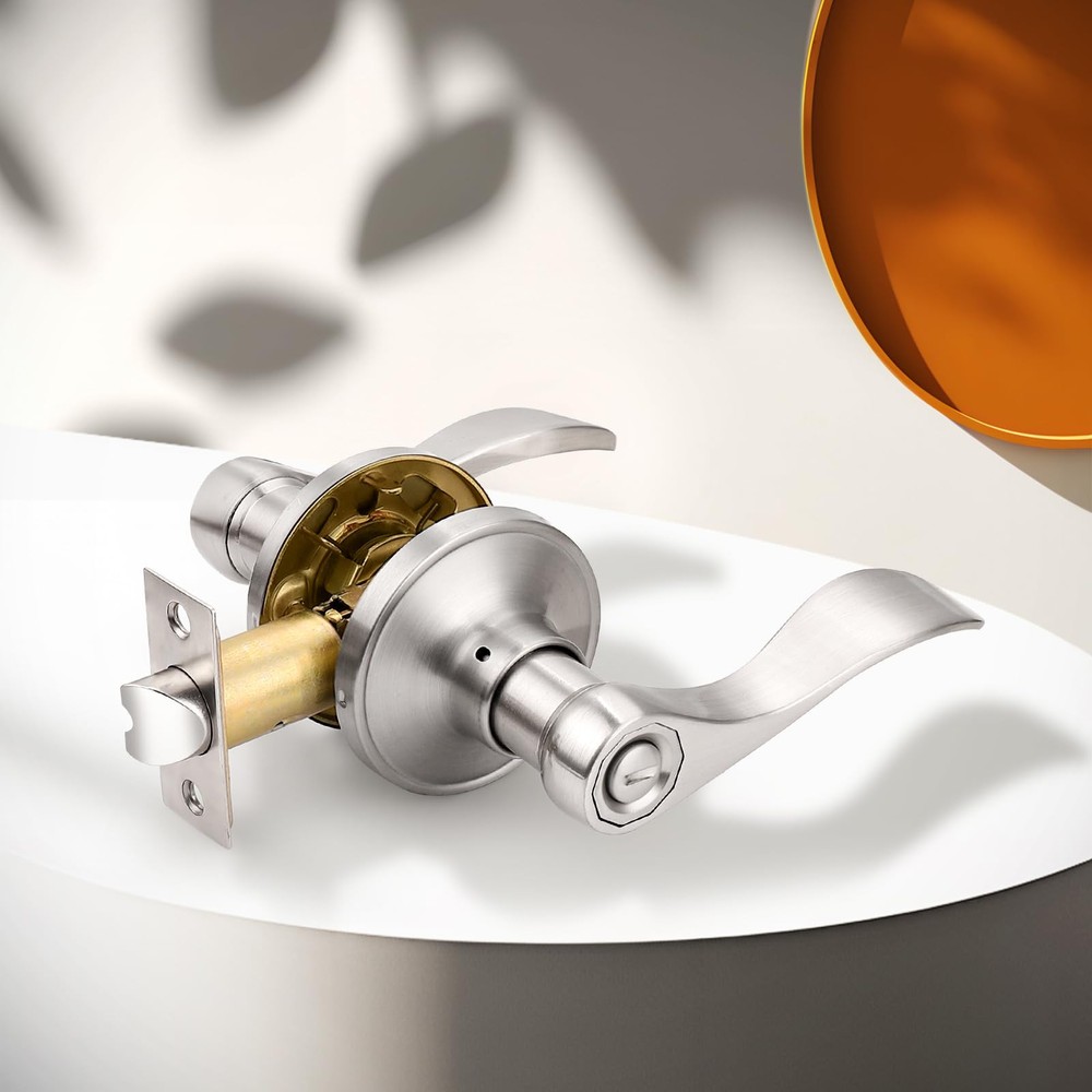 【Privacy】5 pack keyless privacy door lever for five doors. It could be locked/unlocked with the thumb-turn from inside or a emergency tool like a coin from outside. The privacy door handle is suitable for bathroom, bedroom or guest room where privacy is needed. 【Elegant Design】The brushed nickel door lever is exquisitely designed in a modern style. The wave shape provides a more comfortable gripping experience. High-quality zinc alloy makes the lever wear-resistant, corrosion-resistant, and durable. Confirmed with ANSI Grade 3, exceeds 250,000 cycles. 【Reversible Levers】The keyless door lever fits both right and left handed doors. The interior lever can be removed from the rosette and switched with the exterior lever. 【Dimensions】Lever Length: 4.7" (120mm); Rosette Diameter: 2.56" (65mm); Adjustable Backset: 2-3/8 inch or 2-3/4 inch (60mm or 70mm); Fits doors thickness: 1-3/8 inch to 1-3/4 inch (35mm to 45mm). The square plate of the latch is not removable. 【Easy Installation】The door handle can be easily installed in minutes with a screwdriver. The package includes all necessary accessories and the instruction can be as a template.