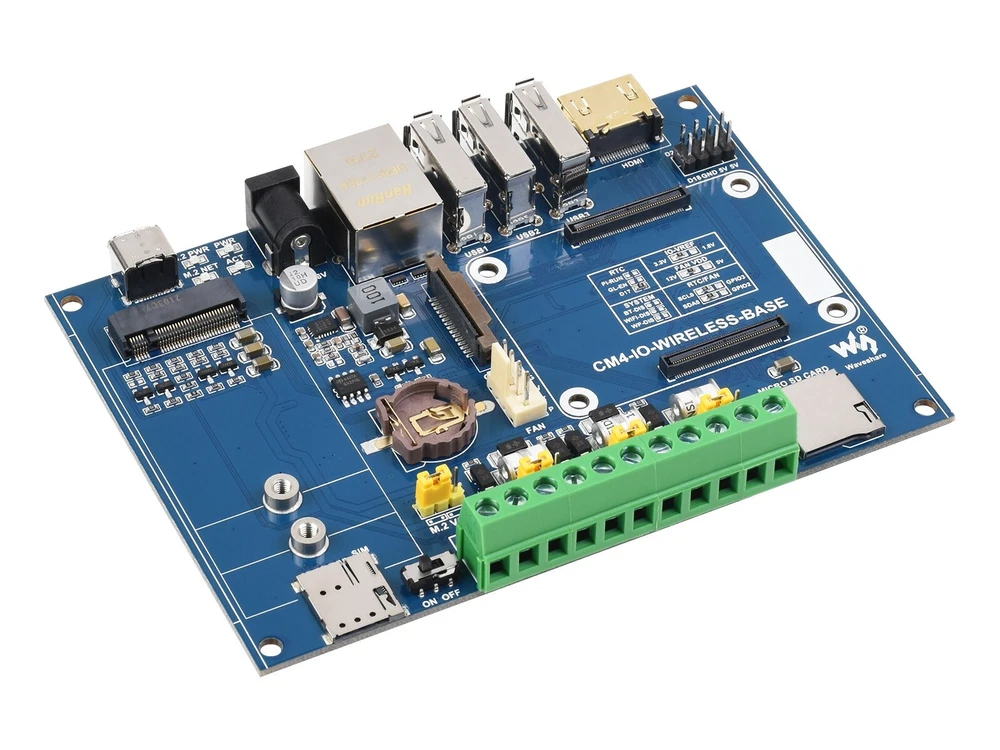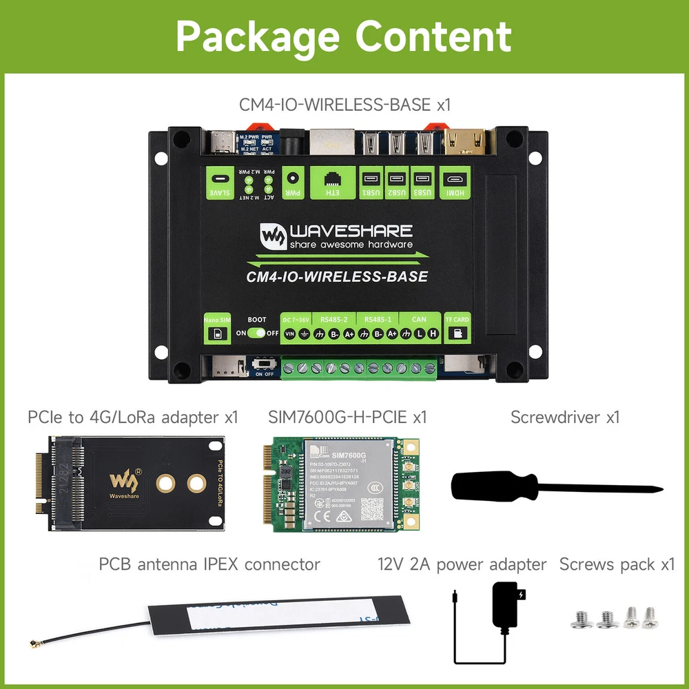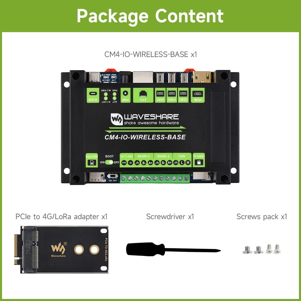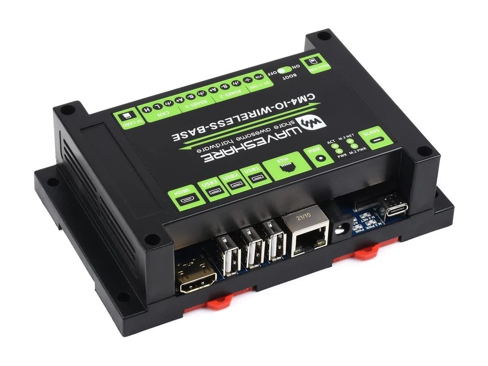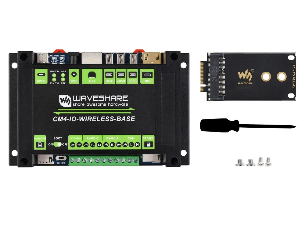 DESCRIPTION Industrial IoT Wireless Expansion Module Designed For Raspberry Pi Compute Module 4 Industrial IoT Module Based On CM4 Suitable For IoT Applications Like IoT Getaway, Wireless Router, Intelligent Data Acquisition... 4G/5G/LoRa Support, Multi Interfaces This is an industrial expansion module based on Raspberry Pi CM4, which features common interfaces such as Gigabit Ethernet, HDMI, USB, and GPIO, allows additional 4G / 5G / LoRa wireless communication modules to be connected via the M.2 or Mini-PCIe socket. There are also industrial interfaces/resources including RS485, CAN, and RTC. Combined with the industrial rail-mount protection case, the module is an ideal choice for building IoT gateway, 4G/5G router, IoT data acquisition, or even the PLC device in industrial automatic control system, and more. Part List Comparison BASIC KIT BASIC KIT + 4G MODULE CM4 wireless base board √ √ Black ABS case √ √ PCIe to 4G/LoRa adapter √ √ SIM7600G-H-PCIE 4G module √ PCB antenna √ * please refer to Package Content for exact part list info. Specifications CM4 SOCKET suitable for all variants of Compute Module 4 NETWORKING Gigabit Ethernet RJ45 M.2 B KEY / Mini-PCIe (via adapter), for connecting 5G / 4G / LoRa wireless module Nano-SIM card slot, supports standard Nano-SIM card for 5G/4G/3G/2G communication USB USB 2.0 × 3 PIN HEADER Non-isolated RS485 × 2, Non-isolated CAN × 1, Partial GPIO pins CAMERA MIPI CSI-2 × 1 (15pin 1.0mm FPC connector) VIDEO HDMI × 1, supports 4K 30fps output RTC Real-time clock with battery socket and ability to wake Compute Module 4 STORAGE MicroSD card socket for Compute Module 4 Lite (without eMMC) variants FAN HEADER 5V/12V, allows speed adjustment and measurement POWER INPUT 5V or 7~36V DIMENSIONS 145 × 90 × 40mm Comparing The Expansion Boards CM4 BASE BOARD INTERFACE COUNT AND SPECIFICATIONS POE GIGABIT ETH 40PIN GPIO PCIE USB① DSI HDMI CSI RTC FAN HEADER POWER INPUT FEATURES NANO A √ 2.0×1 ×1 5V CM4 sized NANO B ×1 √ 2.0×1 ×1 ×1 ×1 5V CM4 sized NANO C √ 2.0×1 ×1 ×1 ×1 5V Onboard Camera MINI BASE A ×1 √ M.2 M 2.0×4 ×1 ×2 ×2 5V 5V mini size MINI BASE B ×1 √ M.2 M 2.0×4 ×1 ×2 ×2 √ 5V 5V mini size MINI BASE C ×1 √ M.2 M 2.0×2 ×1 ×2 √ 5V 5V Dedicated 40PIN LCD Connector TOUCH SCREEN ×1 M.2 M 2.0×4 ×1 ×1 5V IPS screen MINI DUAL GIGABIT ×2 √ 2.0×1 5V SH1.0 5V dual ETH BINOCULAR CAMERA ×1 √ M.2 M 2.0×4 ×2 5V dual 8MP cameras 4CH RS485 ×1 2.0×2 ×1 ×2 ×1 5V 7-36V dual ETH WIFI6 DUAL ETH ×1 √ M.2 E 2.0×3 ×1 ×2 ×2 ×1 5/12V 7-36V WIFI6 dual ETH DUAL GIGABIT ETH ×2 √ 3.0×3 ×1 ×2 ×2 √ 5/12V 7-36V IOT DUAL GIGABIT ETH ×2 √ 3.0×2 ×1 ×2 ×2 √ 5/12V 5V 5G/4G support IOT BASE √ ×1 Gen2×1 2.0×2 ×2 ×2 ×2 √ 5/12V 7-36V 5G/4G support RS232 RS485 ADC POE BASE (B) √ ×1 √ Gen2×1 2.0×4 ×2 ×2 ×2 √ 5/12V 5V RS232 RS485 POE UPS BASE √ ×1 √ M.2 M 2.0×4 ×1 ×2 ×2 √ 5/12V 7-36V UPS POE BASE √ ×1 √ 3.0×4 ×2 ×2 ×2 √ 5/12V 7-36V RASPBERRY PI OFFICIAL ② ×1 √ Gen2×1 2.0×4 ×2 ×2 ×2 √ 12V 12V WIRELESS BASE ×1 M.2 B / Mini-PCIe 2.0×3 ×1 ×1 √ 5/12V 5V or 7-36V 5G/4G support RS485 CAN rail-mount UPS WIRELESS BASE ×1 M.2 B 2.0×3 ×1 ×1 √ 5/12V 5V or 7-36V With UPS 5G/4G support RS485 CAN rail-mount NAS MINI COMPUTER ×2 √ M.2 M×2/ Mini-PCIe 3.0×2 ×2 ×2 √ 5V dual M.2 M KEY slots 5″ TOUCH SCREEN ② ×1 √ M.2 M 2.0×4 ×1 ×2 √ 5/12V 5V 7″ ALL-IN-ONE ×1 M.2 M 2.0×4 used ×1 used √ 5/12V used 7-36V touch screen camera speaker 13.3″ ALL-IN-ONE ×1 2.0×2 12V HD touch screen 13.3″ MAGIC MIRROR ×1 2.0×2 12V HD screen, Speech Assistant NOTE ① USB 3.0 is equivalent to USB 3.2 Gen1 ② There's PoE header only on the Raspberry Pi official IO board without PoE circuit, that means additional PoE module is required for the official IO board to enable PoE feature. Unless otherwise specified, the PoE feature here stands for integrating 802.3af-compliant PoE circuit (5V/2.5A). Connecting With Compute Module 4 Standard CM4 Socket And Partial Raspberry Pi GPIO Header Suitable For Compute Module 4 Lite/EMMC Series Module 4G/5G/LoRa Wireless Modules Support Onboard M.2 Slot, Comes With Mini-PCIe Adapter As Well, Compatible With 4G/5G/LoRa Wireless Modules With M.2 Or Mini-PCIe Interface An additional communication module is required to enable 5G/4G/3G/2G cellular network or LoRa gateway function, recommended: SIM7600G-H-M.2 , SIM8202G-M2 , SIM8200EA-M2 , SIM7600G-H-PCIE , SX1302 868M LoRaWAN Gateway SIM7600G-H-PCIE 4G Module Optional 4G/3G/2G communication, GNSS positioning, global coverage Standard Mini-PCIe interface, high compatibility Multi-constellation high accuracy positioning GNSS receiver support Suitable for LTE, UMTS, and GSM network with global coverage Abundant software functions: OTA, LBS, TLS, VoLTE Up to 150Mbps (Max) downlink data rate and 50Mbps (Max) uplink data rate Supports popular OS driver: Windows, Linux, Android etc. AT commands of the SIM7600G-H-PCIE series are compatible with the SIM7500/SIM7600 series modules Please refer to SIM7600G-H-PCIE product page for details For quantity of 20pcs or more, other M.2 or Mini-PCIe modules are customizable (SIM7600CE-T / E-H / A-H, etc.), feel free to contact us Rich Interfaces Providing Interfaces Including: CSI / HDMI / USB / ETH / CAN / RS485 / M.2 B KEY Reserved Space For Heat Dissipation for reference ONLY, heatsink and cooling fan are NOT included. Rail-Mount Support Rail-Mount ABS Protection Case, Easy To Install, More Safe Operation Application Example Suitable For IoT Gateway, 4G/5G Router, IoT Data Acquisition And Monitoring, Industrial PLC, Or Other Industrial Applications for reference only, CM4, display are NOT included. What's On Board CM4 socket suitable for all variants of Compute Module 4 HDMI connector supports 4K 30fps output USB 2.0 ports 3x USB 2.0, for connecting sorts of USB devices RJ45 Gigabit Ethernet 10/100/1000M compatible DC power
