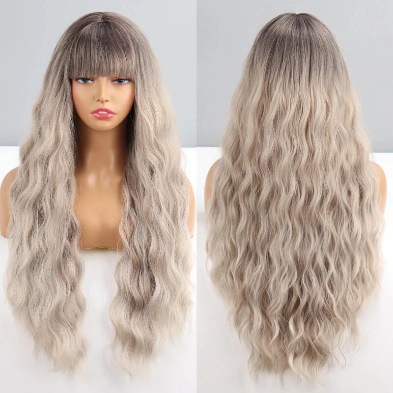 Wavy Long Ombre Grey Blonde Synthetic Curly Cosplay Wig with Bangs