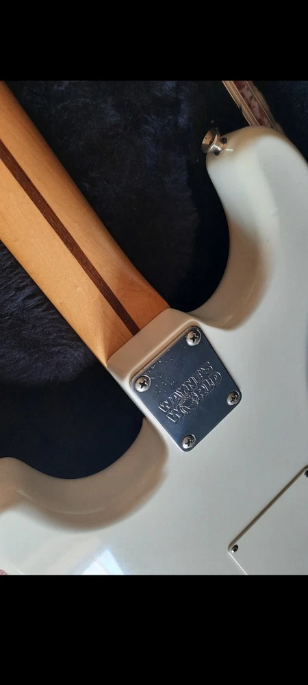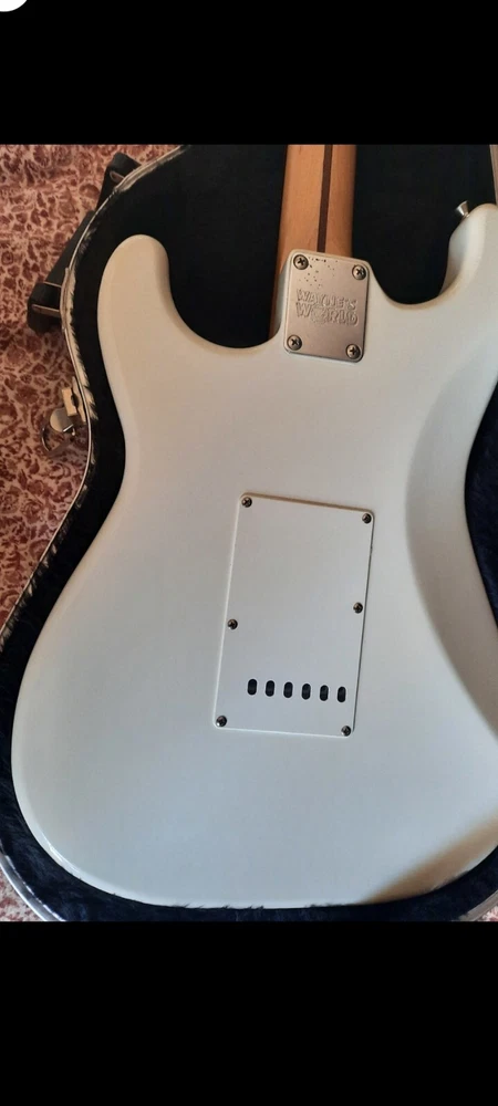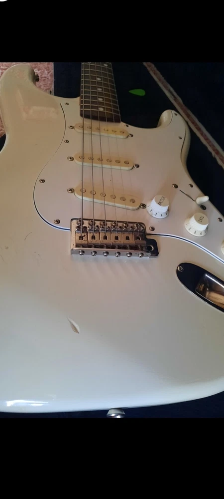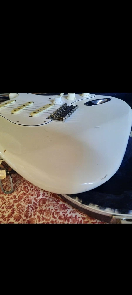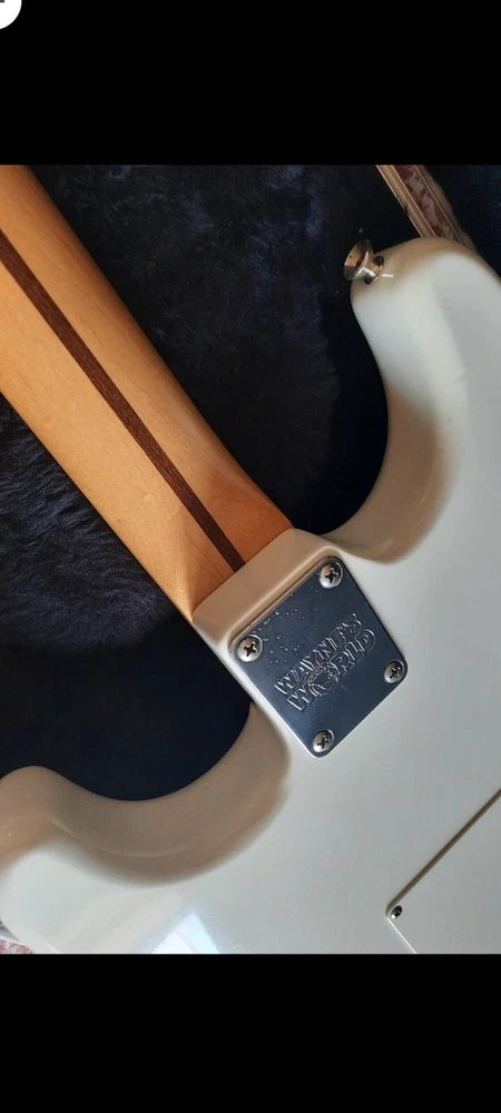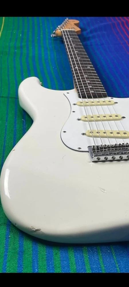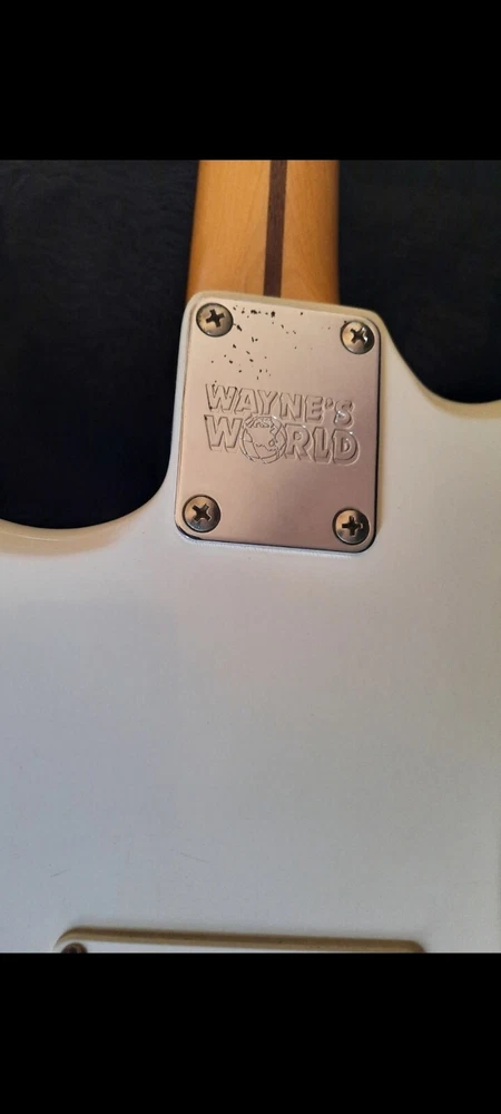 The "Wayne's World Fender Squier 92-93" is a professional-level electric guitar with a solid white body. This 6-string guitar is a model from 1993 and was manufactured in Japan. It features a right-handed configuration and is a part of the Fender Squier brand. The guitar is likely a limited edition model inspired by the movie "Wayne's World," known for its distinctive design and potentially collectible status. Party on.